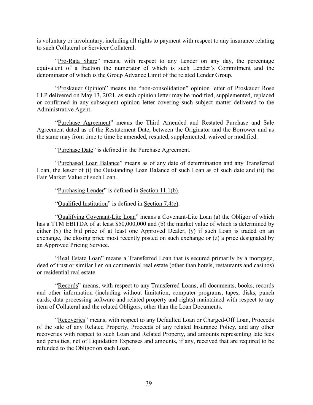 is voluntary or involuntary, including all rights to payment with respect to any insurance relating to such Collateral or Servicer Collateral. “Pro-Rata Share” means, with respect to any Lender on any day, the percentage equivalent of a fraction the numerator of which is such Lender’s Commitment and the denominator of which is the Group Advance Limit of the related Lender Group. “Proskauer Opinion” means the “non-consolidation” opinion letter of Proskauer Rose LLP delivered on May 13, 2021, as such opinion letter may be modified, supplemented, replaced or confirmed in any subsequent opinion letter covering such subject matter delivered to the Administrative Agent. “Purchase Agreement” means the Third Amended and Restated Purchase and Sale Agreement dated as of the Restatement Date, between the Originator and the Borrower and as the same may from time to time be amended, restated, supplemented, waived or modified. “Purchase Date” is defined in the Purchase Agreement. “Purchased Loan Balance” means as of any date of determination and any Transferred Loan, the lesser of (i) the Outstanding Loan Balance of such Loan as of such date and (ii) the Fair Market Value of such Loan. “Purchasing Lender” is defined in Section 11.1(b). “Qualified Institution” is defined in Section 7.4(e). “Qualifying Covenant-Lite Loan” means a Covenant-Lite Loan (a) the Obligor of which has a TTM EBITDA of at least $50,000,000 and (b) the market value of which is determined by either (x) the bid price of at least one Approved Dealer, (y) if such Loan is traded on an exchange, the closing price most recently posted on such exchange or (z) a price designated by an Approved Pricing Service. “Real Estate Loan” means a Transferred Loan that is secured primarily by a mortgage, deed of trust or similar lien on commercial real estate (other than hotels, restaurants and casinos) or residential real estate. “Records” means, with respect to any Transferred Loans, all documents, books, records and other information (including without limitation, computer programs, tapes, disks, punch cards, data processing software and related property and rights) maintained with respect to any item of Collateral and the related Obligors, other than the Loan Documents. “Recoveries” means, with respect to any Defaulted Loan or Charged-Off Loan, Proceeds of the sale of any Related Property, Proceeds of any related Insurance Policy, and any other recoveries with respect to such Loan and Related Property, and amounts representing late fees and penalties, net of Liquidation Expenses and amounts, if any, received that are required to be refunded to the Obligor on such Loan. 39