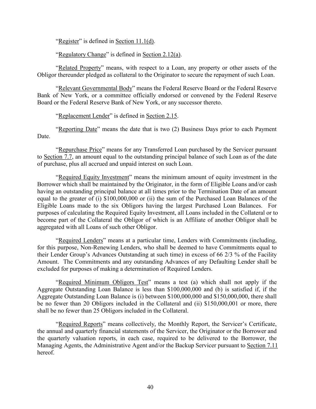 “Register” is defined in Section 11.1(d). “Regulatory Change” is defined in Section 2.12(a). “Related Property” means, with respect to a Loan, any property or other assets of the Obligor thereunder pledged as collateral to the Originator to secure the repayment of such Loan. “Relevant Governmental Body” means the Federal Reserve Board or the Federal Reserve Bank of New York, or a committee officially endorsed or convened by the Federal Reserve Board or the Federal Reserve Bank of New York, or any successor thereto. “Replacement Lender” is defined in Section 2.15. “Reporting Date” means the date that is two (2) Business Days prior to each Payment Date. “Repurchase Price” means for any Transferred Loan purchased by the Servicer pursuant to Section 7.7, an amount equal to the outstanding principal balance of such Loan as of the date of purchase, plus all accrued and unpaid interest on such Loan. “Required Equity Investment” means the minimum amount of equity investment in the Borrower which shall be maintained by the Originator, in the form of Eligible Loans and/or cash having an outstanding principal balance at all times prior to the Termination Date of an amount equal to the greater of (i) $100,000,000 or (ii) the sum of the Purchased Loan Balances of the Eligible Loans made to the six Obligors having the largest Purchased Loan Balances. For purposes of calculating the Required Equity Investment, all Loans included in the Collateral or to become part of the Collateral the Obligor of which is an Affiliate of another Obligor shall be aggregated with all Loans of such other Obligor. “Required Lenders” means at a particular time, Lenders with Commitments (including, for this purpose, Non-Renewing Lenders, who shall be deemed to have Commitments equal to their Lender Group’s Advances Outstanding at such time) in excess of 66 2/3 % of the Facility Amount. The Commitments and any outstanding Advances of any Defaulting Lender shall be excluded for purposes of making a determination of Required Lenders. “Required Minimum Obligors Test” means a test (a) which shall not apply if the Aggregate Outstanding Loan Balance is less than $100,000,000 and (b) is satisfied if, if the Aggregate Outstanding Loan Balance is (i) between $100,000,000 and $150,000,000, there shall be no fewer than 20 Obligors included in the Collateral and (ii) $150,000,001 or more, there shall be no fewer than 25 Obligors included in the Collateral. “Required Reports” means collectively, the Monthly Report, the Servicer’s Certificate, the annual and quarterly financial statements of the Servicer, the Originator or the Borrower and the quarterly valuation reports, in each case, required to be delivered to the Borrower, the Managing Agents, the Administrative Agent and/or the Backup Servicer pursuant to Section 7.11 hereof. 40
