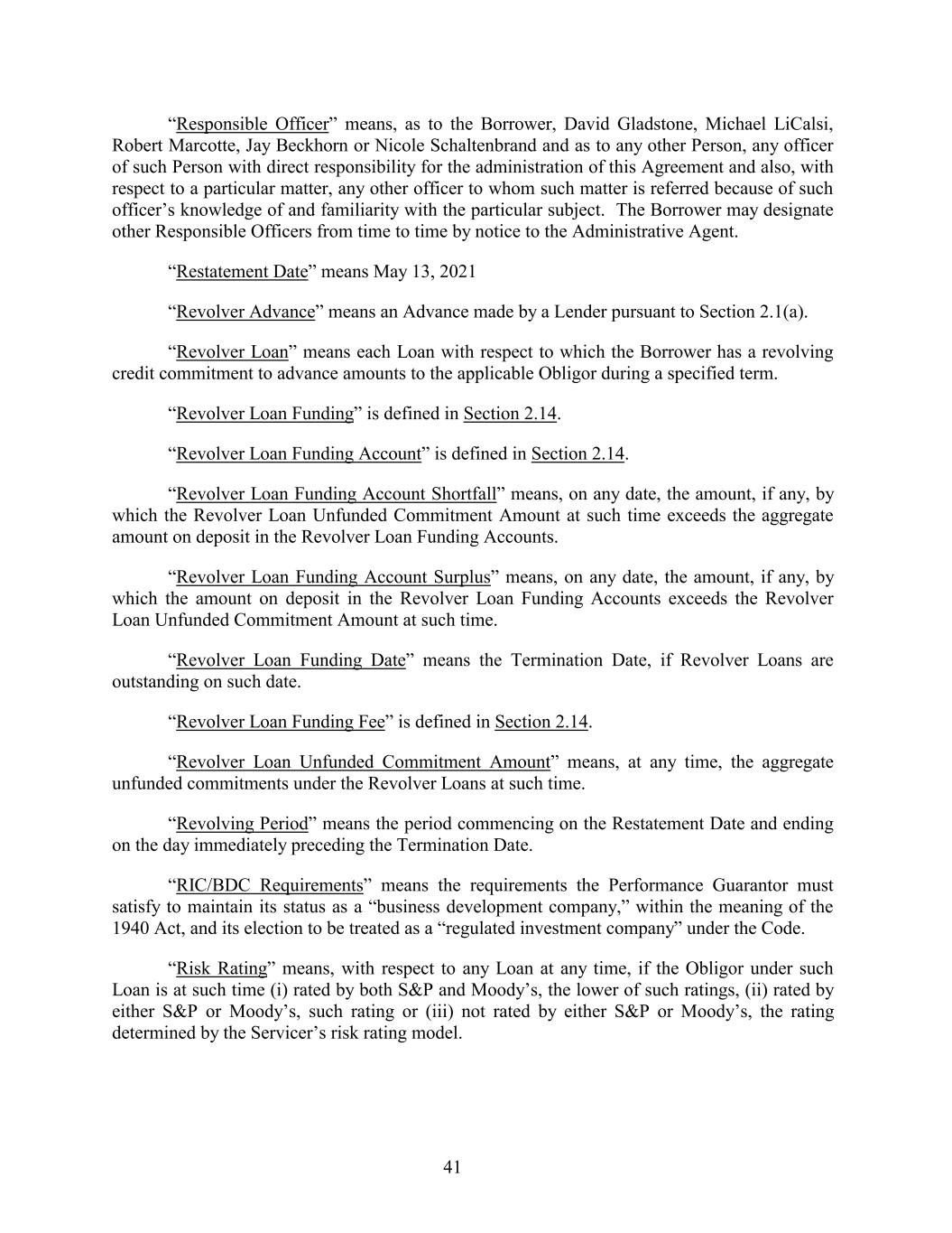 “Responsible Officer” means, as to the Borrower, David Gladstone, Michael LiCalsi, Robert Marcotte, Jay Beckhorn or Nicole Schaltenbrand and as to any other Person, any officer of such Person with direct responsibility for the administration of this Agreement and also, with respect to a particular matter, any other officer to whom such matter is referred because of such officer’s knowledge of and familiarity with the particular subject. The Borrower may designate other Responsible Officers from time to time by notice to the Administrative Agent. “Restatement Date” means May 13, 2021 “Revolver Advance” means an Advance made by a Lender pursuant to Section 2.1(a). “Revolver Loan” means each Loan with respect to which the Borrower has a revolving credit commitment to advance amounts to the applicable Obligor during a specified term. “Revolver Loan Funding” is defined in Section 2.14. “Revolver Loan Funding Account” is defined in Section 2.14. “Revolver Loan Funding Account Shortfall” means, on any date, the amount, if any, by which the Revolver Loan Unfunded Commitment Amount at such time exceeds the aggregate amount on deposit in the Revolver Loan Funding Accounts. “Revolver Loan Funding Account Surplus” means, on any date, the amount, if any, by which the amount on deposit in the Revolver Loan Funding Accounts exceeds the Revolver Loan Unfunded Commitment Amount at such time. “Revolver Loan Funding Date” means the Termination Date, if Revolver Loans are outstanding on such date. “Revolver Loan Funding Fee” is defined in Section 2.14. “Revolver Loan Unfunded Commitment Amount” means, at any time, the aggregate unfunded commitments under the Revolver Loans at such time. “Revolving Period” means the period commencing on the Restatement Date and ending on the day immediately preceding the Termination Date. “RIC/BDC Requirements” means the requirements the Performance Guarantor must satisfy to maintain its status as a “business development company,” within the meaning of the 1940 Act, and its election to be treated as a “regulated investment company” under the Code. “Risk Rating” means, with respect to any Loan at any time, if the Obligor under such Loan is at such time (i) rated by both S&P and Moody’s, the lower of such ratings, (ii) rated by either S&P or Moody’s, such rating or (iii) not rated by either S&P or Moody’s, the rating determined by the Servicer’s risk rating model. 41