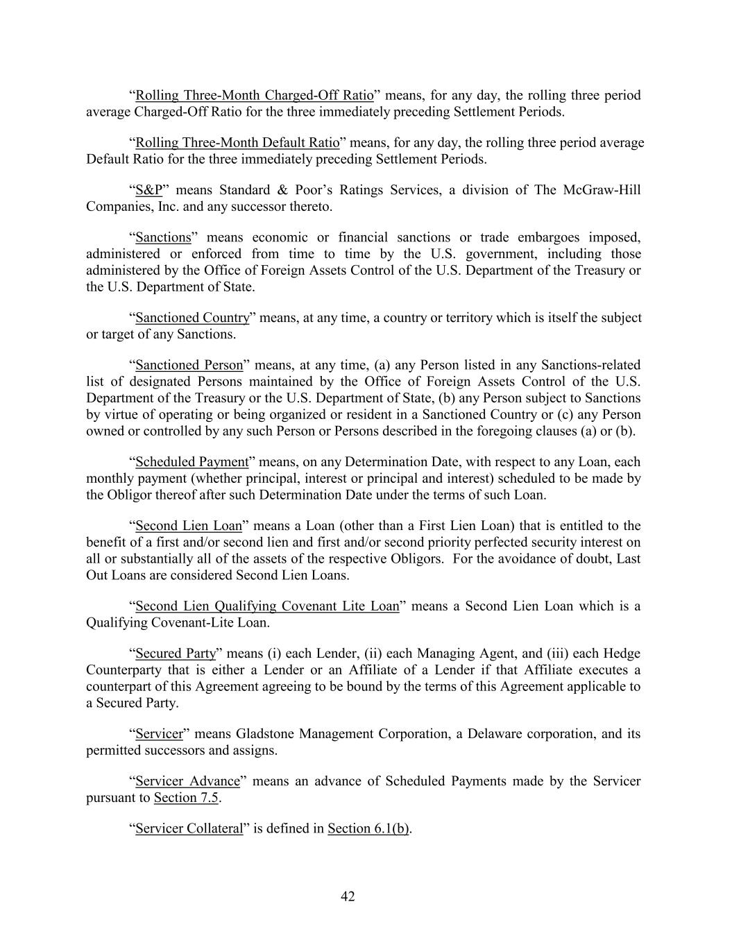 “Rolling Three-Month Charged-Off Ratio” means, for any day, the rolling three period average Charged-Off Ratio for the three immediately preceding Settlement Periods. “Rolling Three-Month Default Ratio” means, for any day, the rolling three period average Default Ratio for the three immediately preceding Settlement Periods. “S&P” means Standard & Poor’s Ratings Services, a division of The McGraw-Hill Companies, Inc. and any successor thereto. “Sanctions” means economic or financial sanctions or trade embargoes imposed, administered or enforced from time to time by the U.S. government, including those administered by the Office of Foreign Assets Control of the U.S. Department of the Treasury or the U.S. Department of State. “Sanctioned Country” means, at any time, a country or territory which is itself the subject or target of any Sanctions. “Sanctioned Person” means, at any time, (a) any Person listed in any Sanctions-related list of designated Persons maintained by the Office of Foreign Assets Control of the U.S. Department of the Treasury or the U.S. Department of State, (b) any Person subject to Sanctions by virtue of operating or being organized or resident in a Sanctioned Country or (c) any Person owned or controlled by any such Person or Persons described in the foregoing clauses (a) or (b). “Scheduled Payment” means, on any Determination Date, with respect to any Loan, each monthly payment (whether principal, interest or principal and interest) scheduled to be made by the Obligor thereof after such Determination Date under the terms of such Loan. “Second Lien Loan” means a Loan (other than a First Lien Loan) that is entitled to the benefit of a first and/or second lien and first and/or second priority perfected security interest on all or substantially all of the assets of the respective Obligors. For the avoidance of doubt, Last Out Loans are considered Second Lien Loans. “Second Lien Qualifying Covenant Lite Loan” means a Second Lien Loan which is a Qualifying Covenant-Lite Loan. “Secured Party” means (i) each Lender, (ii) each Managing Agent, and (iii) each Hedge Counterparty that is either a Lender or an Affiliate of a Lender if that Affiliate executes a counterpart of this Agreement agreeing to be bound by the terms of this Agreement applicable to a Secured Party. “Servicer” means Gladstone Management Corporation, a Delaware corporation, and its permitted successors and assigns. “Servicer Advance” means an advance of Scheduled Payments made by the Servicer pursuant to Section 7.5. “Servicer Collateral” is defined in Section 6.1(b). 42