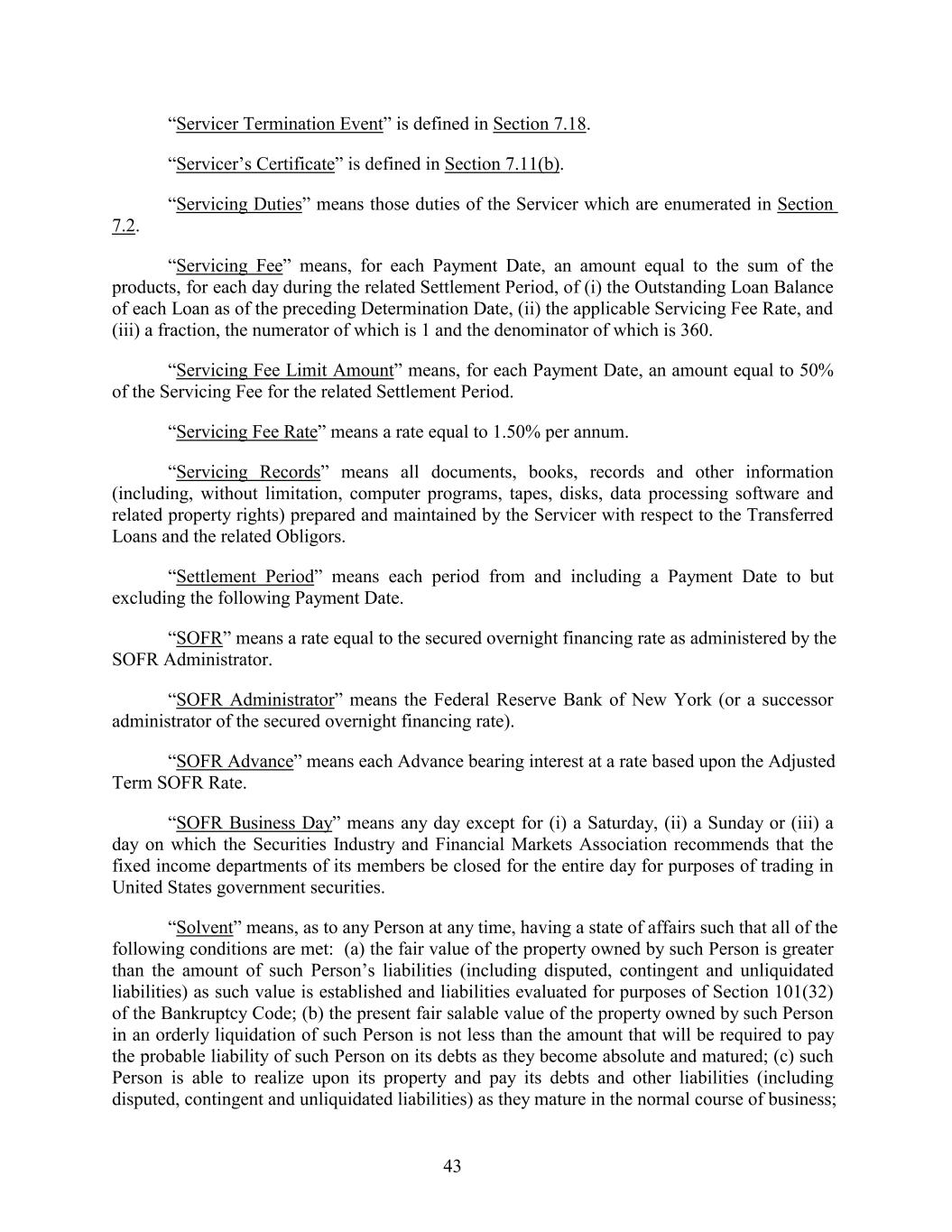 “Servicer Termination Event” is defined in Section 7.18. “Servicer’s Certificate” is defined in Section 7.11(b). “Servicing Duties” means those duties of the Servicer which are enumerated in Section 7.2. “Servicing Fee” means, for each Payment Date, an amount equal to the sum of the products, for each day during the related Settlement Period, of (i) the Outstanding Loan Balance of each Loan as of the preceding Determination Date, (ii) the applicable Servicing Fee Rate, and (iii) a fraction, the numerator of which is 1 and the denominator of which is 360. “Servicing Fee Limit Amount” means, for each Payment Date, an amount equal to 50% of the Servicing Fee for the related Settlement Period. “Servicing Fee Rate” means a rate equal to 1.50% per annum. “Servicing Records” means all documents, books, records and other information (including, without limitation, computer programs, tapes, disks, data processing software and related property rights) prepared and maintained by the Servicer with respect to the Transferred Loans and the related Obligors. “Settlement Period” means each period from and including a Payment Date to but excluding the following Payment Date. “SOFR” means a rate equal to the secured overnight financing rate as administered by the SOFR Administrator. “SOFR Administrator” means the Federal Reserve Bank of New York (or a successor administrator of the secured overnight financing rate). “SOFR Advance” means each Advance bearing interest at a rate based upon the Adjusted Term SOFR Rate. “SOFR Business Day” means any day except for (i) a Saturday, (ii) a Sunday or (iii) a day on which the Securities Industry and Financial Markets Association recommends that the fixed income departments of its members be closed for the entire day for purposes of trading in United States government securities. “Solvent” means, as to any Person at any time, having a state of affairs such that all of the following conditions are met: (a) the fair value of the property owned by such Person is greater than the amount of such Person’s liabilities (including disputed, contingent and unliquidated liabilities) as such value is established and liabilities evaluated for purposes of Section 101(32) of the Bankruptcy Code; (b) the present fair salable value of the property owned by such Person in an orderly liquidation of such Person is not less than the amount that will be required to pay the probable liability of such Person on its debts as they become absolute and matured; (c) such Person is able to realize upon its property and pay its debts and other liabilities (including disputed, contingent and unliquidated liabilities) as they mature in the normal course of business; 43