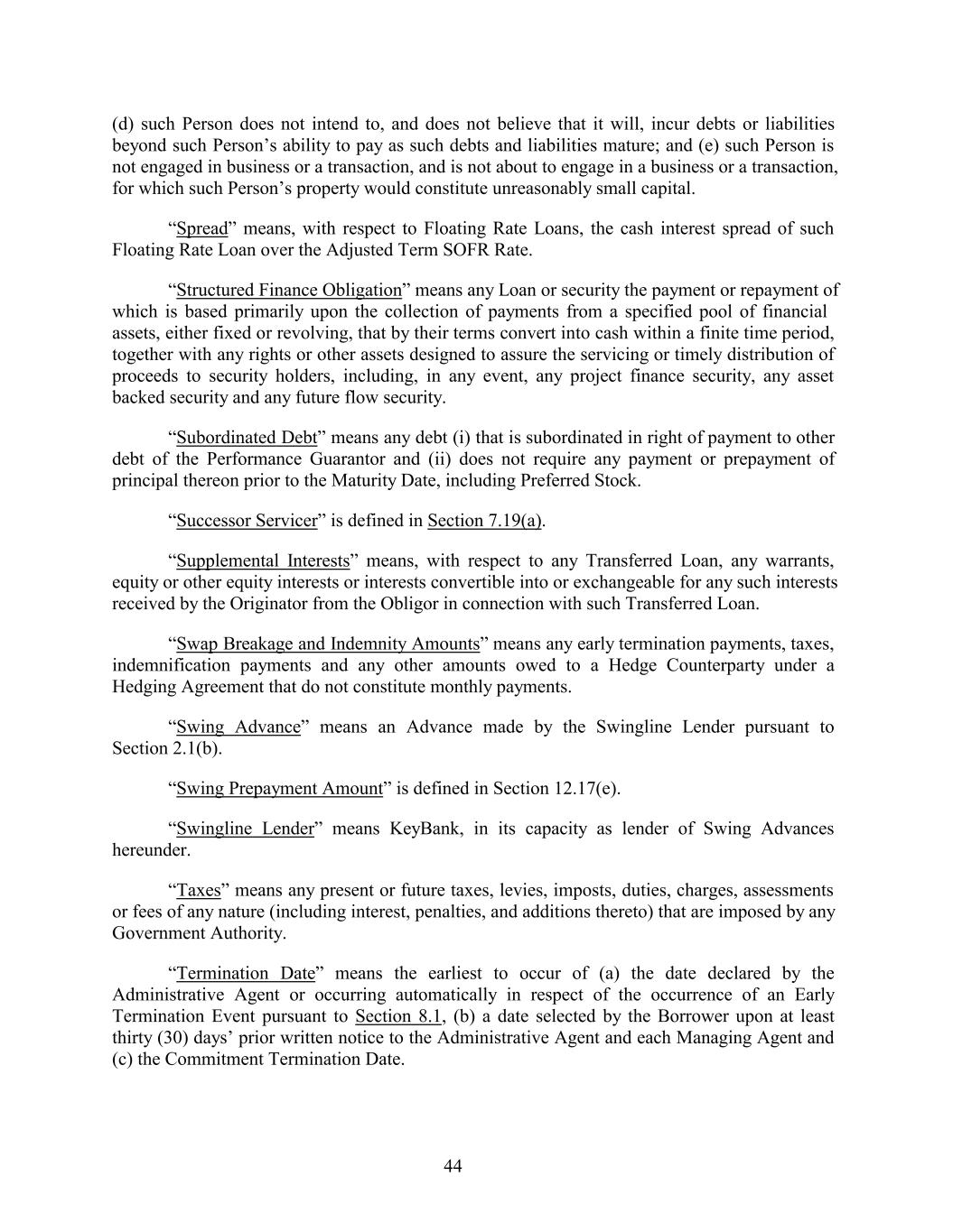 (d) such Person does not intend to, and does not believe that it will, incur debts or liabilities beyond such Person’s ability to pay as such debts and liabilities mature; and (e) such Person is not engaged in business or a transaction, and is not about to engage in a business or a transaction, for which such Person’s property would constitute unreasonably small capital. “Spread” means, with respect to Floating Rate Loans, the cash interest spread of such Floating Rate Loan over the Adjusted Term SOFR Rate. “Structured Finance Obligation” means any Loan or security the payment or repayment of which is based primarily upon the collection of payments from a specified pool of financial assets, either fixed or revolving, that by their terms convert into cash within a finite time period, together with any rights or other assets designed to assure the servicing or timely distribution of proceeds to security holders, including, in any event, any project finance security, any asset backed security and any future flow security. “Subordinated Debt” means any debt (i) that is subordinated in right of payment to other debt of the Performance Guarantor and (ii) does not require any payment or prepayment of principal thereon prior to the Maturity Date, including Preferred Stock. “Successor Servicer” is defined in Section 7.19(a). “Supplemental Interests” means, with respect to any Transferred Loan, any warrants, equity or other equity interests or interests convertible into or exchangeable for any such interests received by the Originator from the Obligor in connection with such Transferred Loan. “Swap Breakage and Indemnity Amounts” means any early termination payments, taxes, indemnification payments and any other amounts owed to a Hedge Counterparty under a Hedging Agreement that do not constitute monthly payments. “Swing Advance” means an Advance made by the Swingline Lender pursuant to Section 2.1(b). “Swing Prepayment Amount” is defined in Section 12.17(e). “Swingline Lender” means KeyBank, in its capacity as lender of Swing Advances hereunder. “Taxes” means any present or future taxes, levies, imposts, duties, charges, assessments or fees of any nature (including interest, penalties, and additions thereto) that are imposed by any Government Authority. “Termination Date” means the earliest to occur of (a) the date declared by the Administrative Agent or occurring automatically in respect of the occurrence of an Early Termination Event pursuant to Section 8.1, (b) a date selected by the Borrower upon at least thirty (30) days’ prior written notice to the Administrative Agent and each Managing Agent and (c) the Commitment Termination Date. 44