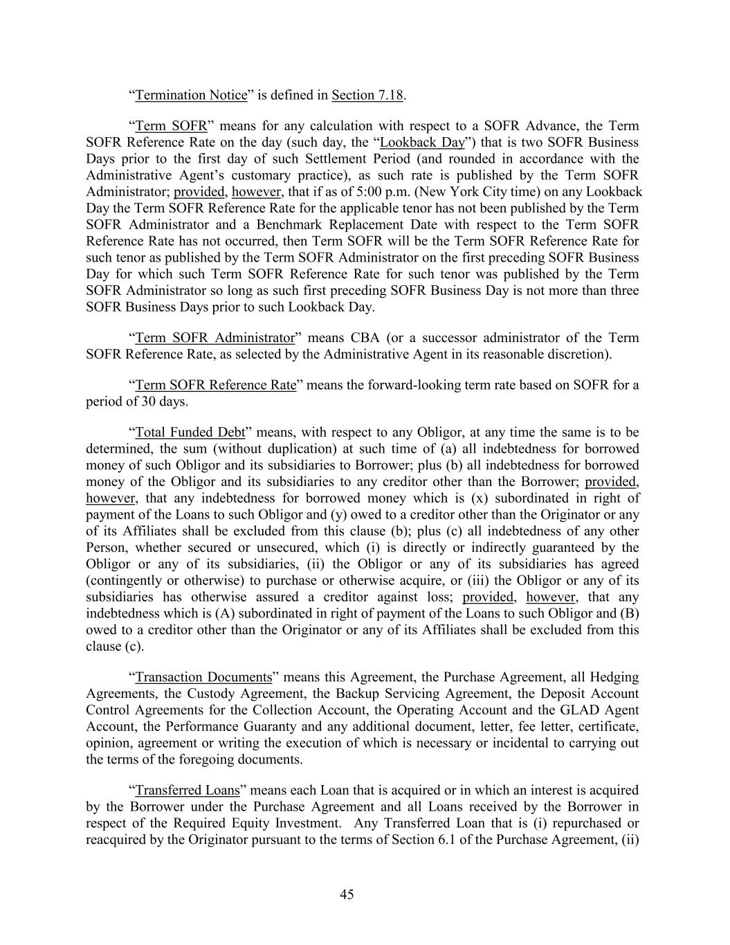 “Termination Notice” is defined in Section 7.18. “Term SOFR” means for any calculation with respect to a SOFR Advance, the Term SOFR Reference Rate on the day (such day, the “Lookback Day”) that is two SOFR Business Days prior to the first day of such Settlement Period (and rounded in accordance with the Administrative Agent’s customary practice), as such rate is published by the Term SOFR Administrator; provided, however, that if as of 5:00 p.m. (New York City time) on any Lookback Day the Term SOFR Reference Rate for the applicable tenor has not been published by the Term SOFR Administrator and a Benchmark Replacement Date with respect to the Term SOFR Reference Rate has not occurred, then Term SOFR will be the Term SOFR Reference Rate for such tenor as published by the Term SOFR Administrator on the first preceding SOFR Business Day for which such Term SOFR Reference Rate for such tenor was published by the Term SOFR Administrator so long as such first preceding SOFR Business Day is not more than three SOFR Business Days prior to such Lookback Day. “Term SOFR Administrator” means CBA (or a successor administrator of the Term SOFR Reference Rate, as selected by the Administrative Agent in its reasonable discretion). “Term SOFR Reference Rate” means the forward-looking term rate based on SOFR for a period of 30 days. “Total Funded Debt” means, with respect to any Obligor, at any time the same is to be determined, the sum (without duplication) at such time of (a) all indebtedness for borrowed money of such Obligor and its subsidiaries to Borrower; plus (b) all indebtedness for borrowed money of the Obligor and its subsidiaries to any creditor other than the Borrower; provided, however, that any indebtedness for borrowed money which is (x) subordinated in right of payment of the Loans to such Obligor and (y) owed to a creditor other than the Originator or any of its Affiliates shall be excluded from this clause (b); plus (c) all indebtedness of any other Person, whether secured or unsecured, which (i) is directly or indirectly guaranteed by the Obligor or any of its subsidiaries, (ii) the Obligor or any of its subsidiaries has agreed (contingently or otherwise) to purchase or otherwise acquire, or (iii) the Obligor or any of its subsidiaries has otherwise assured a creditor against loss; provided, however, that any indebtedness which is (A) subordinated in right of payment of the Loans to such Obligor and (B) owed to a creditor other than the Originator or any of its Affiliates shall be excluded from this clause (c). “Transaction Documents” means this Agreement, the Purchase Agreement, all Hedging Agreements, the Custody Agreement, the Backup Servicing Agreement, the Deposit Account Control Agreements for the Collection Account, the Operating Account and the GLAD Agent Account, the Performance Guaranty and any additional document, letter, fee letter, certificate, opinion, agreement or writing the execution of which is necessary or incidental to carrying out the terms of the foregoing documents. “Transferred Loans” means each Loan that is acquired or in which an interest is acquired by the Borrower under the Purchase Agreement and all Loans received by the Borrower in respect of the Required Equity Investment. Any Transferred Loan that is (i) repurchased or reacquired by the Originator pursuant to the terms of Section 6.1 of the Purchase Agreement, (ii) 45