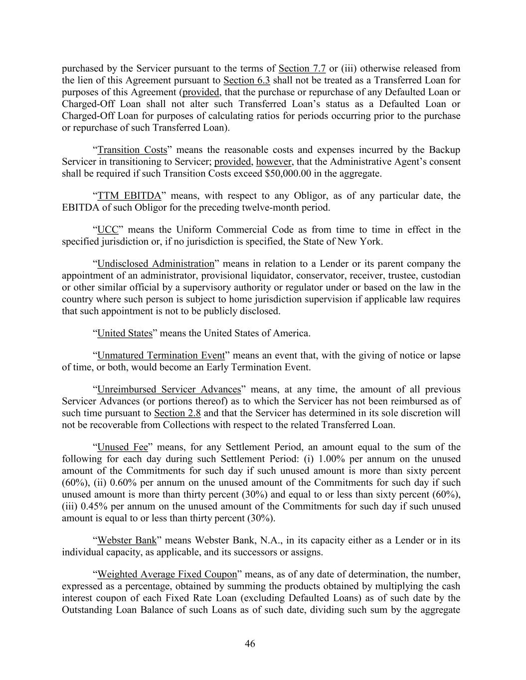 purchased by the Servicer pursuant to the terms of Section 7.7 or (iii) otherwise released from the lien of this Agreement pursuant to Section 6.3 shall not be treated as a Transferred Loan for purposes of this Agreement (provided, that the purchase or repurchase of any Defaulted Loan or Charged-Off Loan shall not alter such Transferred Loan’s status as a Defaulted Loan or Charged-Off Loan for purposes of calculating ratios for periods occurring prior to the purchase or repurchase of such Transferred Loan). “Transition Costs” means the reasonable costs and expenses incurred by the Backup Servicer in transitioning to Servicer; provided, however, that the Administrative Agent’s consent shall be required if such Transition Costs exceed $50,000.00 in the aggregate. “TTM EBITDA” means, with respect to any Obligor, as of any particular date, the EBITDA of such Obligor for the preceding twelve-month period. “UCC” means the Uniform Commercial Code as from time to time in effect in the specified jurisdiction or, if no jurisdiction is specified, the State of New York. “Undisclosed Administration” means in relation to a Lender or its parent company the appointment of an administrator, provisional liquidator, conservator, receiver, trustee, custodian or other similar official by a supervisory authority or regulator under or based on the law in the country where such person is subject to home jurisdiction supervision if applicable law requires that such appointment is not to be publicly disclosed. “United States” means the United States of America. “Unmatured Termination Event” means an event that, with the giving of notice or lapse of time, or both, would become an Early Termination Event. “Unreimbursed Servicer Advances” means, at any time, the amount of all previous Servicer Advances (or portions thereof) as to which the Servicer has not been reimbursed as of such time pursuant to Section 2.8 and that the Servicer has determined in its sole discretion will not be recoverable from Collections with respect to the related Transferred Loan. “Unused Fee” means, for any Settlement Period, an amount equal to the sum of the following for each day during such Settlement Period: (i) 1.00% per annum on the unused amount of the Commitments for such day if such unused amount is more than sixty percent (60%), (ii) 0.60% per annum on the unused amount of the Commitments for such day if such unused amount is more than thirty percent (30%) and equal to or less than sixty percent (60%), (iii) 0.45% per annum on the unused amount of the Commitments for such day if such unused amount is equal to or less than thirty percent (30%). “Webster Bank” means Webster Bank, N.A., in its capacity either as a Lender or in its individual capacity, as applicable, and its successors or assigns. “Weighted Average Fixed Coupon” means, as of any date of determination, the number, expressed as a percentage, obtained by summing the products obtained by multiplying the cash interest coupon of each Fixed Rate Loan (excluding Defaulted Loans) as of such date by the Outstanding Loan Balance of such Loans as of such date, dividing such sum by the aggregate 46