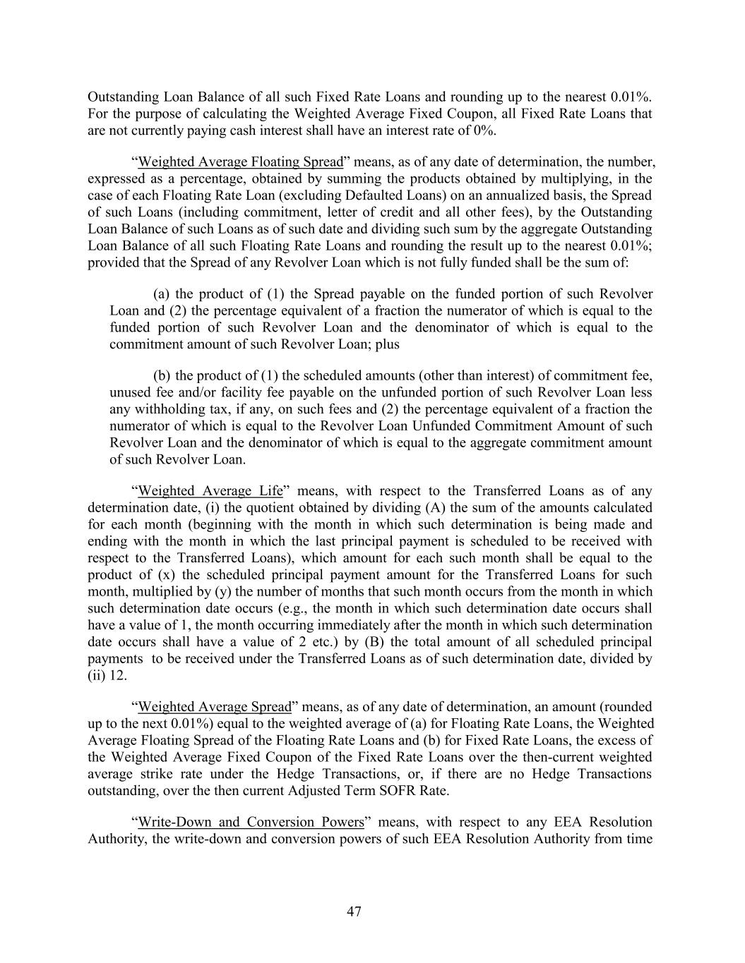 Outstanding Loan Balance of all such Fixed Rate Loans and rounding up to the nearest 0.01%. For the purpose of calculating the Weighted Average Fixed Coupon, all Fixed Rate Loans that are not currently paying cash interest shall have an interest rate of 0%. “Weighted Average Floating Spread” means, as of any date of determination, the number, expressed as a percentage, obtained by summing the products obtained by multiplying, in the case of each Floating Rate Loan (excluding Defaulted Loans) on an annualized basis, the Spread of such Loans (including commitment, letter of credit and all other fees), by the Outstanding Loan Balance of such Loans as of such date and dividing such sum by the aggregate Outstanding Loan Balance of all such Floating Rate Loans and rounding the result up to the nearest 0.01%; provided that the Spread of any Revolver Loan which is not fully funded shall be the sum of: (a) the product of (1) the Spread payable on the funded portion of such Revolver Loan and (2) the percentage equivalent of a fraction the numerator of which is equal to the funded portion of such Revolver Loan and the denominator of which is equal to the commitment amount of such Revolver Loan; plus (b) the product of (1) the scheduled amounts (other than interest) of commitment fee, unused fee and/or facility fee payable on the unfunded portion of such Revolver Loan less any withholding tax, if any, on such fees and (2) the percentage equivalent of a fraction the numerator of which is equal to the Revolver Loan Unfunded Commitment Amount of such Revolver Loan and the denominator of which is equal to the aggregate commitment amount of such Revolver Loan. “Weighted Average Life” means, with respect to the Transferred Loans as of any determination date, (i) the quotient obtained by dividing (A) the sum of the amounts calculated for each month (beginning with the month in which such determination is being made and ending with the month in which the last principal payment is scheduled to be received with respect to the Transferred Loans), which amount for each such month shall be equal to the product of (x) the scheduled principal payment amount for the Transferred Loans for such month, multiplied by (y) the number of months that such month occurs from the month in which such determination date occurs (e.g., the month in which such determination date occurs shall have a value of 1, the month occurring immediately after the month in which such determination date occurs shall have a value of 2 etc.) by (B) the total amount of all scheduled principal payments to be received under the Transferred Loans as of such determination date, divided by (ii) 12. “Weighted Average Spread” means, as of any date of determination, an amount (rounded up to the next 0.01%) equal to the weighted average of (a) for Floating Rate Loans, the Weighted Average Floating Spread of the Floating Rate Loans and (b) for Fixed Rate Loans, the excess of the Weighted Average Fixed Coupon of the Fixed Rate Loans over the then-current weighted average strike rate under the Hedge Transactions, or, if there are no Hedge Transactions outstanding, over the then current Adjusted Term SOFR Rate. “Write-Down and Conversion Powers” means, with respect to any EEA Resolution Authority, the write-down and conversion powers of such EEA Resolution Authority from time 47