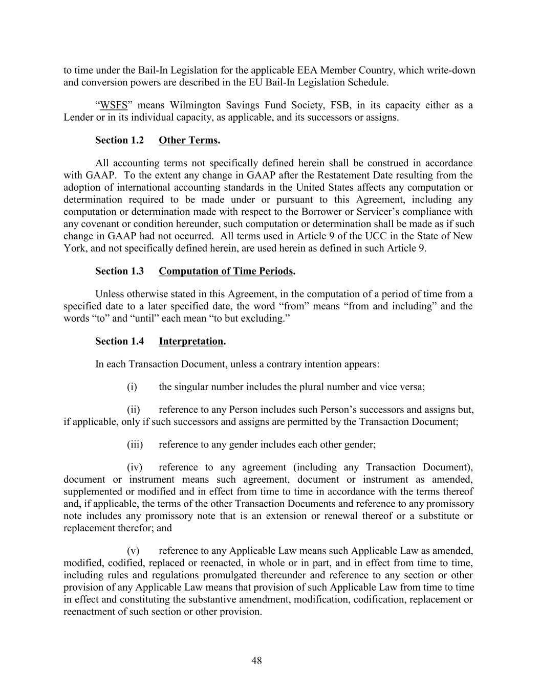to time under the Bail-In Legislation for the applicable EEA Member Country, which write-down and conversion powers are described in the EU Bail-In Legislation Schedule. “WSFS” means Wilmington Savings Fund Society, FSB, in its capacity either as a Lender or in its individual capacity, as applicable, and its successors or assigns. Section 1.2 Other Terms. All accounting terms not specifically defined herein shall be construed in accordance with GAAP. To the extent any change in GAAP after the Restatement Date resulting from the adoption of international accounting standards in the United States affects any computation or determination required to be made under or pursuant to this Agreement, including any computation or determination made with respect to the Borrower or Servicer’s compliance with any covenant or condition hereunder, such computation or determination shall be made as if such change in GAAP had not occurred. All terms used in Article 9 of the UCC in the State of New York, and not specifically defined herein, are used herein as defined in such Article 9. Section 1.3 Computation of Time Periods. Unless otherwise stated in this Agreement, in the computation of a period of time from a specified date to a later specified date, the word “from” means “from and including” and the words “to” and “until” each mean “to but excluding.” Section 1.4 Interpretation. In each Transaction Document, unless a contrary intention appears: (i) the singular number includes the plural number and vice versa; (ii) reference to any Person includes such Person’s successors and assigns but, if applicable, only if such successors and assigns are permitted by the Transaction Document; (iii) reference to any gender includes each other gender; (iv) reference to any agreement (including any Transaction Document), document or instrument means such agreement, document or instrument as amended, supplemented or modified and in effect from time to time in accordance with the terms thereof and, if applicable, the terms of the other Transaction Documents and reference to any promissory note includes any promissory note that is an extension or renewal thereof or a substitute or replacement therefor; and (v) reference to any Applicable Law means such Applicable Law as amended, modified, codified, replaced or reenacted, in whole or in part, and in effect from time to time, including rules and regulations promulgated thereunder and reference to any section or other provision of any Applicable Law means that provision of such Applicable Law from time to time in effect and constituting the substantive amendment, modification, codification, replacement or reenactment of such section or other provision. 48