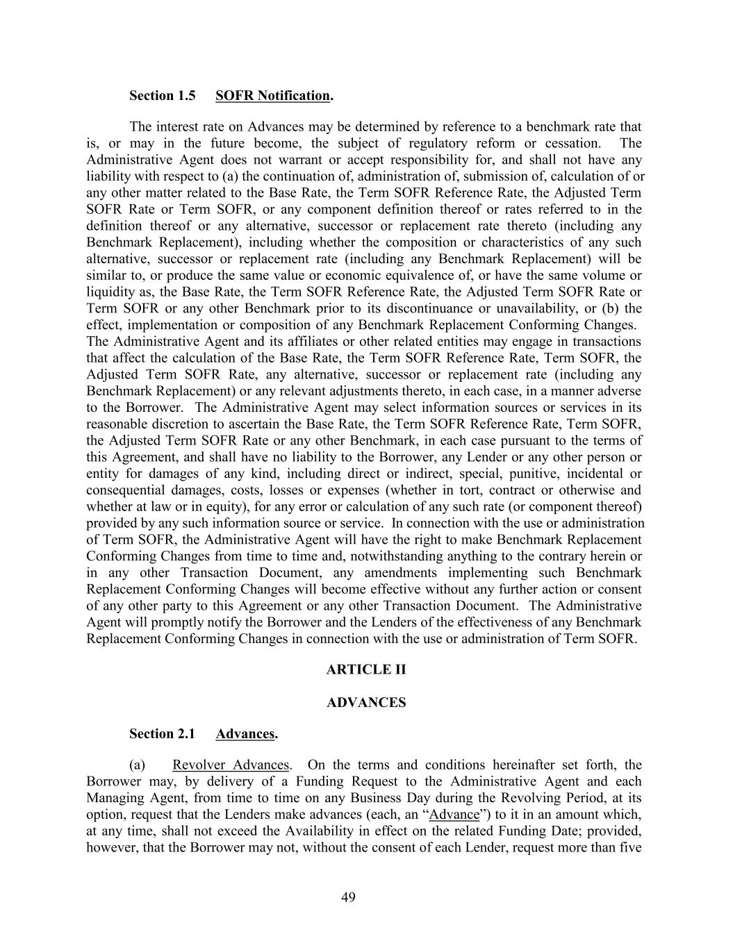 Section 1.5 SOFR Notification. The interest rate on Advances may be determined by reference to a benchmark rate that is, or may in the future become, the subject of regulatory reform or cessation. The Administrative Agent does not warrant or accept responsibility for, and shall not have any liability with respect to (a) the continuation of, administration of, submission of, calculation of or any other matter related to the Base Rate, the Term SOFR Reference Rate, the Adjusted Term SOFR Rate or Term SOFR, or any component definition thereof or rates referred to in the definition thereof or any alternative, successor or replacement rate thereto (including any Benchmark Replacement), including whether the composition or characteristics of any such alternative, successor or replacement rate (including any Benchmark Replacement) will be similar to, or produce the same value or economic equivalence of, or have the same volume or liquidity as, the Base Rate, the Term SOFR Reference Rate, the Adjusted Term SOFR Rate or Term SOFR or any other Benchmark prior to its discontinuance or unavailability, or (b) the effect, implementation or composition of any Benchmark Replacement Conforming Changes. The Administrative Agent and its affiliates or other related entities may engage in transactions that affect the calculation of the Base Rate, the Term SOFR Reference Rate, Term SOFR, the Adjusted Term SOFR Rate, any alternative, successor or replacement rate (including any Benchmark Replacement) or any relevant adjustments thereto, in each case, in a manner adverse to the Borrower. The Administrative Agent may select information sources or services in its reasonable discretion to ascertain the Base Rate, the Term SOFR Reference Rate, Term SOFR, the Adjusted Term SOFR Rate or any other Benchmark, in each case pursuant to the terms of this Agreement, and shall have no liability to the Borrower, any Lender or any other person or entity for damages of any kind, including direct or indirect, special, punitive, incidental or consequential damages, costs, losses or expenses (whether in tort, contract or otherwise and whether at law or in equity), for any error or calculation of any such rate (or component thereof) provided by any such information source or service. In connection with the use or administration of Term SOFR, the Administrative Agent will have the right to make Benchmark Replacement Conforming Changes from time to time and, notwithstanding anything to the contrary herein or in any other Transaction Document, any amendments implementing such Benchmark Replacement Conforming Changes will become effective without any further action or consent of any other party to this Agreement or any other Transaction Document. The Administrative Agent will promptly notify the Borrower and the Lenders of the effectiveness of any Benchmark Replacement Conforming Changes in connection with the use or administration of Term SOFR. ARTICLE II ADVANCES Section 2.1 Advances. (a) Revolver Advances. On the terms and conditions hereinafter set forth, the Borrower may, by delivery of a Funding Request to the Administrative Agent and each Managing Agent, from time to time on any Business Day during the Revolving Period, at its option, request that the Lenders make advances (each, an “Advance”) to it in an amount which, at any time, shall not exceed the Availability in effect on the related Funding Date; provided, however, that the Borrower may not, without the consent of each Lender, request more than five 49