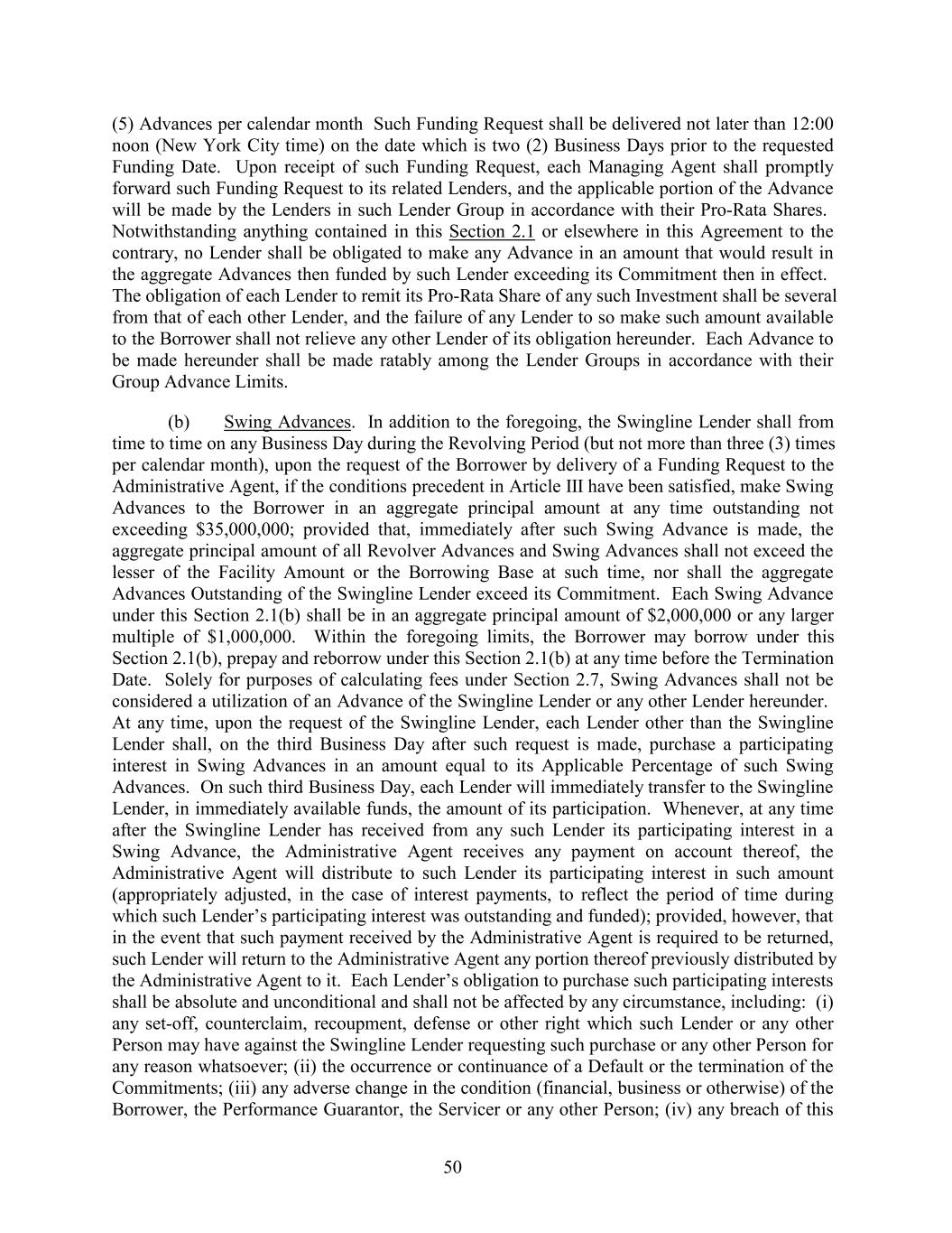 (5) Advances per calendar month Such Funding Request shall be delivered not later than 12:00 noon (New York City time) on the date which is two (2) Business Days prior to the requested Funding Date. Upon receipt of such Funding Request, each Managing Agent shall promptly forward such Funding Request to its related Lenders, and the applicable portion of the Advance will be made by the Lenders in such Lender Group in accordance with their Pro-Rata Shares. Notwithstanding anything contained in this Section 2.1 or elsewhere in this Agreement to the contrary, no Lender shall be obligated to make any Advance in an amount that would result in the aggregate Advances then funded by such Lender exceeding its Commitment then in effect. The obligation of each Lender to remit its Pro-Rata Share of any such Investment shall be several from that of each other Lender, and the failure of any Lender to so make such amount available to the Borrower shall not relieve any other Lender of its obligation hereunder. Each Advance to be made hereunder shall be made ratably among the Lender Groups in accordance with their Group Advance Limits. (b) Swing Advances. In addition to the foregoing, the Swingline Lender shall from time to time on any Business Day during the Revolving Period (but not more than three (3) times per calendar month), upon the request of the Borrower by delivery of a Funding Request to the Administrative Agent, if the conditions precedent in Article III have been satisfied, make Swing Advances to the Borrower in an aggregate principal amount at any time outstanding not exceeding $35,000,000; provided that, immediately after such Swing Advance is made, the aggregate principal amount of all Revolver Advances and Swing Advances shall not exceed the lesser of the Facility Amount or the Borrowing Base at such time, nor shall the aggregate Advances Outstanding of the Swingline Lender exceed its Commitment. Each Swing Advance under this Section 2.1(b) shall be in an aggregate principal amount of $2,000,000 or any larger multiple of $1,000,000. Within the foregoing limits, the Borrower may borrow under this Section 2.1(b), prepay and reborrow under this Section 2.1(b) at any time before the Termination Date. Solely for purposes of calculating fees under Section 2.7, Swing Advances shall not be considered a utilization of an Advance of the Swingline Lender or any other Lender hereunder. At any time, upon the request of the Swingline Lender, each Lender other than the Swingline Lender shall, on the third Business Day after such request is made, purchase a participating interest in Swing Advances in an amount equal to its Applicable Percentage of such Swing Advances. On such third Business Day, each Lender will immediately transfer to the Swingline Lender, in immediately available funds, the amount of its participation. Whenever, at any time after the Swingline Lender has received from any such Lender its participating interest in a Swing Advance, the Administrative Agent receives any payment on account thereof, the Administrative Agent will distribute to such Lender its participating interest in such amount (appropriately adjusted, in the case of interest payments, to reflect the period of time during which such Lender’s participating interest was outstanding and funded); provided, however, that in the event that such payment received by the Administrative Agent is required to be returned, such Lender will return to the Administrative Agent any portion thereof previously distributed by the Administrative Agent to it. Each Lender’s obligation to purchase such participating interests shall be absolute and unconditional and shall not be affected by any circumstance, including: (i) any set-off, counterclaim, recoupment, defense or other right which such Lender or any other Person may have against the Swingline Lender requesting such purchase or any other Person for any reason whatsoever; (ii) the occurrence or continuance of a Default or the termination of the Commitments; (iii) any adverse change in the condition (financial, business or otherwise) of the Borrower, the Performance Guarantor, the Servicer or any other Person; (iv) any breach of this 50
