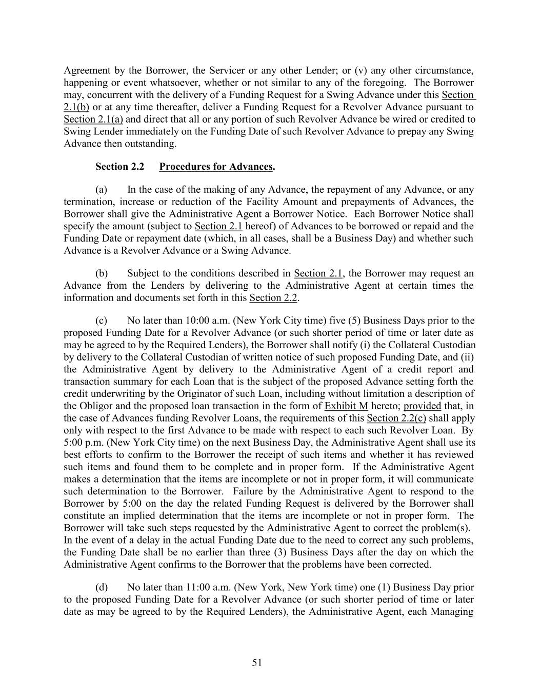 Agreement by the Borrower, the Servicer or any other Lender; or (v) any other circumstance, happening or event whatsoever, whether or not similar to any of the foregoing. The Borrower may, concurrent with the delivery of a Funding Request for a Swing Advance under this Section 2.1(b) or at any time thereafter, deliver a Funding Request for a Revolver Advance pursuant to Section 2.1(a) and direct that all or any portion of such Revolver Advance be wired or credited to Swing Lender immediately on the Funding Date of such Revolver Advance to prepay any Swing Advance then outstanding. Section 2.2 Procedures for Advances. (a) In the case of the making of any Advance, the repayment of any Advance, or any termination, increase or reduction of the Facility Amount and prepayments of Advances, the Borrower shall give the Administrative Agent a Borrower Notice. Each Borrower Notice shall specify the amount (subject to Section 2.1 hereof) of Advances to be borrowed or repaid and the Funding Date or repayment date (which, in all cases, shall be a Business Day) and whether such Advance is a Revolver Advance or a Swing Advance. (b) Subject to the conditions described in Section 2.1, the Borrower may request an Advance from the Lenders by delivering to the Administrative Agent at certain times the information and documents set forth in this Section 2.2. (c) No later than 10:00 a.m. (New York City time) five (5) Business Days prior to the proposed Funding Date for a Revolver Advance (or such shorter period of time or later date as may be agreed to by the Required Lenders), the Borrower shall notify (i) the Collateral Custodian by delivery to the Collateral Custodian of written notice of such proposed Funding Date, and (ii) the Administrative Agent by delivery to the Administrative Agent of a credit report and transaction summary for each Loan that is the subject of the proposed Advance setting forth the credit underwriting by the Originator of such Loan, including without limitation a description of the Obligor and the proposed loan transaction in the form of Exhibit M hereto; provided that, in the case of Advances funding Revolver Loans, the requirements of this Section 2.2(c) shall apply only with respect to the first Advance to be made with respect to each such Revolver Loan. By 5:00 p.m. (New York City time) on the next Business Day, the Administrative Agent shall use its best efforts to confirm to the Borrower the receipt of such items and whether it has reviewed such items and found them to be complete and in proper form. If the Administrative Agent makes a determination that the items are incomplete or not in proper form, it will communicate such determination to the Borrower. Failure by the Administrative Agent to respond to the Borrower by 5:00 on the day the related Funding Request is delivered by the Borrower shall constitute an implied determination that the items are incomplete or not in proper form. The Borrower will take such steps requested by the Administrative Agent to correct the problem(s). In the event of a delay in the actual Funding Date due to the need to correct any such problems, the Funding Date shall be no earlier than three (3) Business Days after the day on which the Administrative Agent confirms to the Borrower that the problems have been corrected. (d) No later than 11:00 a.m. (New York, New York time) one (1) Business Day prior to the proposed Funding Date for a Revolver Advance (or such shorter period of time or later date as may be agreed to by the Required Lenders), the Administrative Agent, each Managing 51