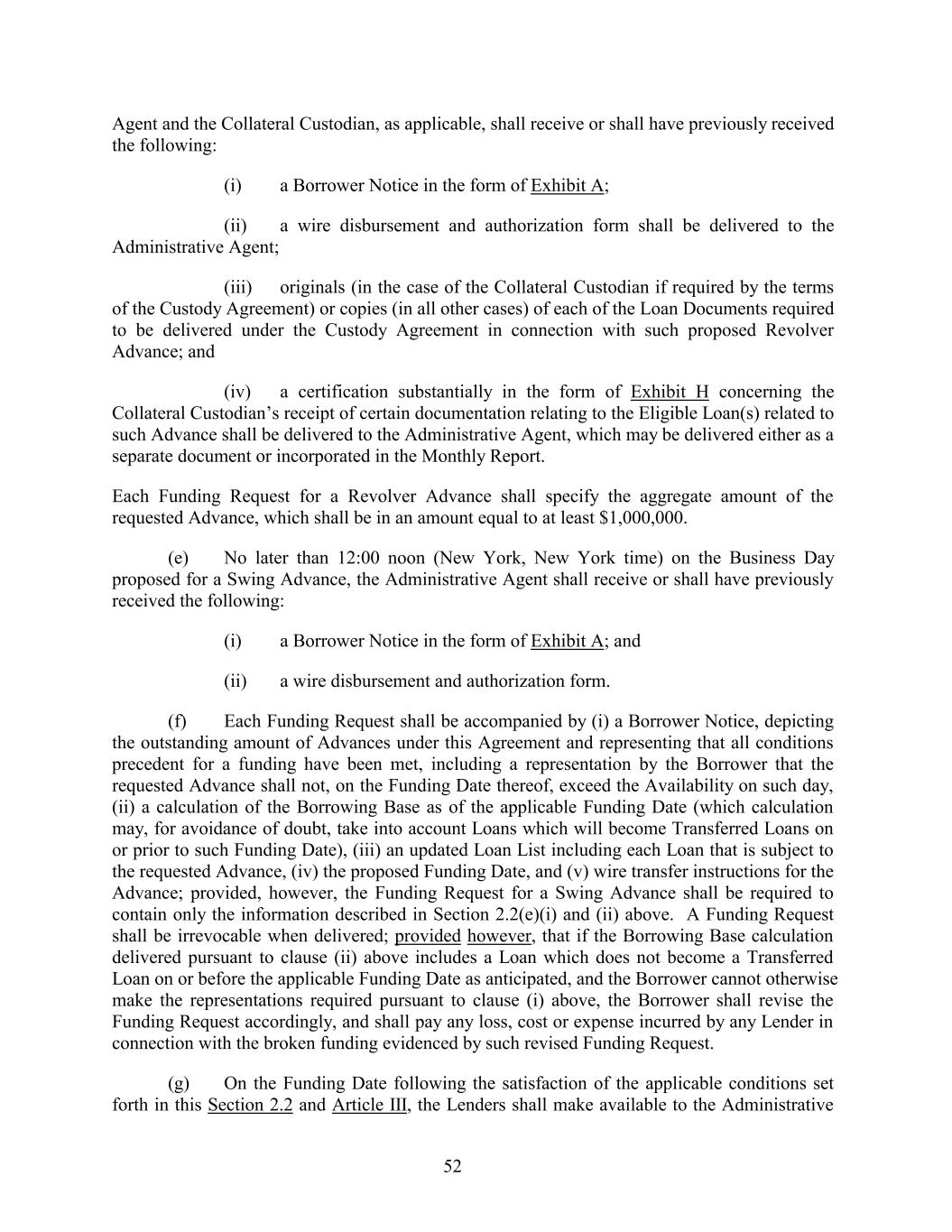 Agent and the Collateral Custodian, as applicable, shall receive or shall have previously received the following: (i) a Borrower Notice in the form of Exhibit A; (ii) a wire disbursement and authorization form shall be delivered to the Administrative Agent; (iii) originals (in the case of the Collateral Custodian if required by the terms of the Custody Agreement) or copies (in all other cases) of each of the Loan Documents required to be delivered under the Custody Agreement in connection with such proposed Revolver Advance; and (iv) a certification substantially in the form of Exhibit H concerning the Collateral Custodian’s receipt of certain documentation relating to the Eligible Loan(s) related to such Advance shall be delivered to the Administrative Agent, which may be delivered either as a separate document or incorporated in the Monthly Report. Each Funding Request for a Revolver Advance shall specify the aggregate amount of the requested Advance, which shall be in an amount equal to at least $1,000,000. (e) No later than 12:00 noon (New York, New York time) on the Business Day proposed for a Swing Advance, the Administrative Agent shall receive or shall have previously received the following: (i) a Borrower Notice in the form of Exhibit A; and (ii) a wire disbursement and authorization form. (f) Each Funding Request shall be accompanied by (i) a Borrower Notice, depicting the outstanding amount of Advances under this Agreement and representing that all conditions precedent for a funding have been met, including a representation by the Borrower that the requested Advance shall not, on the Funding Date thereof, exceed the Availability on such day, (ii) a calculation of the Borrowing Base as of the applicable Funding Date (which calculation may, for avoidance of doubt, take into account Loans which will become Transferred Loans on or prior to such Funding Date), (iii) an updated Loan List including each Loan that is subject to the requested Advance, (iv) the proposed Funding Date, and (v) wire transfer instructions for the Advance; provided, however, the Funding Request for a Swing Advance shall be required to contain only the information described in Section 2.2(e)(i) and (ii) above. A Funding Request shall be irrevocable when delivered; provided however, that if the Borrowing Base calculation delivered pursuant to clause (ii) above includes a Loan which does not become a Transferred Loan on or before the applicable Funding Date as anticipated, and the Borrower cannot otherwise make the representations required pursuant to clause (i) above, the Borrower shall revise the Funding Request accordingly, and shall pay any loss, cost or expense incurred by any Lender in connection with the broken funding evidenced by such revised Funding Request. (g) On the Funding Date following the satisfaction of the applicable conditions set forth in this Section 2.2 and Article III, the Lenders shall make available to the Administrative 52