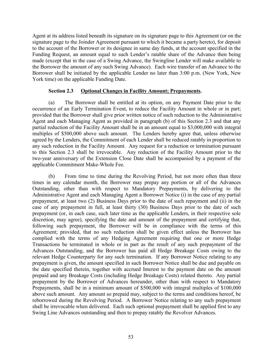 Agent at its address listed beneath its signature on its signature page to this Agreement (or on the signature page to the Joinder Agreement pursuant to which it became a party hereto), for deposit to the account of the Borrower or its designee in same day funds, at the account specified in the Funding Request, an amount equal to such Lender’s ratable share of the Advance then being made (except that in the case of a Swing Advance, the Swingline Lender will make available to the Borrower the amount of any such Swing Advance). Each wire transfer of an Advance to the Borrower shall be initiated by the applicable Lender no later than 3:00 p.m. (New York, New York time) on the applicable Funding Date. Section 2.3 Optional Changes in Facility Amount; Prepayments. (a) The Borrower shall be entitled at its option, on any Payment Date prior to the occurrence of an Early Termination Event, to reduce the Facility Amount in whole or in part; provided that the Borrower shall give prior written notice of such reduction to the Administrative Agent and each Managing Agent as provided in paragraph (b) of this Section 2.3 and that any partial reduction of the Facility Amount shall be in an amount equal to $3,000,000 with integral multiples of $500,000 above such amount. The Lenders hereby agree that, unless otherwise agreed by the Lenders, the Commitment of each Lender shall be reduced ratably in proportion to any such reduction in the Facility Amount. Any request for a reduction or termination pursuant to this Section 2.3 shall be irrevocable. Any reduction of the Facility Amount prior to the two-year anniversary of the Extension Close Date shall be accompanied by a payment of the applicable Commitment Make-Whole Fee. (b) From time to time during the Revolving Period, but not more often than three times in any calendar month, the Borrower may prepay any portion or all of the Advances Outstanding, other than with respect to Mandatory Prepayments, by delivering to the Administrative Agent and each Managing Agent a Borrower Notice (i) in the case of any partial prepayment, at least two (2) Business Days prior to the date of such repayment and (ii) in the case of any prepayment in full, at least thirty (30) Business Days prior to the date of such prepayment (or, in each case, such later time as the applicable Lenders, in their respective sole discretion, may agree), specifying the date and amount of the prepayment and certifying that, following such prepayment, the Borrower will be in compliance with the terms of this Agreement; provided, that no such reduction shall be given effect unless the Borrower has complied with the terms of any Hedging Agreement requiring that one or more Hedge Transactions be terminated in whole or in part as the result of any such prepayment of the Advances Outstanding, and the Borrower has paid all Hedge Breakage Costs owing to the relevant Hedge Counterparty for any such termination. If any Borrower Notice relating to any prepayment is given, the amount specified in such Borrower Notice shall be due and payable on the date specified therein, together with accrued Interest to the payment date on the amount prepaid and any Breakage Costs (including Hedge Breakage Costs) related thereto. Any partial prepayment by the Borrower of Advances hereunder, other than with respect to Mandatory Prepayments, shall be in a minimum amount of $500,000 with integral multiples of $100,000 above such amount. Any amount so prepaid may, subject to the terms and conditions hereof, be reborrowed during the Revolving Period. A Borrower Notice relating to any such prepayment shall be irrevocable when delivered. Each such optional prepayment shall be applied first to any Swing Line Advances outstanding and then to prepay ratably the Revolver Advances. 53