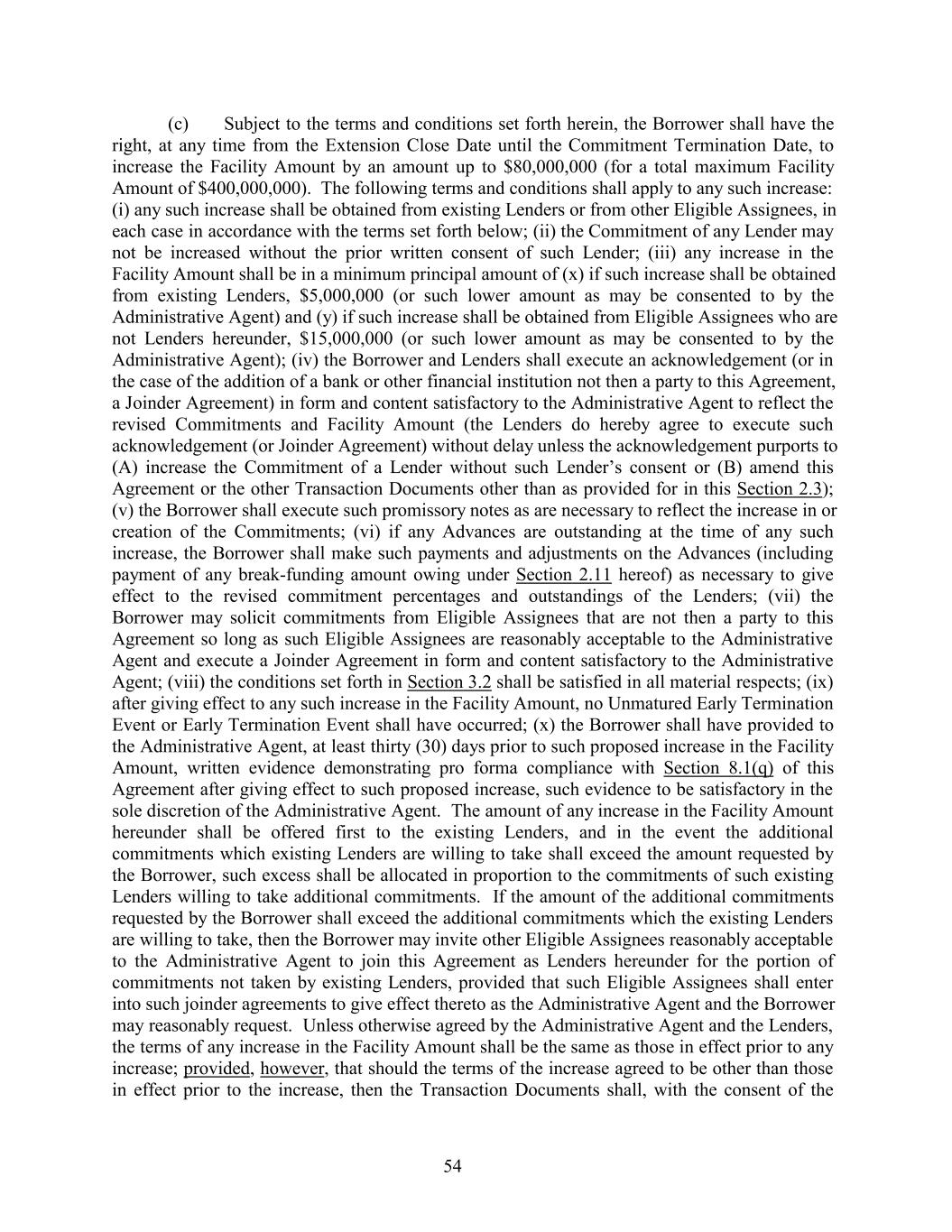 (c) Subject to the terms and conditions set forth herein, the Borrower shall have the right, at any time from the Extension Close Date until the Commitment Termination Date, to increase the Facility Amount by an amount up to $80,000,000 (for a total maximum Facility Amount of $400,000,000). The following terms and conditions shall apply to any such increase: (i) any such increase shall be obtained from existing Lenders or from other Eligible Assignees, in each case in accordance with the terms set forth below; (ii) the Commitment of any Lender may not be increased without the prior written consent of such Lender; (iii) any increase in the Facility Amount shall be in a minimum principal amount of (x) if such increase shall be obtained from existing Lenders, $5,000,000 (or such lower amount as may be consented to by the Administrative Agent) and (y) if such increase shall be obtained from Eligible Assignees who are not Lenders hereunder, $15,000,000 (or such lower amount as may be consented to by the Administrative Agent); (iv) the Borrower and Lenders shall execute an acknowledgement (or in the case of the addition of a bank or other financial institution not then a party to this Agreement, a Joinder Agreement) in form and content satisfactory to the Administrative Agent to reflect the revised Commitments and Facility Amount (the Lenders do hereby agree to execute such acknowledgement (or Joinder Agreement) without delay unless the acknowledgement purports to (A) increase the Commitment of a Lender without such Lender’s consent or (B) amend this Agreement or the other Transaction Documents other than as provided for in this Section 2.3); (v) the Borrower shall execute such promissory notes as are necessary to reflect the increase in or creation of the Commitments; (vi) if any Advances are outstanding at the time of any such increase, the Borrower shall make such payments and adjustments on the Advances (including payment of any break-funding amount owing under Section 2.11 hereof) as necessary to give effect to the revised commitment percentages and outstandings of the Lenders; (vii) the Borrower may solicit commitments from Eligible Assignees that are not then a party to this Agreement so long as such Eligible Assignees are reasonably acceptable to the Administrative Agent and execute a Joinder Agreement in form and content satisfactory to the Administrative Agent; (viii) the conditions set forth in Section 3.2 shall be satisfied in all material respects; (ix) after giving effect to any such increase in the Facility Amount, no Unmatured Early Termination Event or Early Termination Event shall have occurred; (x) the Borrower shall have provided to the Administrative Agent, at least thirty (30) days prior to such proposed increase in the Facility Amount, written evidence demonstrating pro forma compliance with Section 8.1(q) of this Agreement after giving effect to such proposed increase, such evidence to be satisfactory in the sole discretion of the Administrative Agent. The amount of any increase in the Facility Amount hereunder shall be offered first to the existing Lenders, and in the event the additional commitments which existing Lenders are willing to take shall exceed the amount requested by the Borrower, such excess shall be allocated in proportion to the commitments of such existing Lenders willing to take additional commitments. If the amount of the additional commitments requested by the Borrower shall exceed the additional commitments which the existing Lenders are willing to take, then the Borrower may invite other Eligible Assignees reasonably acceptable to the Administrative Agent to join this Agreement as Lenders hereunder for the portion of commitments not taken by existing Lenders, provided that such Eligible Assignees shall enter into such joinder agreements to give effect thereto as the Administrative Agent and the Borrower may reasonably request. Unless otherwise agreed by the Administrative Agent and the Lenders, the terms of any increase in the Facility Amount shall be the same as those in effect prior to any increase; provided, however, that should the terms of the increase agreed to be other than those in effect prior to the increase, then the Transaction Documents shall, with the consent of the 54