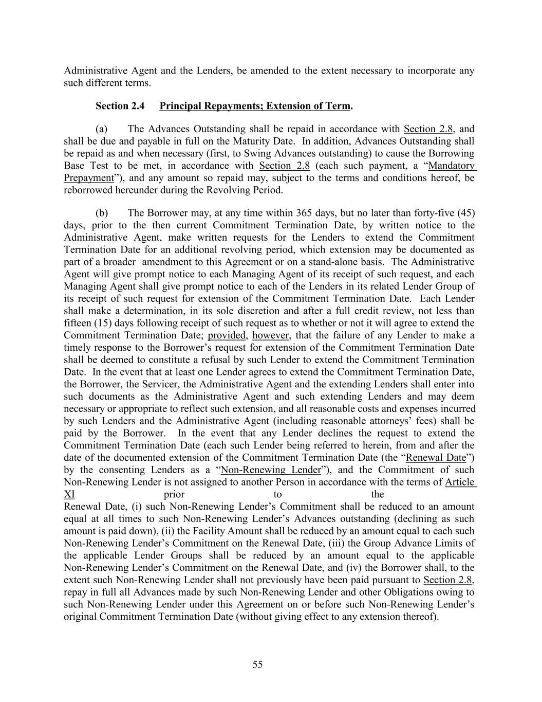 Administrative Agent and the Lenders, be amended to the extent necessary to incorporate any such different terms. Section 2.4 Principal Repayments; Extension of Term. (a) The Advances Outstanding shall be repaid in accordance with Section 2.8, and shall be due and payable in full on the Maturity Date. In addition, Advances Outstanding shall be repaid as and when necessary (first, to Swing Advances outstanding) to cause the Borrowing Base Test to be met, in accordance with Section 2.8 (each such payment, a “Mandatory Prepayment”), and any amount so repaid may, subject to the terms and conditions hereof, be reborrowed hereunder during the Revolving Period. (b) The Borrower may, at any time within 365 days, but no later than forty-five (45) days, prior to the then current Commitment Termination Date, by written notice to the Administrative Agent, make written requests for the Lenders to extend the Commitment Termination Date for an additional revolving period, which extension may be documented as part of a broader amendment to this Agreement or on a stand-alone basis. The Administrative Agent will give prompt notice to each Managing Agent of its receipt of such request, and each Managing Agent shall give prompt notice to each of the Lenders in its related Lender Group of its receipt of such request for extension of the Commitment Termination Date. Each Lender shall make a determination, in its sole discretion and after a full credit review, not less than fifteen (15) days following receipt of such request as to whether or not it will agree to extend the Commitment Termination Date; provided, however, that the failure of any Lender to make a timely response to the Borrower’s request for extension of the Commitment Termination Date shall be deemed to constitute a refusal by such Lender to extend the Commitment Termination Date. In the event that at least one Lender agrees to extend the Commitment Termination Date, the Borrower, the Servicer, the Administrative Agent and the extending Lenders shall enter into such documents as the Administrative Agent and such extending Lenders and may deem necessary or appropriate to reflect such extension, and all reasonable costs and expenses incurred by such Lenders and the Administrative Agent (including reasonable attorneys’ fees) shall be paid by the Borrower. In the event that any Lender declines the request to extend the Commitment Termination Date (each such Lender being referred to herein, from and after the date of the documented extension of the Commitment Termination Date (the “Renewal Date”) by the consenting Lenders as a “Non-Renewing Lender”), and the Commitment of such Non-Renewing Lender is not assigned to another Person in accordance with the terms of Article XI prior to the Renewal Date, (i) such Non-Renewing Lender’s Commitment shall be reduced to an amount equal at all times to such Non-Renewing Lender’s Advances outstanding (declining as such amount is paid down), (ii) the Facility Amount shall be reduced by an amount equal to each such Non-Renewing Lender’s Commitment on the Renewal Date, (iii) the Group Advance Limits of the applicable Lender Groups shall be reduced by an amount equal to the applicable Non-Renewing Lender’s Commitment on the Renewal Date, and (iv) the Borrower shall, to the extent such Non-Renewing Lender shall not previously have been paid pursuant to Section 2.8, repay in full all Advances made by such Non-Renewing Lender and other Obligations owing to such Non-Renewing Lender under this Agreement on or before such Non-Renewing Lender’s original Commitment Termination Date (without giving effect to any extension thereof). 55