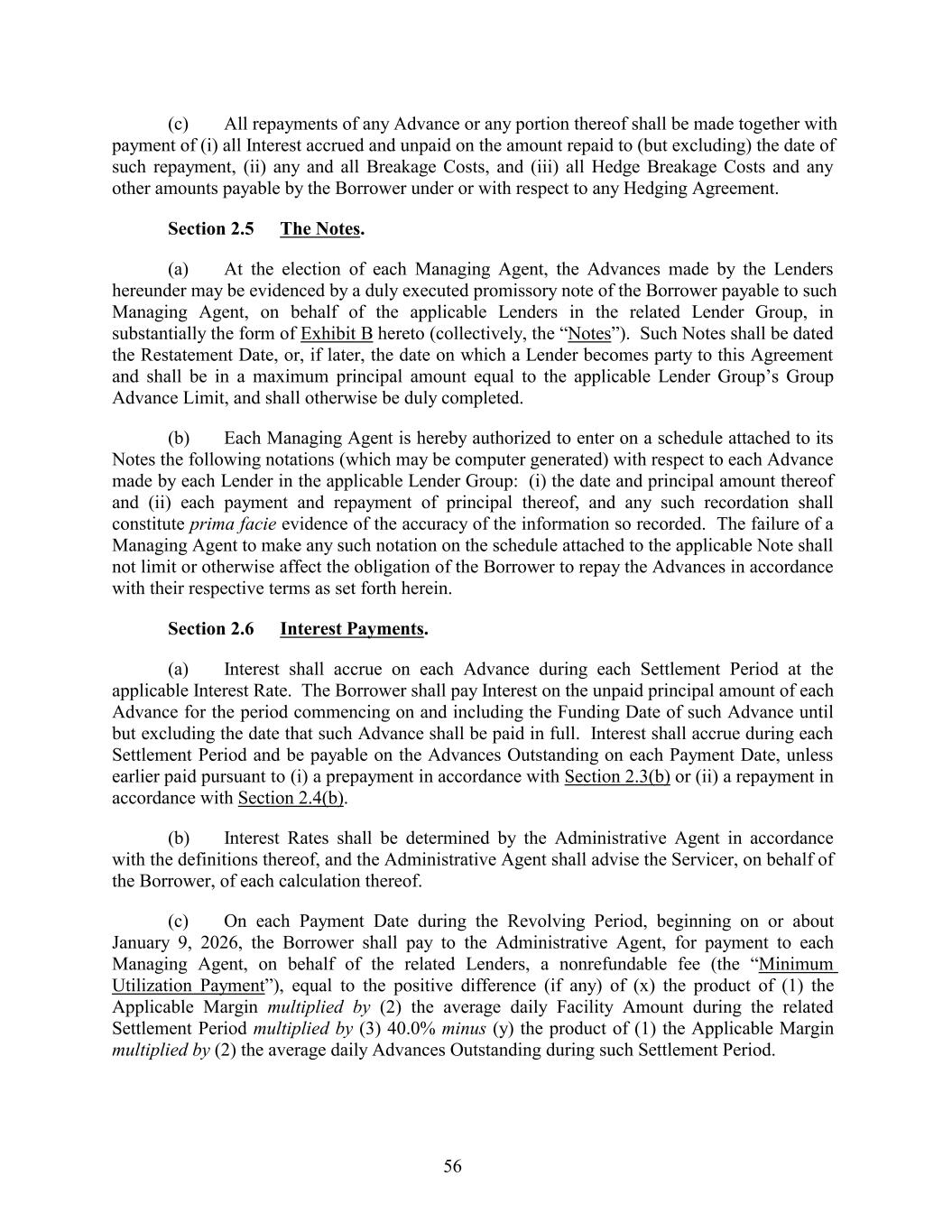 (c) All repayments of any Advance or any portion thereof shall be made together with payment of (i) all Interest accrued and unpaid on the amount repaid to (but excluding) the date of such repayment, (ii) any and all Breakage Costs, and (iii) all Hedge Breakage Costs and any other amounts payable by the Borrower under or with respect to any Hedging Agreement. Section 2.5 The Notes. (a) At the election of each Managing Agent, the Advances made by the Lenders hereunder may be evidenced by a duly executed promissory note of the Borrower payable to such Managing Agent, on behalf of the applicable Lenders in the related Lender Group, in substantially the form of Exhibit B hereto (collectively, the “Notes”). Such Notes shall be dated the Restatement Date, or, if later, the date on which a Lender becomes party to this Agreement and shall be in a maximum principal amount equal to the applicable Lender Group’s Group Advance Limit, and shall otherwise be duly completed. (b) Each Managing Agent is hereby authorized to enter on a schedule attached to its Notes the following notations (which may be computer generated) with respect to each Advance made by each Lender in the applicable Lender Group: (i) the date and principal amount thereof and (ii) each payment and repayment of principal thereof, and any such recordation shall constitute prima facie evidence of the accuracy of the information so recorded. The failure of a Managing Agent to make any such notation on the schedule attached to the applicable Note shall not limit or otherwise affect the obligation of the Borrower to repay the Advances in accordance with their respective terms as set forth herein. Section 2.6 Interest Payments. (a) Interest shall accrue on each Advance during each Settlement Period at the applicable Interest Rate. The Borrower shall pay Interest on the unpaid principal amount of each Advance for the period commencing on and including the Funding Date of such Advance until but excluding the date that such Advance shall be paid in full. Interest shall accrue during each Settlement Period and be payable on the Advances Outstanding on each Payment Date, unless earlier paid pursuant to (i) a prepayment in accordance with Section 2.3(b) or (ii) a repayment in accordance with Section 2.4(b). (b) Interest Rates shall be determined by the Administrative Agent in accordance with the definitions thereof, and the Administrative Agent shall advise the Servicer, on behalf of the Borrower, of each calculation thereof. (c) On each Payment Date during the Revolving Period, beginning on or about January 9, 2026, the Borrower shall pay to the Administrative Agent, for payment to each Managing Agent, on behalf of the related Lenders, a nonrefundable fee (the “Minimum Utilization Payment”), equal to the positive difference (if any) of (x) the product of (1) the Applicable Margin multiplied by (2) the average daily Facility Amount during the related Settlement Period multiplied by (3) 40.0% minus (y) the product of (1) the Applicable Margin multiplied by (2) the average daily Advances Outstanding during such Settlement Period. 56