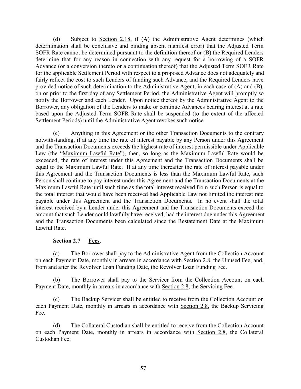 (d) Subject to Section 2.18, if (A) the Administrative Agent determines (which determination shall be conclusive and binding absent manifest error) that the Adjusted Term SOFR Rate cannot be determined pursuant to the definition thereof or (B) the Required Lenders determine that for any reason in connection with any request for a borrowing of a SOFR Advance (or a conversion thereto or a continuation thereof) that the Adjusted Term SOFR Rate for the applicable Settlement Period with respect to a proposed Advance does not adequately and fairly reflect the cost to such Lenders of funding such Advance, and the Required Lenders have provided notice of such determination to the Administrative Agent, in each case of (A) and (B), on or prior to the first day of any Settlement Period, the Administrative Agent will promptly so notify the Borrower and each Lender. Upon notice thereof by the Administrative Agent to the Borrower, any obligation of the Lenders to make or continue Advances bearing interest at a rate based upon the Adjusted Term SOFR Rate shall be suspended (to the extent of the affected Settlement Periods) until the Administrative Agent revokes such notice. (e) Anything in this Agreement or the other Transaction Documents to the contrary notwithstanding, if at any time the rate of interest payable by any Person under this Agreement and the Transaction Documents exceeds the highest rate of interest permissible under Applicable Law (the “Maximum Lawful Rate”), then, so long as the Maximum Lawful Rate would be exceeded, the rate of interest under this Agreement and the Transaction Documents shall be equal to the Maximum Lawful Rate. If at any time thereafter the rate of interest payable under this Agreement and the Transaction Documents is less than the Maximum Lawful Rate, such Person shall continue to pay interest under this Agreement and the Transaction Documents at the Maximum Lawful Rate until such time as the total interest received from such Person is equal to the total interest that would have been received had Applicable Law not limited the interest rate payable under this Agreement and the Transaction Documents. In no event shall the total interest received by a Lender under this Agreement and the Transaction Documents exceed the amount that such Lender could lawfully have received, had the interest due under this Agreement and the Transaction Documents been calculated since the Restatement Date at the Maximum Lawful Rate. Section 2.7 Fees. (a) The Borrower shall pay to the Administrative Agent from the Collection Account on each Payment Date, monthly in arrears in accordance with Section 2.8, the Unused Fee; and, from and after the Revolver Loan Funding Date, the Revolver Loan Funding Fee. (b) The Borrower shall pay to the Servicer from the Collection Account on each Payment Date, monthly in arrears in accordance with Section 2.8, the Servicing Fee. (c) The Backup Servicer shall be entitled to receive from the Collection Account on each Payment Date, monthly in arrears in accordance with Section 2.8, the Backup Servicing Fee. (d) The Collateral Custodian shall be entitled to receive from the Collection Account on each Payment Date, monthly in arrears in accordance with Section 2.8, the Collateral Custodian Fee. 57