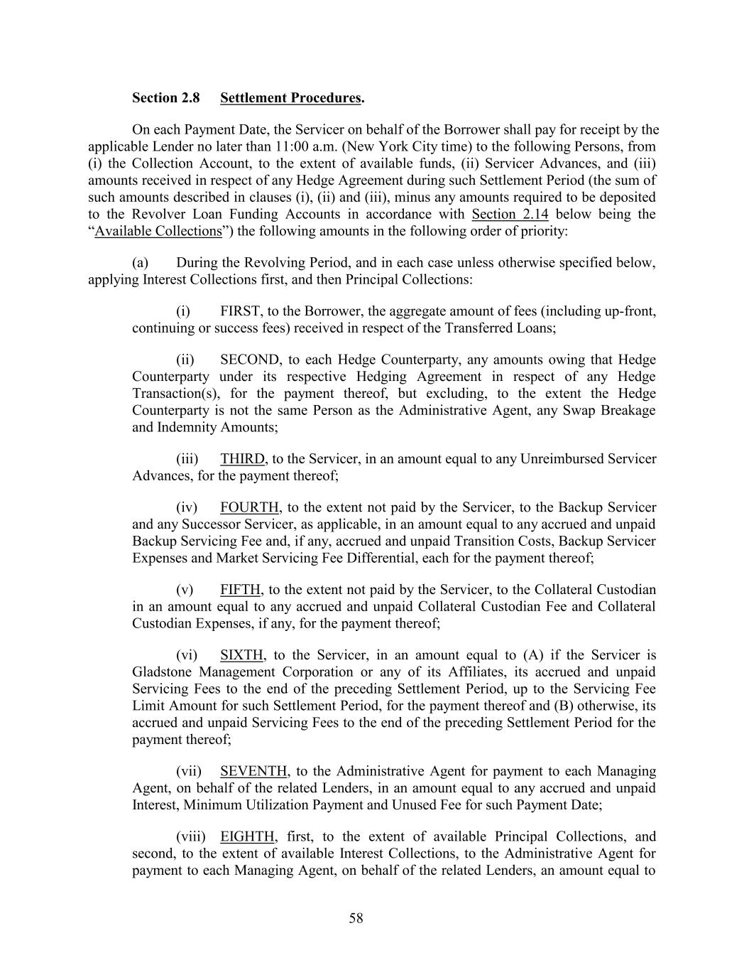 Section 2.8 Settlement Procedures. On each Payment Date, the Servicer on behalf of the Borrower shall pay for receipt by the applicable Lender no later than 11:00 a.m. (New York City time) to the following Persons, from (i) the Collection Account, to the extent of available funds, (ii) Servicer Advances, and (iii) amounts received in respect of any Hedge Agreement during such Settlement Period (the sum of such amounts described in clauses (i), (ii) and (iii), minus any amounts required to be deposited to the Revolver Loan Funding Accounts in accordance with Section 2.14 below being the “Available Collections”) the following amounts in the following order of priority: (a) During the Revolving Period, and in each case unless otherwise specified below, applying Interest Collections first, and then Principal Collections: (i) FIRST, to the Borrower, the aggregate amount of fees (including up-front, continuing or success fees) received in respect of the Transferred Loans; (ii) SECOND, to each Hedge Counterparty, any amounts owing that Hedge Counterparty under its respective Hedging Agreement in respect of any Hedge Transaction(s), for the payment thereof, but excluding, to the extent the Hedge Counterparty is not the same Person as the Administrative Agent, any Swap Breakage and Indemnity Amounts; (iii) THIRD, to the Servicer, in an amount equal to any Unreimbursed Servicer Advances, for the payment thereof; (iv) FOURTH, to the extent not paid by the Servicer, to the Backup Servicer and any Successor Servicer, as applicable, in an amount equal to any accrued and unpaid Backup Servicing Fee and, if any, accrued and unpaid Transition Costs, Backup Servicer Expenses and Market Servicing Fee Differential, each for the payment thereof; (v) FIFTH, to the extent not paid by the Servicer, to the Collateral Custodian in an amount equal to any accrued and unpaid Collateral Custodian Fee and Collateral Custodian Expenses, if any, for the payment thereof; (vi) SIXTH, to the Servicer, in an amount equal to (A) if the Servicer is Gladstone Management Corporation or any of its Affiliates, its accrued and unpaid Servicing Fees to the end of the preceding Settlement Period, up to the Servicing Fee Limit Amount for such Settlement Period, for the payment thereof and (B) otherwise, its accrued and unpaid Servicing Fees to the end of the preceding Settlement Period for the payment thereof; (vii) SEVENTH, to the Administrative Agent for payment to each Managing Agent, on behalf of the related Lenders, in an amount equal to any accrued and unpaid Interest, Minimum Utilization Payment and Unused Fee for such Payment Date; (viii) EIGHTH, first, to the extent of available Principal Collections, and second, to the extent of available Interest Collections, to the Administrative Agent for payment to each Managing Agent, on behalf of the related Lenders, an amount equal to 58