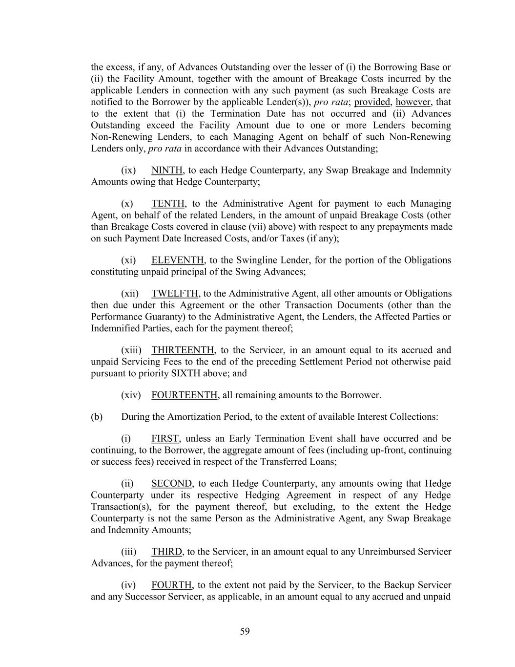 the excess, if any, of Advances Outstanding over the lesser of (i) the Borrowing Base or (ii) the Facility Amount, together with the amount of Breakage Costs incurred by the applicable Lenders in connection with any such payment (as such Breakage Costs are notified to the Borrower by the applicable Lender(s)), pro rata; provided, however, that to the extent that (i) the Termination Date has not occurred and (ii) Advances Outstanding exceed the Facility Amount due to one or more Lenders becoming Non-Renewing Lenders, to each Managing Agent on behalf of such Non-Renewing Lenders only, pro rata in accordance with their Advances Outstanding; (ix) NINTH, to each Hedge Counterparty, any Swap Breakage and Indemnity Amounts owing that Hedge Counterparty; (x) TENTH, to the Administrative Agent for payment to each Managing Agent, on behalf of the related Lenders, in the amount of unpaid Breakage Costs (other than Breakage Costs covered in clause (vii) above) with respect to any prepayments made on such Payment Date Increased Costs, and/or Taxes (if any); (xi) ELEVENTH, to the Swingline Lender, for the portion of the Obligations constituting unpaid principal of the Swing Advances; (xii) TWELFTH, to the Administrative Agent, all other amounts or Obligations then due under this Agreement or the other Transaction Documents (other than the Performance Guaranty) to the Administrative Agent, the Lenders, the Affected Parties or Indemnified Parties, each for the payment thereof; (xiii) THIRTEENTH, to the Servicer, in an amount equal to its accrued and unpaid Servicing Fees to the end of the preceding Settlement Period not otherwise paid pursuant to priority SIXTH above; and (xiv) FOURTEENTH, all remaining amounts to the Borrower. (b) During the Amortization Period, to the extent of available Interest Collections: (i) FIRST, unless an Early Termination Event shall have occurred and be continuing, to the Borrower, the aggregate amount of fees (including up-front, continuing or success fees) received in respect of the Transferred Loans; (ii) SECOND, to each Hedge Counterparty, any amounts owing that Hedge Counterparty under its respective Hedging Agreement in respect of any Hedge Transaction(s), for the payment thereof, but excluding, to the extent the Hedge Counterparty is not the same Person as the Administrative Agent, any Swap Breakage and Indemnity Amounts; (iii) THIRD, to the Servicer, in an amount equal to any Unreimbursed Servicer Advances, for the payment thereof; (iv) FOURTH, to the extent not paid by the Servicer, to the Backup Servicer and any Successor Servicer, as applicable, in an amount equal to any accrued and unpaid 59