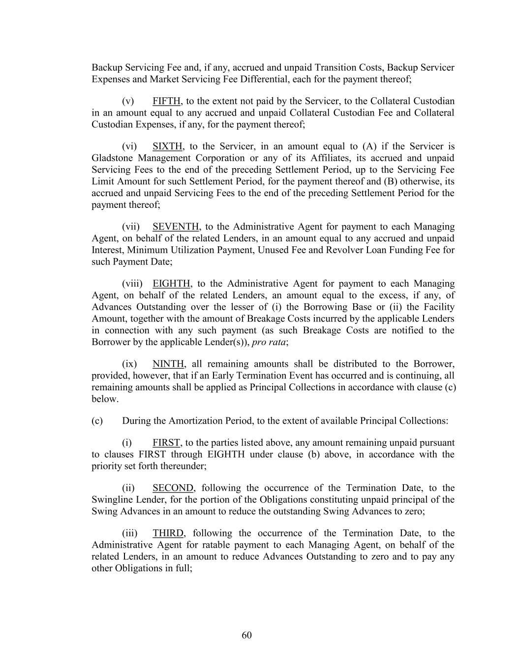 Backup Servicing Fee and, if any, accrued and unpaid Transition Costs, Backup Servicer Expenses and Market Servicing Fee Differential, each for the payment thereof; (v) FIFTH, to the extent not paid by the Servicer, to the Collateral Custodian in an amount equal to any accrued and unpaid Collateral Custodian Fee and Collateral Custodian Expenses, if any, for the payment thereof; (vi) SIXTH, to the Servicer, in an amount equal to (A) if the Servicer is Gladstone Management Corporation or any of its Affiliates, its accrued and unpaid Servicing Fees to the end of the preceding Settlement Period, up to the Servicing Fee Limit Amount for such Settlement Period, for the payment thereof and (B) otherwise, its accrued and unpaid Servicing Fees to the end of the preceding Settlement Period for the payment thereof; (vii) SEVENTH, to the Administrative Agent for payment to each Managing Agent, on behalf of the related Lenders, in an amount equal to any accrued and unpaid Interest, Minimum Utilization Payment, Unused Fee and Revolver Loan Funding Fee for such Payment Date; (viii) EIGHTH, to the Administrative Agent for payment to each Managing Agent, on behalf of the related Lenders, an amount equal to the excess, if any, of Advances Outstanding over the lesser of (i) the Borrowing Base or (ii) the Facility Amount, together with the amount of Breakage Costs incurred by the applicable Lenders in connection with any such payment (as such Breakage Costs are notified to the Borrower by the applicable Lender(s)), pro rata; (ix) NINTH, all remaining amounts shall be distributed to the Borrower, provided, however, that if an Early Termination Event has occurred and is continuing, all remaining amounts shall be applied as Principal Collections in accordance with clause (c) below. (c) During the Amortization Period, to the extent of available Principal Collections: (i) FIRST, to the parties listed above, any amount remaining unpaid pursuant to clauses FIRST through EIGHTH under clause (b) above, in accordance with the priority set forth thereunder; (ii) SECOND, following the occurrence of the Termination Date, to the Swingline Lender, for the portion of the Obligations constituting unpaid principal of the Swing Advances in an amount to reduce the outstanding Swing Advances to zero; (iii) THIRD, following the occurrence of the Termination Date, to the Administrative Agent for ratable payment to each Managing Agent, on behalf of the related Lenders, in an amount to reduce Advances Outstanding to zero and to pay any other Obligations in full; 60