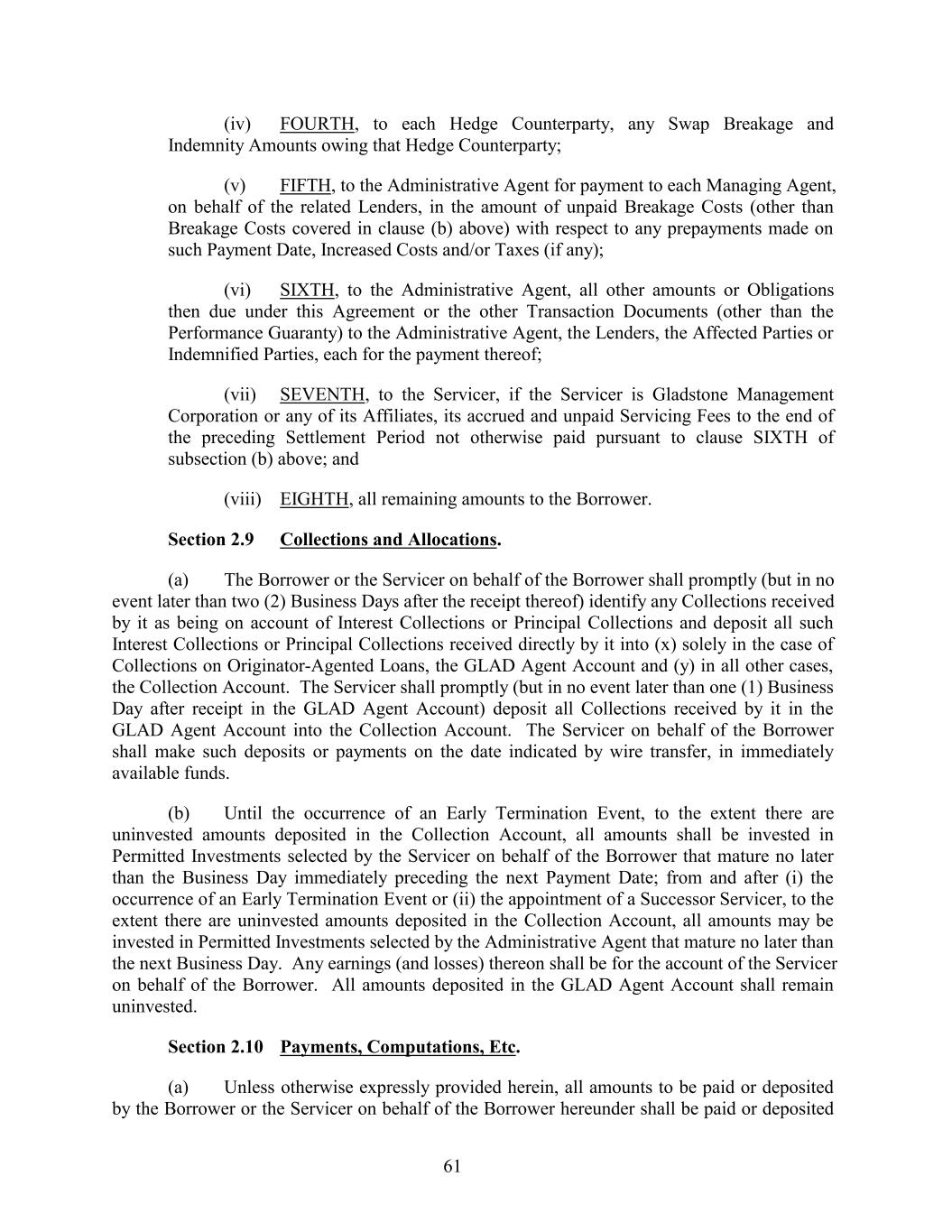 (iv) FOURTH, to each Hedge Counterparty, any Swap Breakage and Indemnity Amounts owing that Hedge Counterparty; (v) FIFTH, to the Administrative Agent for payment to each Managing Agent, on behalf of the related Lenders, in the amount of unpaid Breakage Costs (other than Breakage Costs covered in clause (b) above) with respect to any prepayments made on such Payment Date, Increased Costs and/or Taxes (if any); (vi) SIXTH, to the Administrative Agent, all other amounts or Obligations then due under this Agreement or the other Transaction Documents (other than the Performance Guaranty) to the Administrative Agent, the Lenders, the Affected Parties or Indemnified Parties, each for the payment thereof; (vii) SEVENTH, to the Servicer, if the Servicer is Gladstone Management Corporation or any of its Affiliates, its accrued and unpaid Servicing Fees to the end of the preceding Settlement Period not otherwise paid pursuant to clause SIXTH of subsection (b) above; and (viii) EIGHTH, all remaining amounts to the Borrower. Section 2.9 Collections and Allocations. (a) The Borrower or the Servicer on behalf of the Borrower shall promptly (but in no event later than two (2) Business Days after the receipt thereof) identify any Collections received by it as being on account of Interest Collections or Principal Collections and deposit all such Interest Collections or Principal Collections received directly by it into (x) solely in the case of Collections on Originator-Agented Loans, the GLAD Agent Account and (y) in all other cases, the Collection Account. The Servicer shall promptly (but in no event later than one (1) Business Day after receipt in the GLAD Agent Account) deposit all Collections received by it in the GLAD Agent Account into the Collection Account. The Servicer on behalf of the Borrower shall make such deposits or payments on the date indicated by wire transfer, in immediately available funds. (b) Until the occurrence of an Early Termination Event, to the extent there are uninvested amounts deposited in the Collection Account, all amounts shall be invested in Permitted Investments selected by the Servicer on behalf of the Borrower that mature no later than the Business Day immediately preceding the next Payment Date; from and after (i) the occurrence of an Early Termination Event or (ii) the appointment of a Successor Servicer, to the extent there are uninvested amounts deposited in the Collection Account, all amounts may be invested in Permitted Investments selected by the Administrative Agent that mature no later than the next Business Day. Any earnings (and losses) thereon shall be for the account of the Servicer on behalf of the Borrower. All amounts deposited in the GLAD Agent Account shall remain uninvested. Section 2.10 Payments, Computations, Etc. (a) Unless otherwise expressly provided herein, all amounts to be paid or deposited by the Borrower or the Servicer on behalf of the Borrower hereunder shall be paid or deposited 61
