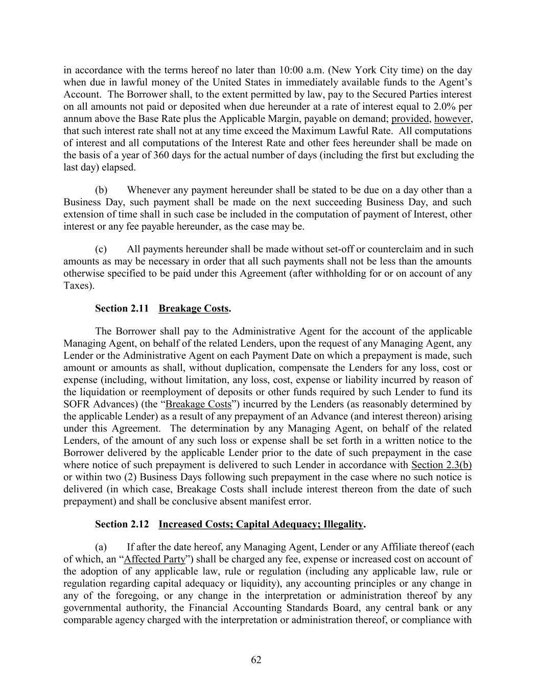in accordance with the terms hereof no later than 10:00 a.m. (New York City time) on the day when due in lawful money of the United States in immediately available funds to the Agent’s Account. The Borrower shall, to the extent permitted by law, pay to the Secured Parties interest on all amounts not paid or deposited when due hereunder at a rate of interest equal to 2.0% per annum above the Base Rate plus the Applicable Margin, payable on demand; provided, however, that such interest rate shall not at any time exceed the Maximum Lawful Rate. All computations of interest and all computations of the Interest Rate and other fees hereunder shall be made on the basis of a year of 360 days for the actual number of days (including the first but excluding the last day) elapsed. (b) Whenever any payment hereunder shall be stated to be due on a day other than a Business Day, such payment shall be made on the next succeeding Business Day, and such extension of time shall in such case be included in the computation of payment of Interest, other interest or any fee payable hereunder, as the case may be. (c) All payments hereunder shall be made without set-off or counterclaim and in such amounts as may be necessary in order that all such payments shall not be less than the amounts otherwise specified to be paid under this Agreement (after withholding for or on account of any Taxes). Section 2.11 Breakage Costs. The Borrower shall pay to the Administrative Agent for the account of the applicable Managing Agent, on behalf of the related Lenders, upon the request of any Managing Agent, any Lender or the Administrative Agent on each Payment Date on which a prepayment is made, such amount or amounts as shall, without duplication, compensate the Lenders for any loss, cost or expense (including, without limitation, any loss, cost, expense or liability incurred by reason of the liquidation or reemployment of deposits or other funds required by such Lender to fund its SOFR Advances) (the “Breakage Costs”) incurred by the Lenders (as reasonably determined by the applicable Lender) as a result of any prepayment of an Advance (and interest thereon) arising under this Agreement. The determination by any Managing Agent, on behalf of the related Lenders, of the amount of any such loss or expense shall be set forth in a written notice to the Borrower delivered by the applicable Lender prior to the date of such prepayment in the case where notice of such prepayment is delivered to such Lender in accordance with Section 2.3(b) or within two (2) Business Days following such prepayment in the case where no such notice is delivered (in which case, Breakage Costs shall include interest thereon from the date of such prepayment) and shall be conclusive absent manifest error. Section 2.12 Increased Costs; Capital Adequacy; Illegality. (a) If after the date hereof, any Managing Agent, Lender or any Affiliate thereof (each of which, an “Affected Party”) shall be charged any fee, expense or increased cost on account of the adoption of any applicable law, rule or regulation (including any applicable law, rule or regulation regarding capital adequacy or liquidity), any accounting principles or any change in any of the foregoing, or any change in the interpretation or administration thereof by any governmental authority, the Financial Accounting Standards Board, any central bank or any comparable agency charged with the interpretation or administration thereof, or compliance with 62