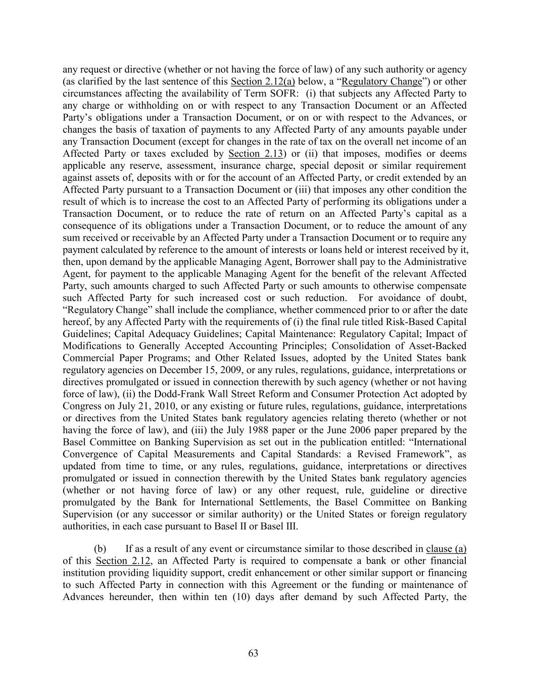 any request or directive (whether or not having the force of law) of any such authority or agency (as clarified by the last sentence of this Section 2.12(a) below, a “Regulatory Change”) or other circumstances affecting the availability of Term SOFR: (i) that subjects any Affected Party to any charge or withholding on or with respect to any Transaction Document or an Affected Party’s obligations under a Transaction Document, or on or with respect to the Advances, or changes the basis of taxation of payments to any Affected Party of any amounts payable under any Transaction Document (except for changes in the rate of tax on the overall net income of an Affected Party or taxes excluded by Section 2.13) or (ii) that imposes, modifies or deems applicable any reserve, assessment, insurance charge, special deposit or similar requirement against assets of, deposits with or for the account of an Affected Party, or credit extended by an Affected Party pursuant to a Transaction Document or (iii) that imposes any other condition the result of which is to increase the cost to an Affected Party of performing its obligations under a Transaction Document, or to reduce the rate of return on an Affected Party’s capital as a consequence of its obligations under a Transaction Document, or to reduce the amount of any sum received or receivable by an Affected Party under a Transaction Document or to require any payment calculated by reference to the amount of interests or loans held or interest received by it, then, upon demand by the applicable Managing Agent, Borrower shall pay to the Administrative Agent, for payment to the applicable Managing Agent for the benefit of the relevant Affected Party, such amounts charged to such Affected Party or such amounts to otherwise compensate such Affected Party for such increased cost or such reduction. For avoidance of doubt, “Regulatory Change” shall include the compliance, whether commenced prior to or after the date hereof, by any Affected Party with the requirements of (i) the final rule titled Risk-Based Capital Guidelines; Capital Adequacy Guidelines; Capital Maintenance: Regulatory Capital; Impact of Modifications to Generally Accepted Accounting Principles; Consolidation of Asset-Backed Commercial Paper Programs; and Other Related Issues, adopted by the United States bank regulatory agencies on December 15, 2009, or any rules, regulations, guidance, interpretations or directives promulgated or issued in connection therewith by such agency (whether or not having force of law), (ii) the Dodd-Frank Wall Street Reform and Consumer Protection Act adopted by Congress on July 21, 2010, or any existing or future rules, regulations, guidance, interpretations or directives from the United States bank regulatory agencies relating thereto (whether or not having the force of law), and (iii) the July 1988 paper or the June 2006 paper prepared by the Basel Committee on Banking Supervision as set out in the publication entitled: “International Convergence of Capital Measurements and Capital Standards: a Revised Framework”, as updated from time to time, or any rules, regulations, guidance, interpretations or directives promulgated or issued in connection therewith by the United States bank regulatory agencies (whether or not having force of law) or any other request, rule, guideline or directive promulgated by the Bank for International Settlements, the Basel Committee on Banking Supervision (or any successor or similar authority) or the United States or foreign regulatory authorities, in each case pursuant to Basel II or Basel III. (b) If as a result of any event or circumstance similar to those described in clause (a) of this Section 2.12, an Affected Party is required to compensate a bank or other financial institution providing liquidity support, credit enhancement or other similar support or financing to such Affected Party in connection with this Agreement or the funding or maintenance of Advances hereunder, then within ten (10) days after demand by such Affected Party, the 63