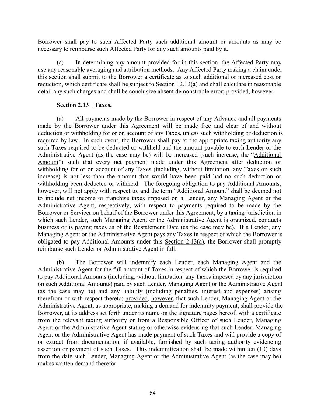 Borrower shall pay to such Affected Party such additional amount or amounts as may be necessary to reimburse such Affected Party for any such amounts paid by it. (c) In determining any amount provided for in this section, the Affected Party may use any reasonable averaging and attribution methods. Any Affected Party making a claim under this section shall submit to the Borrower a certificate as to such additional or increased cost or reduction, which certificate shall be subject to Section 12.12(a) and shall calculate in reasonable detail any such charges and shall be conclusive absent demonstrable error; provided, however. Section 2.13 Taxes. (a) All payments made by the Borrower in respect of any Advance and all payments made by the Borrower under this Agreement will be made free and clear of and without deduction or withholding for or on account of any Taxes, unless such withholding or deduction is required by law. In such event, the Borrower shall pay to the appropriate taxing authority any such Taxes required to be deducted or withheld and the amount payable to each Lender or the Administrative Agent (as the case may be) will be increased (such increase, the “Additional Amount”) such that every net payment made under this Agreement after deduction or withholding for or on account of any Taxes (including, without limitation, any Taxes on such increase) is not less than the amount that would have been paid had no such deduction or withholding been deducted or withheld. The foregoing obligation to pay Additional Amounts, however, will not apply with respect to, and the term “Additional Amount” shall be deemed not to include net income or franchise taxes imposed on a Lender, any Managing Agent or the Administrative Agent, respectively, with respect to payments required to be made by the Borrower or Servicer on behalf of the Borrower under this Agreement, by a taxing jurisdiction in which such Lender, such Managing Agent or the Administrative Agent is organized, conducts business or is paying taxes as of the Restatement Date (as the case may be). If a Lender, any Managing Agent or the Administrative Agent pays any Taxes in respect of which the Borrower is obligated to pay Additional Amounts under this Section 2.13(a), the Borrower shall promptly reimburse such Lender or Administrative Agent in full. (b) The Borrower will indemnify each Lender, each Managing Agent and the Administrative Agent for the full amount of Taxes in respect of which the Borrower is required to pay Additional Amounts (including, without limitation, any Taxes imposed by any jurisdiction on such Additional Amounts) paid by such Lender, Managing Agent or the Administrative Agent (as the case may be) and any liability (including penalties, interest and expenses) arising therefrom or with respect thereto; provided, however, that such Lender, Managing Agent or the Administrative Agent, as appropriate, making a demand for indemnity payment, shall provide the Borrower, at its address set forth under its name on the signature pages hereof, with a certificate from the relevant taxing authority or from a Responsible Officer of such Lender, Managing Agent or the Administrative Agent stating or otherwise evidencing that such Lender, Managing Agent or the Administrative Agent has made payment of such Taxes and will provide a copy of or extract from documentation, if available, furnished by such taxing authority evidencing assertion or payment of such Taxes. This indemnification shall be made within ten (10) days from the date such Lender, Managing Agent or the Administrative Agent (as the case may be) makes written demand therefor. 64