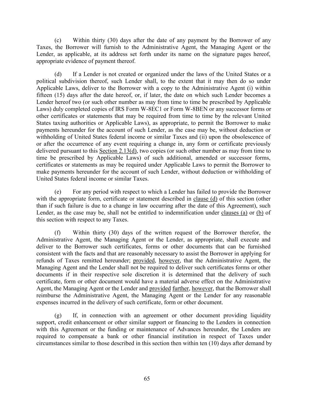 (c) Within thirty (30) days after the date of any payment by the Borrower of any Taxes, the Borrower will furnish to the Administrative Agent, the Managing Agent or the Lender, as applicable, at its address set forth under its name on the signature pages hereof, appropriate evidence of payment thereof. (d) If a Lender is not created or organized under the laws of the United States or a political subdivision thereof, such Lender shall, to the extent that it may then do so under Applicable Laws, deliver to the Borrower with a copy to the Administrative Agent (i) within fifteen (15) days after the date hereof, or, if later, the date on which such Lender becomes a Lender hereof two (or such other number as may from time to time be prescribed by Applicable Laws) duly completed copies of IRS Form W-8EC1 or Form W-8BEN or any successor forms or other certificates or statements that may be required from time to time by the relevant United States taxing authorities or Applicable Laws), as appropriate, to permit the Borrower to make payments hereunder for the account of such Lender, as the case may be, without deduction or withholding of United States federal income or similar Taxes and (ii) upon the obsolescence of or after the occurrence of any event requiring a change in, any form or certificate previously delivered pursuant to this Section 2.13(d), two copies (or such other number as may from time to time be prescribed by Applicable Laws) of such additional, amended or successor forms, certificates or statements as may be required under Applicable Laws to permit the Borrower to make payments hereunder for the account of such Lender, without deduction or withholding of United States federal income or similar Taxes. (e) For any period with respect to which a Lender has failed to provide the Borrower with the appropriate form, certificate or statement described in clause (d) of this section (other than if such failure is due to a change in law occurring after the date of this Agreement), such Lender, as the case may be, shall not be entitled to indemnification under clauses (a) or (b) of this section with respect to any Taxes. (f) Within thirty (30) days of the written request of the Borrower therefor, the Administrative Agent, the Managing Agent or the Lender, as appropriate, shall execute and deliver to the Borrower such certificates, forms or other documents that can be furnished consistent with the facts and that are reasonably necessary to assist the Borrower in applying for refunds of Taxes remitted hereunder; provided, however, that the Administrative Agent, the Managing Agent and the Lender shall not be required to deliver such certificates forms or other documents if in their respective sole discretion it is determined that the delivery of such certificate, form or other document would have a material adverse effect on the Administrative Agent, the Managing Agent or the Lender and provided further, however, that the Borrower shall reimburse the Administrative Agent, the Managing Agent or the Lender for any reasonable expenses incurred in the delivery of such certificate, form or other document. (g) If, in connection with an agreement or other document providing liquidity support, credit enhancement or other similar support or financing to the Lenders in connection with this Agreement or the funding or maintenance of Advances hereunder, the Lenders are required to compensate a bank or other financial institution in respect of Taxes under circumstances similar to those described in this section then within ten (10) days after demand by 65