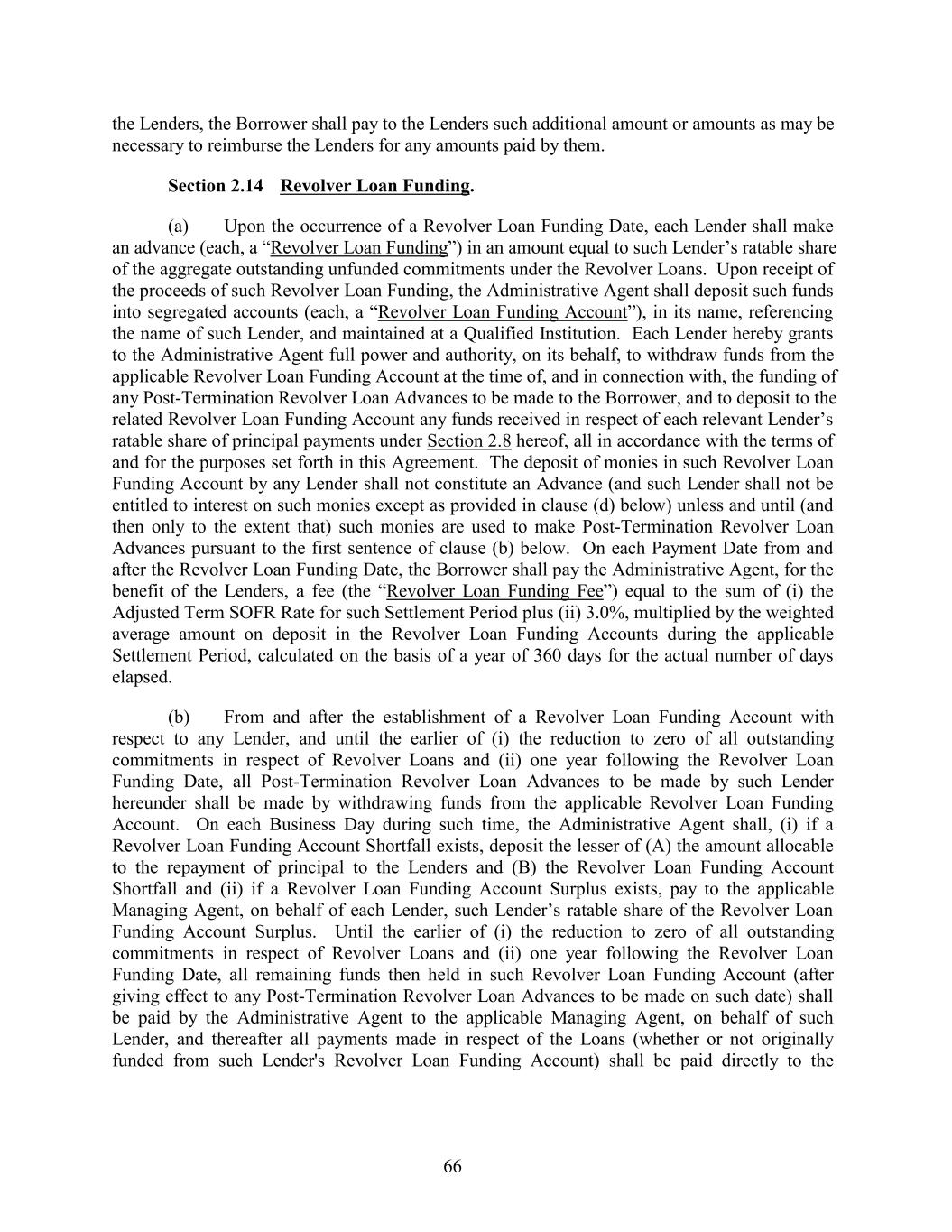 the Lenders, the Borrower shall pay to the Lenders such additional amount or amounts as may be necessary to reimburse the Lenders for any amounts paid by them. Section 2.14 Revolver Loan Funding. (a) Upon the occurrence of a Revolver Loan Funding Date, each Lender shall make an advance (each, a “Revolver Loan Funding”) in an amount equal to such Lender’s ratable share of the aggregate outstanding unfunded commitments under the Revolver Loans. Upon receipt of the proceeds of such Revolver Loan Funding, the Administrative Agent shall deposit such funds into segregated accounts (each, a “Revolver Loan Funding Account”), in its name, referencing the name of such Lender, and maintained at a Qualified Institution. Each Lender hereby grants to the Administrative Agent full power and authority, on its behalf, to withdraw funds from the applicable Revolver Loan Funding Account at the time of, and in connection with, the funding of any Post-Termination Revolver Loan Advances to be made to the Borrower, and to deposit to the related Revolver Loan Funding Account any funds received in respect of each relevant Lender’s ratable share of principal payments under Section 2.8 hereof, all in accordance with the terms of and for the purposes set forth in this Agreement. The deposit of monies in such Revolver Loan Funding Account by any Lender shall not constitute an Advance (and such Lender shall not be entitled to interest on such monies except as provided in clause (d) below) unless and until (and then only to the extent that) such monies are used to make Post-Termination Revolver Loan Advances pursuant to the first sentence of clause (b) below. On each Payment Date from and after the Revolver Loan Funding Date, the Borrower shall pay the Administrative Agent, for the benefit of the Lenders, a fee (the “Revolver Loan Funding Fee”) equal to the sum of (i) the Adjusted Term SOFR Rate for such Settlement Period plus (ii) 3.0%, multiplied by the weighted average amount on deposit in the Revolver Loan Funding Accounts during the applicable Settlement Period, calculated on the basis of a year of 360 days for the actual number of days elapsed. (b) From and after the establishment of a Revolver Loan Funding Account with respect to any Lender, and until the earlier of (i) the reduction to zero of all outstanding commitments in respect of Revolver Loans and (ii) one year following the Revolver Loan Funding Date, all Post-Termination Revolver Loan Advances to be made by such Lender hereunder shall be made by withdrawing funds from the applicable Revolver Loan Funding Account. On each Business Day during such time, the Administrative Agent shall, (i) if a Revolver Loan Funding Account Shortfall exists, deposit the lesser of (A) the amount allocable to the repayment of principal to the Lenders and (B) the Revolver Loan Funding Account Shortfall and (ii) if a Revolver Loan Funding Account Surplus exists, pay to the applicable Managing Agent, on behalf of each Lender, such Lender’s ratable share of the Revolver Loan Funding Account Surplus. Until the earlier of (i) the reduction to zero of all outstanding commitments in respect of Revolver Loans and (ii) one year following the Revolver Loan Funding Date, all remaining funds then held in such Revolver Loan Funding Account (after giving effect to any Post-Termination Revolver Loan Advances to be made on such date) shall be paid by the Administrative Agent to the applicable Managing Agent, on behalf of such Lender, and thereafter all payments made in respect of the Loans (whether or not originally funded from such Lender's Revolver Loan Funding Account) shall be paid directly to the 66
