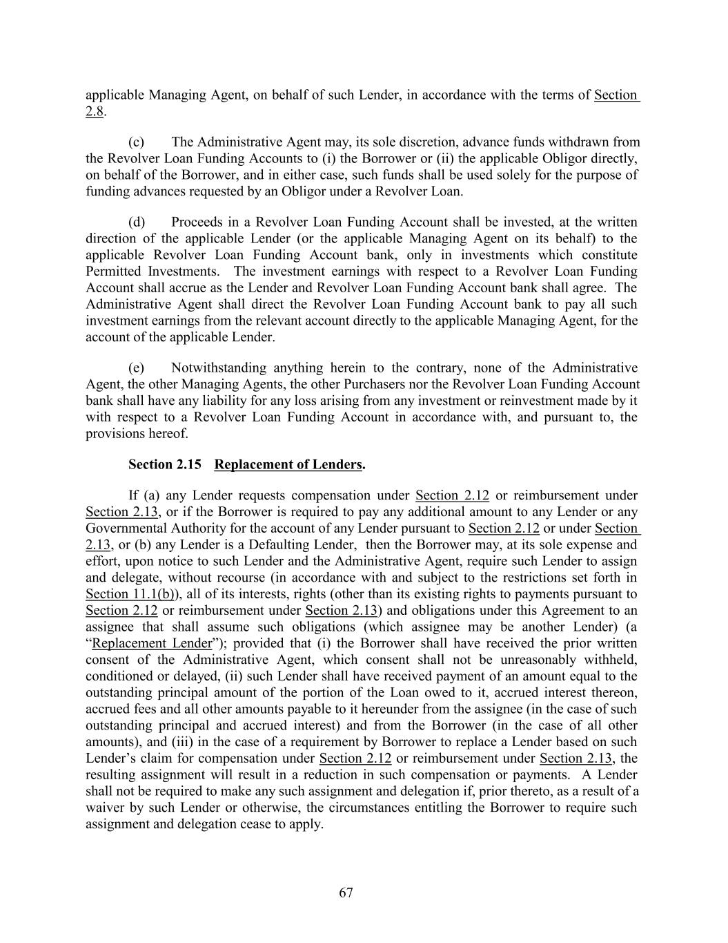 applicable Managing Agent, on behalf of such Lender, in accordance with the terms of Section 2.8. (c) The Administrative Agent may, its sole discretion, advance funds withdrawn from the Revolver Loan Funding Accounts to (i) the Borrower or (ii) the applicable Obligor directly, on behalf of the Borrower, and in either case, such funds shall be used solely for the purpose of funding advances requested by an Obligor under a Revolver Loan. (d) Proceeds in a Revolver Loan Funding Account shall be invested, at the written direction of the applicable Lender (or the applicable Managing Agent on its behalf) to the applicable Revolver Loan Funding Account bank, only in investments which constitute Permitted Investments. The investment earnings with respect to a Revolver Loan Funding Account shall accrue as the Lender and Revolver Loan Funding Account bank shall agree. The Administrative Agent shall direct the Revolver Loan Funding Account bank to pay all such investment earnings from the relevant account directly to the applicable Managing Agent, for the account of the applicable Lender. (e) Notwithstanding anything herein to the contrary, none of the Administrative Agent, the other Managing Agents, the other Purchasers nor the Revolver Loan Funding Account bank shall have any liability for any loss arising from any investment or reinvestment made by it with respect to a Revolver Loan Funding Account in accordance with, and pursuant to, the provisions hereof. Section 2.15 Replacement of Lenders. If (a) any Lender requests compensation under Section 2.12 or reimbursement under Section 2.13, or if the Borrower is required to pay any additional amount to any Lender or any Governmental Authority for the account of any Lender pursuant to Section 2.12 or under Section 2.13, or (b) any Lender is a Defaulting Lender, then the Borrower may, at its sole expense and effort, upon notice to such Lender and the Administrative Agent, require such Lender to assign and delegate, without recourse (in accordance with and subject to the restrictions set forth in Section 11.1(b)), all of its interests, rights (other than its existing rights to payments pursuant to Section 2.12 or reimbursement under Section 2.13) and obligations under this Agreement to an assignee that shall assume such obligations (which assignee may be another Lender) (a “Replacement Lender”); provided that (i) the Borrower shall have received the prior written consent of the Administrative Agent, which consent shall not be unreasonably withheld, conditioned or delayed, (ii) such Lender shall have received payment of an amount equal to the outstanding principal amount of the portion of the Loan owed to it, accrued interest thereon, accrued fees and all other amounts payable to it hereunder from the assignee (in the case of such outstanding principal and accrued interest) and from the Borrower (in the case of all other amounts), and (iii) in the case of a requirement by Borrower to replace a Lender based on such Lender’s claim for compensation under Section 2.12 or reimbursement under Section 2.13, the resulting assignment will result in a reduction in such compensation or payments. A Lender shall not be required to make any such assignment and delegation if, prior thereto, as a result of a waiver by such Lender or otherwise, the circumstances entitling the Borrower to require such assignment and delegation cease to apply. 67