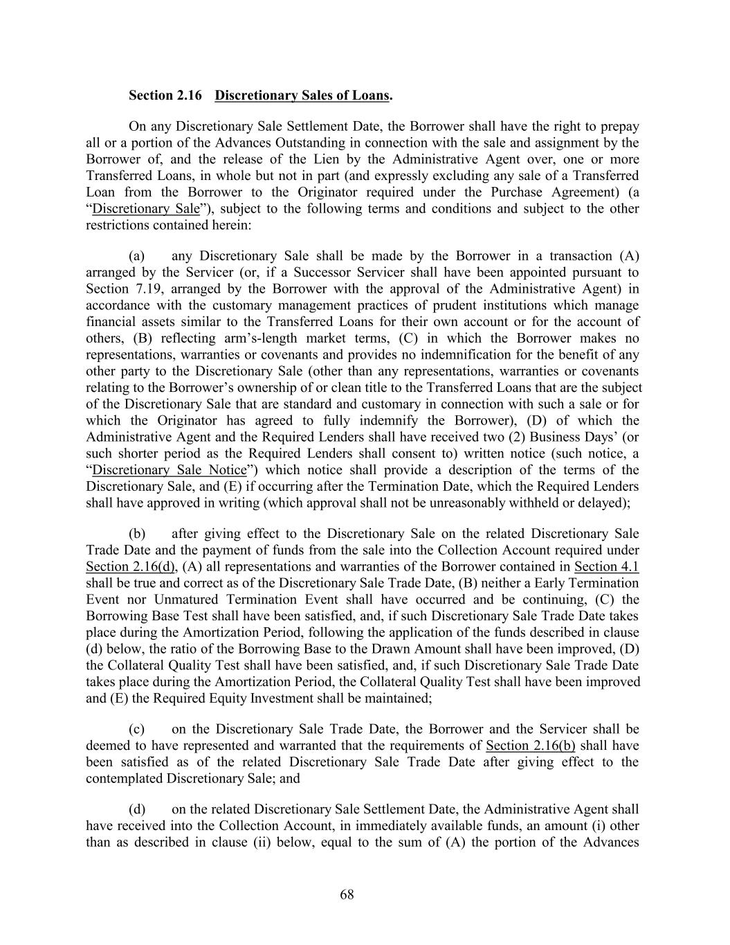 Section 2.16 Discretionary Sales of Loans. On any Discretionary Sale Settlement Date, the Borrower shall have the right to prepay all or a portion of the Advances Outstanding in connection with the sale and assignment by the Borrower of, and the release of the Lien by the Administrative Agent over, one or more Transferred Loans, in whole but not in part (and expressly excluding any sale of a Transferred Loan from the Borrower to the Originator required under the Purchase Agreement) (a “Discretionary Sale”), subject to the following terms and conditions and subject to the other restrictions contained herein: (a) any Discretionary Sale shall be made by the Borrower in a transaction (A) arranged by the Servicer (or, if a Successor Servicer shall have been appointed pursuant to Section 7.19, arranged by the Borrower with the approval of the Administrative Agent) in accordance with the customary management practices of prudent institutions which manage financial assets similar to the Transferred Loans for their own account or for the account of others, (B) reflecting arm’s-length market terms, (C) in which the Borrower makes no representations, warranties or covenants and provides no indemnification for the benefit of any other party to the Discretionary Sale (other than any representations, warranties or covenants relating to the Borrower’s ownership of or clean title to the Transferred Loans that are the subject of the Discretionary Sale that are standard and customary in connection with such a sale or for which the Originator has agreed to fully indemnify the Borrower), (D) of which the Administrative Agent and the Required Lenders shall have received two (2) Business Days’ (or such shorter period as the Required Lenders shall consent to) written notice (such notice, a “Discretionary Sale Notice”) which notice shall provide a description of the terms of the Discretionary Sale, and (E) if occurring after the Termination Date, which the Required Lenders shall have approved in writing (which approval shall not be unreasonably withheld or delayed); (b) after giving effect to the Discretionary Sale on the related Discretionary Sale Trade Date and the payment of funds from the sale into the Collection Account required under Section 2.16(d), (A) all representations and warranties of the Borrower contained in Section 4.1 shall be true and correct as of the Discretionary Sale Trade Date, (B) neither a Early Termination Event nor Unmatured Termination Event shall have occurred and be continuing, (C) the Borrowing Base Test shall have been satisfied, and, if such Discretionary Sale Trade Date takes place during the Amortization Period, following the application of the funds described in clause (d) below, the ratio of the Borrowing Base to the Drawn Amount shall have been improved, (D) the Collateral Quality Test shall have been satisfied, and, if such Discretionary Sale Trade Date takes place during the Amortization Period, the Collateral Quality Test shall have been improved and (E) the Required Equity Investment shall be maintained; (c) on the Discretionary Sale Trade Date, the Borrower and the Servicer shall be deemed to have represented and warranted that the requirements of Section 2.16(b) shall have been satisfied as of the related Discretionary Sale Trade Date after giving effect to the contemplated Discretionary Sale; and (d) on the related Discretionary Sale Settlement Date, the Administrative Agent shall have received into the Collection Account, in immediately available funds, an amount (i) other than as described in clause (ii) below, equal to the sum of (A) the portion of the Advances 68