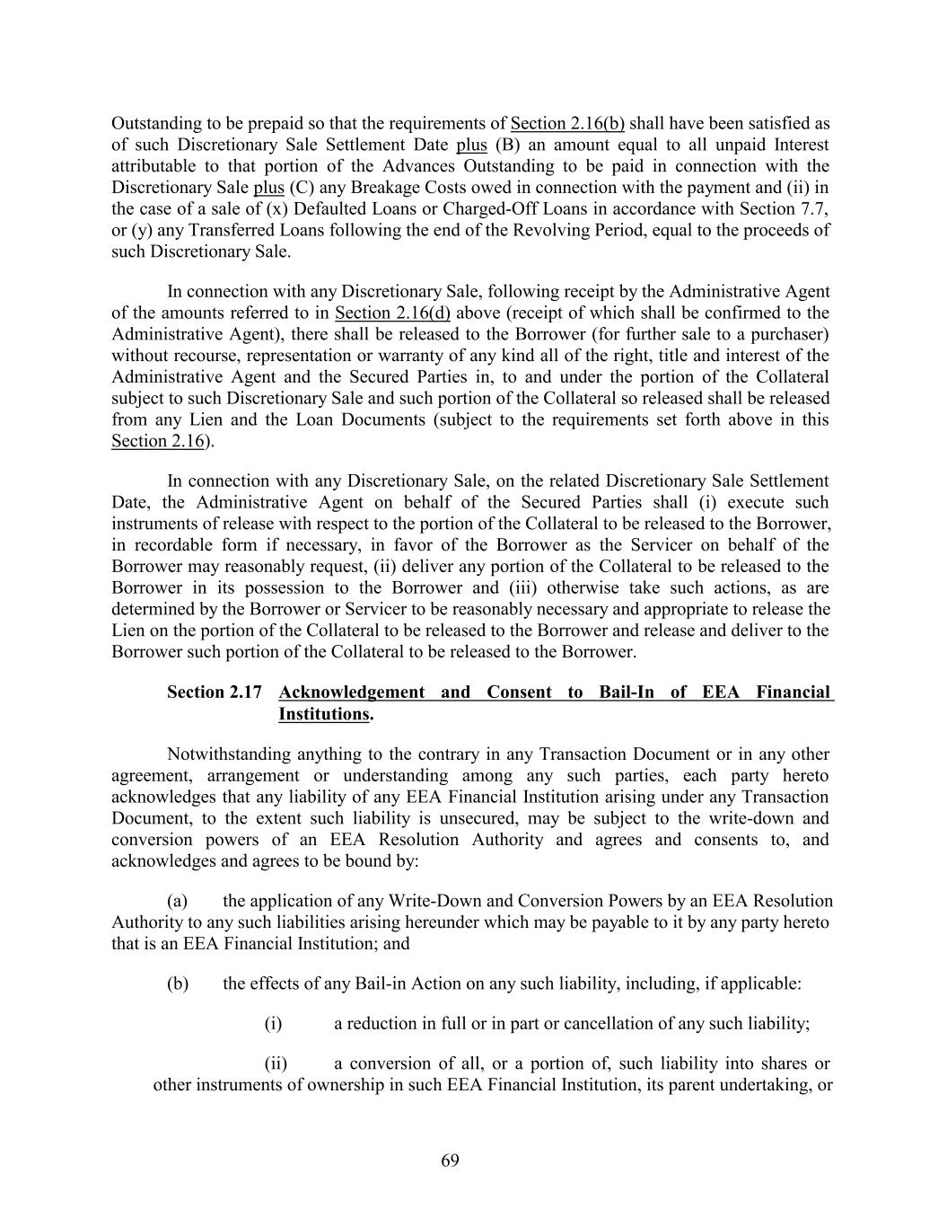 Outstanding to be prepaid so that the requirements of Section 2.16(b) shall have been satisfied as of such Discretionary Sale Settlement Date plus (B) an amount equal to all unpaid Interest attributable to that portion of the Advances Outstanding to be paid in connection with the Discretionary Sale plus (C) any Breakage Costs owed in connection with the payment and (ii) in the case of a sale of (x) Defaulted Loans or Charged-Off Loans in accordance with Section 7.7, or (y) any Transferred Loans following the end of the Revolving Period, equal to the proceeds of such Discretionary Sale. In connection with any Discretionary Sale, following receipt by the Administrative Agent of the amounts referred to in Section 2.16(d) above (receipt of which shall be confirmed to the Administrative Agent), there shall be released to the Borrower (for further sale to a purchaser) without recourse, representation or warranty of any kind all of the right, title and interest of the Administrative Agent and the Secured Parties in, to and under the portion of the Collateral subject to such Discretionary Sale and such portion of the Collateral so released shall be released from any Lien and the Loan Documents (subject to the requirements set forth above in this Section 2.16). In connection with any Discretionary Sale, on the related Discretionary Sale Settlement Date, the Administrative Agent on behalf of the Secured Parties shall (i) execute such instruments of release with respect to the portion of the Collateral to be released to the Borrower, in recordable form if necessary, in favor of the Borrower as the Servicer on behalf of the Borrower may reasonably request, (ii) deliver any portion of the Collateral to be released to the Borrower in its possession to the Borrower and (iii) otherwise take such actions, as are determined by the Borrower or Servicer to be reasonably necessary and appropriate to release the Lien on the portion of the Collateral to be released to the Borrower and release and deliver to the Borrower such portion of the Collateral to be released to the Borrower. Section 2.17 Acknowledgement and Consent to Bail-In of EEA Financial Institutions. Notwithstanding anything to the contrary in any Transaction Document or in any other agreement, arrangement or understanding among any such parties, each party hereto acknowledges that any liability of any EEA Financial Institution arising under any Transaction Document, to the extent such liability is unsecured, may be subject to the write-down and conversion powers of an EEA Resolution Authority and agrees and consents to, and acknowledges and agrees to be bound by: (a) the application of any Write-Down and Conversion Powers by an EEA Resolution Authority to any such liabilities arising hereunder which may be payable to it by any party hereto that is an EEA Financial Institution; and (b) the effects of any Bail-in Action on any such liability, including, if applicable: (i) a reduction in full or in part or cancellation of any such liability; (ii) a conversion of all, or a portion of, such liability into shares or other instruments of ownership in such EEA Financial Institution, its parent undertaking, or 69