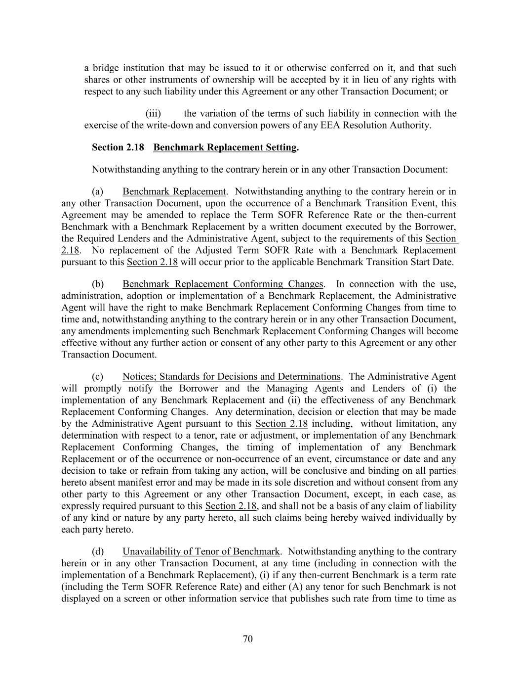 a bridge institution that may be issued to it or otherwise conferred on it, and that such shares or other instruments of ownership will be accepted by it in lieu of any rights with respect to any such liability under this Agreement or any other Transaction Document; or (iii) the variation of the terms of such liability in connection with the exercise of the write-down and conversion powers of any EEA Resolution Authority. Section 2.18 Benchmark Replacement Setting. Notwithstanding anything to the contrary herein or in any other Transaction Document: (a) Benchmark Replacement. Notwithstanding anything to the contrary herein or in any other Transaction Document, upon the occurrence of a Benchmark Transition Event, this Agreement may be amended to replace the Term SOFR Reference Rate or the then-current Benchmark with a Benchmark Replacement by a written document executed by the Borrower, the Required Lenders and the Administrative Agent, subject to the requirements of this Section 2.18. No replacement of the Adjusted Term SOFR Rate with a Benchmark Replacement pursuant to this Section 2.18 will occur prior to the applicable Benchmark Transition Start Date. (b) Benchmark Replacement Conforming Changes. In connection with the use, administration, adoption or implementation of a Benchmark Replacement, the Administrative Agent will have the right to make Benchmark Replacement Conforming Changes from time to time and, notwithstanding anything to the contrary herein or in any other Transaction Document, any amendments implementing such Benchmark Replacement Conforming Changes will become effective without any further action or consent of any other party to this Agreement or any other Transaction Document. (c) Notices; Standards for Decisions and Determinations. The Administrative Agent will promptly notify the Borrower and the Managing Agents and Lenders of (i) the implementation of any Benchmark Replacement and (ii) the effectiveness of any Benchmark Replacement Conforming Changes. Any determination, decision or election that may be made by the Administrative Agent pursuant to this Section 2.18 including, without limitation, any determination with respect to a tenor, rate or adjustment, or implementation of any Benchmark Replacement Conforming Changes, the timing of implementation of any Benchmark Replacement or of the occurrence or non-occurrence of an event, circumstance or date and any decision to take or refrain from taking any action, will be conclusive and binding on all parties hereto absent manifest error and may be made in its sole discretion and without consent from any other party to this Agreement or any other Transaction Document, except, in each case, as expressly required pursuant to this Section 2.18, and shall not be a basis of any claim of liability of any kind or nature by any party hereto, all such claims being hereby waived individually by each party hereto. (d) Unavailability of Tenor of Benchmark. Notwithstanding anything to the contrary herein or in any other Transaction Document, at any time (including in connection with the implementation of a Benchmark Replacement), (i) if any then-current Benchmark is a term rate (including the Term SOFR Reference Rate) and either (A) any tenor for such Benchmark is not displayed on a screen or other information service that publishes such rate from time to time as 70