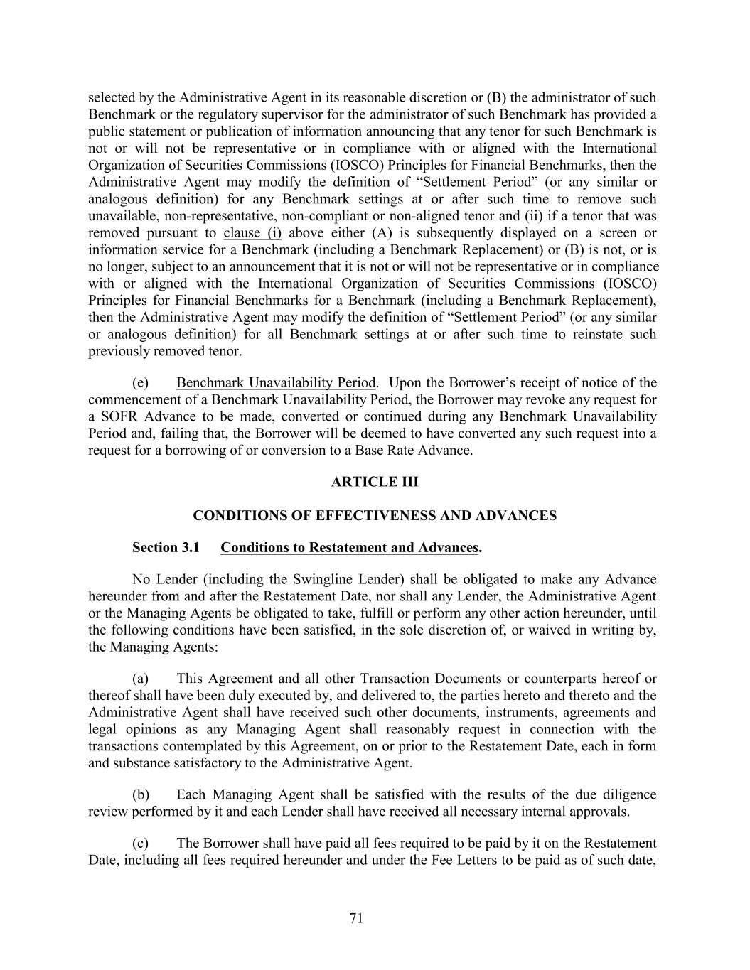 selected by the Administrative Agent in its reasonable discretion or (B) the administrator of such Benchmark or the regulatory supervisor for the administrator of such Benchmark has provided a public statement or publication of information announcing that any tenor for such Benchmark is not or will not be representative or in compliance with or aligned with the International Organization of Securities Commissions (IOSCO) Principles for Financial Benchmarks, then the Administrative Agent may modify the definition of “Settlement Period” (or any similar or analogous definition) for any Benchmark settings at or after such time to remove such unavailable, non-representative, non-compliant or non-aligned tenor and (ii) if a tenor that was removed pursuant to clause (i) above either (A) is subsequently displayed on a screen or information service for a Benchmark (including a Benchmark Replacement) or (B) is not, or is no longer, subject to an announcement that it is not or will not be representative or in compliance with or aligned with the International Organization of Securities Commissions (IOSCO) Principles for Financial Benchmarks for a Benchmark (including a Benchmark Replacement), then the Administrative Agent may modify the definition of “Settlement Period” (or any similar or analogous definition) for all Benchmark settings at or after such time to reinstate such previously removed tenor. (e) Benchmark Unavailability Period. Upon the Borrower’s receipt of notice of the commencement of a Benchmark Unavailability Period, the Borrower may revoke any request for a SOFR Advance to be made, converted or continued during any Benchmark Unavailability Period and, failing that, the Borrower will be deemed to have converted any such request into a request for a borrowing of or conversion to a Base Rate Advance. ARTICLE III CONDITIONS OF EFFECTIVENESS AND ADVANCES Section 3.1 Conditions to Restatement and Advances. No Lender (including the Swingline Lender) shall be obligated to make any Advance hereunder from and after the Restatement Date, nor shall any Lender, the Administrative Agent or the Managing Agents be obligated to take, fulfill or perform any other action hereunder, until the following conditions have been satisfied, in the sole discretion of, or waived in writing by, the Managing Agents: (a) This Agreement and all other Transaction Documents or counterparts hereof or thereof shall have been duly executed by, and delivered to, the parties hereto and thereto and the Administrative Agent shall have received such other documents, instruments, agreements and legal opinions as any Managing Agent shall reasonably request in connection with the transactions contemplated by this Agreement, on or prior to the Restatement Date, each in form and substance satisfactory to the Administrative Agent. (b) Each Managing Agent shall be satisfied with the results of the due diligence review performed by it and each Lender shall have received all necessary internal approvals. (c) The Borrower shall have paid all fees required to be paid by it on the Restatement Date, including all fees required hereunder and under the Fee Letters to be paid as of such date, 71