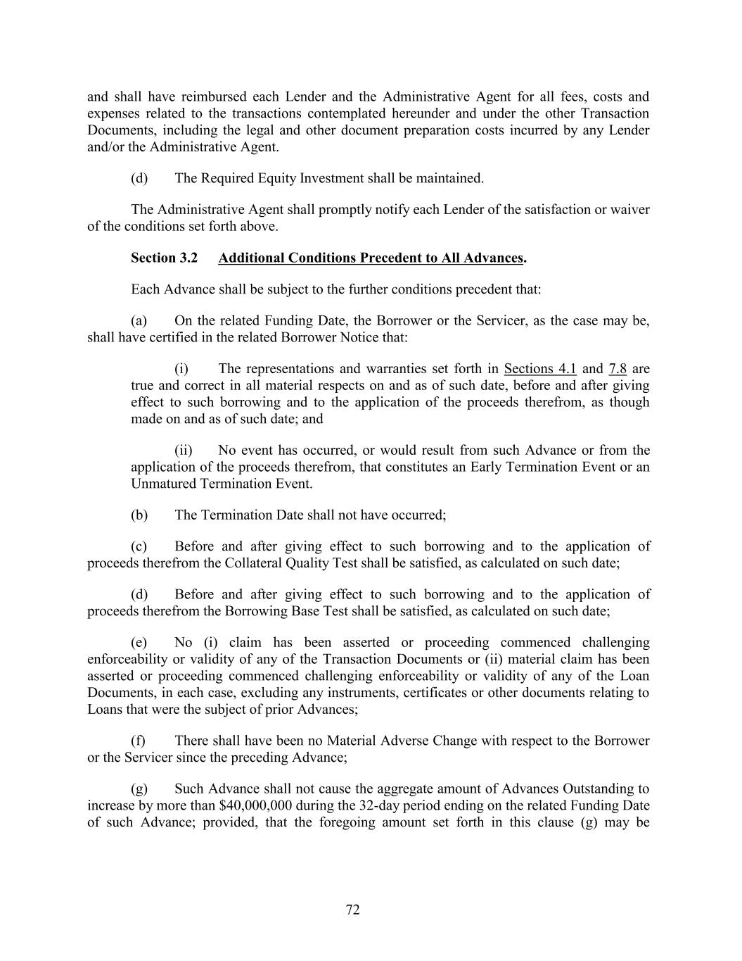 and shall have reimbursed each Lender and the Administrative Agent for all fees, costs and expenses related to the transactions contemplated hereunder and under the other Transaction Documents, including the legal and other document preparation costs incurred by any Lender and/or the Administrative Agent. (d) The Required Equity Investment shall be maintained. The Administrative Agent shall promptly notify each Lender of the satisfaction or waiver of the conditions set forth above. Section 3.2 Additional Conditions Precedent to All Advances. Each Advance shall be subject to the further conditions precedent that: (a) On the related Funding Date, the Borrower or the Servicer, as the case may be, shall have certified in the related Borrower Notice that: (i) The representations and warranties set forth in Sections 4.1 and 7.8 are true and correct in all material respects on and as of such date, before and after giving effect to such borrowing and to the application of the proceeds therefrom, as though made on and as of such date; and (ii) No event has occurred, or would result from such Advance or from the application of the proceeds therefrom, that constitutes an Early Termination Event or an Unmatured Termination Event. (b) The Termination Date shall not have occurred; (c) Before and after giving effect to such borrowing and to the application of proceeds therefrom the Collateral Quality Test shall be satisfied, as calculated on such date; (d) Before and after giving effect to such borrowing and to the application of proceeds therefrom the Borrowing Base Test shall be satisfied, as calculated on such date; (e) No (i) claim has been asserted or proceeding commenced challenging enforceability or validity of any of the Transaction Documents or (ii) material claim has been asserted or proceeding commenced challenging enforceability or validity of any of the Loan Documents, in each case, excluding any instruments, certificates or other documents relating to Loans that were the subject of prior Advances; (f) There shall have been no Material Adverse Change with respect to the Borrower or the Servicer since the preceding Advance; (g) Such Advance shall not cause the aggregate amount of Advances Outstanding to increase by more than $40,000,000 during the 32-day period ending on the related Funding Date of such Advance; provided, that the foregoing amount set forth in this clause (g) may be 72