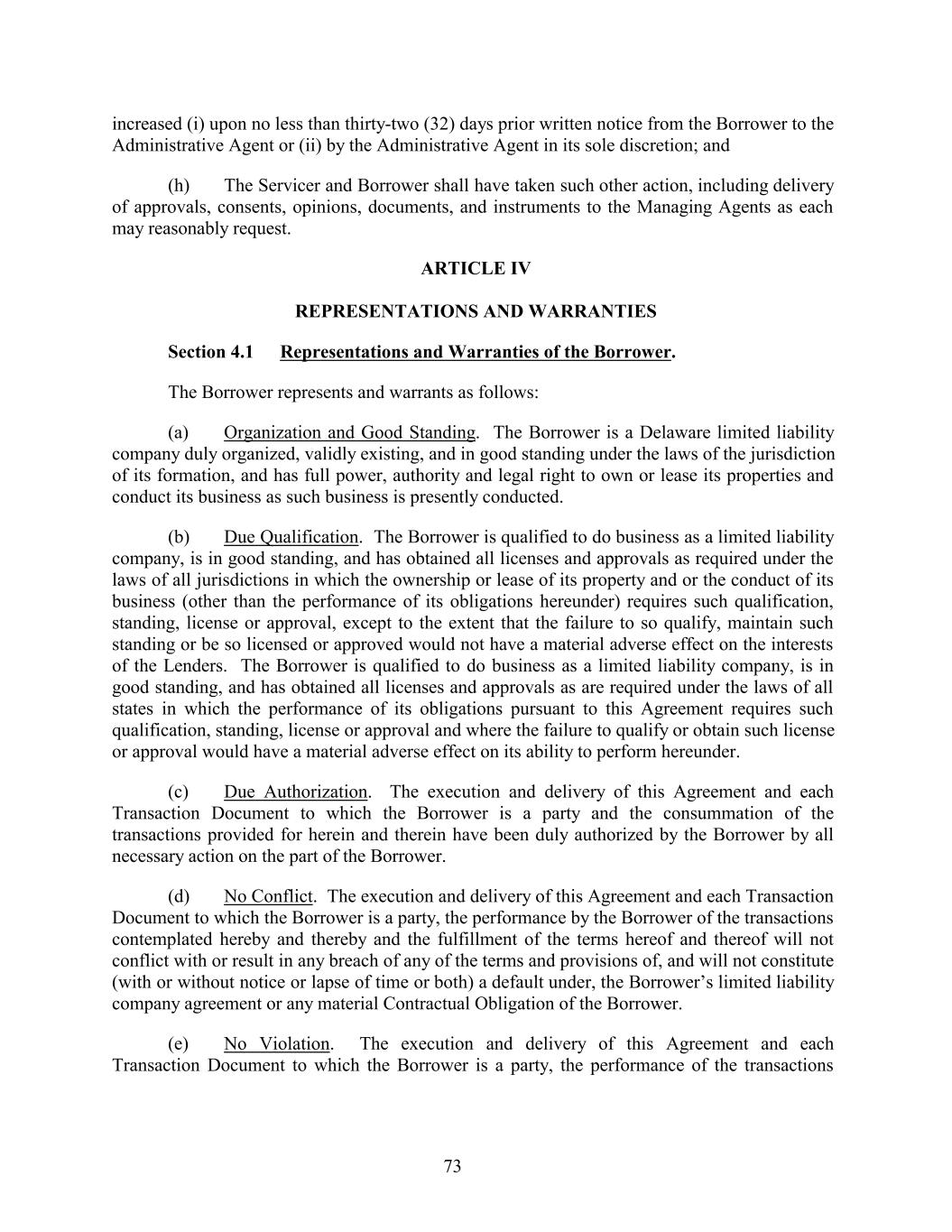 increased (i) upon no less than thirty-two (32) days prior written notice from the Borrower to the Administrative Agent or (ii) by the Administrative Agent in its sole discretion; and (h) The Servicer and Borrower shall have taken such other action, including delivery of approvals, consents, opinions, documents, and instruments to the Managing Agents as each may reasonably request. ARTICLE IV REPRESENTATIONS AND WARRANTIES Section 4.1 Representations and Warranties of the Borrower. The Borrower represents and warrants as follows: (a) Organization and Good Standing. The Borrower is a Delaware limited liability company duly organized, validly existing, and in good standing under the laws of the jurisdiction of its formation, and has full power, authority and legal right to own or lease its properties and conduct its business as such business is presently conducted. (b) Due Qualification. The Borrower is qualified to do business as a limited liability company, is in good standing, and has obtained all licenses and approvals as required under the laws of all jurisdictions in which the ownership or lease of its property and or the conduct of its business (other than the performance of its obligations hereunder) requires such qualification, standing, license or approval, except to the extent that the failure to so qualify, maintain such standing or be so licensed or approved would not have a material adverse effect on the interests of the Lenders. The Borrower is qualified to do business as a limited liability company, is in good standing, and has obtained all licenses and approvals as are required under the laws of all states in which the performance of its obligations pursuant to this Agreement requires such qualification, standing, license or approval and where the failure to qualify or obtain such license or approval would have a material adverse effect on its ability to perform hereunder. (c) Due Authorization. The execution and delivery of this Agreement and each Transaction Document to which the Borrower is a party and the consummation of the transactions provided for herein and therein have been duly authorized by the Borrower by all necessary action on the part of the Borrower. (d) No Conflict. The execution and delivery of this Agreement and each Transaction Document to which the Borrower is a party, the performance by the Borrower of the transactions contemplated hereby and thereby and the fulfillment of the terms hereof and thereof will not conflict with or result in any breach of any of the terms and provisions of, and will not constitute (with or without notice or lapse of time or both) a default under, the Borrower’s limited liability company agreement or any material Contractual Obligation of the Borrower. (e) No Violation. The execution and delivery of this Agreement and each Transaction Document to which the Borrower is a party, the performance of the transactions 73