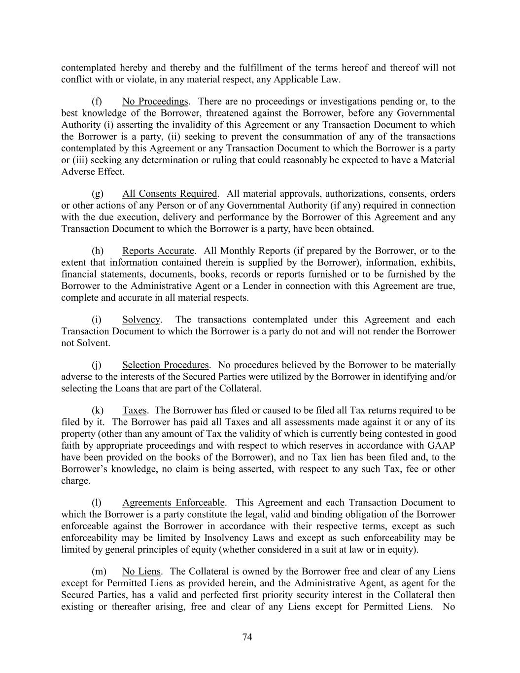 contemplated hereby and thereby and the fulfillment of the terms hereof and thereof will not conflict with or violate, in any material respect, any Applicable Law. (f) No Proceedings. There are no proceedings or investigations pending or, to the best knowledge of the Borrower, threatened against the Borrower, before any Governmental Authority (i) asserting the invalidity of this Agreement or any Transaction Document to which the Borrower is a party, (ii) seeking to prevent the consummation of any of the transactions contemplated by this Agreement or any Transaction Document to which the Borrower is a party or (iii) seeking any determination or ruling that could reasonably be expected to have a Material Adverse Effect. (g) All Consents Required. All material approvals, authorizations, consents, orders or other actions of any Person or of any Governmental Authority (if any) required in connection with the due execution, delivery and performance by the Borrower of this Agreement and any Transaction Document to which the Borrower is a party, have been obtained. (h) Reports Accurate. All Monthly Reports (if prepared by the Borrower, or to the extent that information contained therein is supplied by the Borrower), information, exhibits, financial statements, documents, books, records or reports furnished or to be furnished by the Borrower to the Administrative Agent or a Lender in connection with this Agreement are true, complete and accurate in all material respects. (i) Solvency. The transactions contemplated under this Agreement and each Transaction Document to which the Borrower is a party do not and will not render the Borrower not Solvent. (j) Selection Procedures. No procedures believed by the Borrower to be materially adverse to the interests of the Secured Parties were utilized by the Borrower in identifying and/or selecting the Loans that are part of the Collateral. (k) Taxes. The Borrower has filed or caused to be filed all Tax returns required to be filed by it. The Borrower has paid all Taxes and all assessments made against it or any of its property (other than any amount of Tax the validity of which is currently being contested in good faith by appropriate proceedings and with respect to which reserves in accordance with GAAP have been provided on the books of the Borrower), and no Tax lien has been filed and, to the Borrower’s knowledge, no claim is being asserted, with respect to any such Tax, fee or other charge. (l) Agreements Enforceable. This Agreement and each Transaction Document to which the Borrower is a party constitute the legal, valid and binding obligation of the Borrower enforceable against the Borrower in accordance with their respective terms, except as such enforceability may be limited by Insolvency Laws and except as such enforceability may be limited by general principles of equity (whether considered in a suit at law or in equity). (m) No Liens. The Collateral is owned by the Borrower free and clear of any Liens except for Permitted Liens as provided herein, and the Administrative Agent, as agent for the Secured Parties, has a valid and perfected first priority security interest in the Collateral then existing or thereafter arising, free and clear of any Liens except for Permitted Liens. No 74