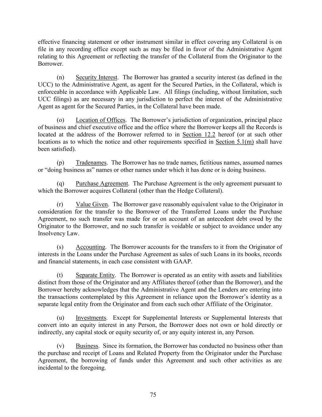 effective financing statement or other instrument similar in effect covering any Collateral is on file in any recording office except such as may be filed in favor of the Administrative Agent relating to this Agreement or reflecting the transfer of the Collateral from the Originator to the Borrower. (n) Security Interest. The Borrower has granted a security interest (as defined in the UCC) to the Administrative Agent, as agent for the Secured Parties, in the Collateral, which is enforceable in accordance with Applicable Law. All filings (including, without limitation, such UCC filings) as are necessary in any jurisdiction to perfect the interest of the Administrative Agent as agent for the Secured Parties, in the Collateral have been made. (o) Location of Offices. The Borrower’s jurisdiction of organization, principal place of business and chief executive office and the office where the Borrower keeps all the Records is located at the address of the Borrower referred to in Section 12.2 hereof (or at such other locations as to which the notice and other requirements specified in Section 5.1(m) shall have been satisfied). (p) Tradenames. The Borrower has no trade names, fictitious names, assumed names or “doing business as” names or other names under which it has done or is doing business. (q) Purchase Agreement. The Purchase Agreement is the only agreement pursuant to which the Borrower acquires Collateral (other than the Hedge Collateral). (r) Value Given. The Borrower gave reasonably equivalent value to the Originator in consideration for the transfer to the Borrower of the Transferred Loans under the Purchase Agreement, no such transfer was made for or on account of an antecedent debt owed by the Originator to the Borrower, and no such transfer is voidable or subject to avoidance under any Insolvency Law. (s) Accounting. The Borrower accounts for the transfers to it from the Originator of interests in the Loans under the Purchase Agreement as sales of such Loans in its books, records and financial statements, in each case consistent with GAAP. (t) Separate Entity. The Borrower is operated as an entity with assets and liabilities distinct from those of the Originator and any Affiliates thereof (other than the Borrower), and the Borrower hereby acknowledges that the Administrative Agent and the Lenders are entering into the transactions contemplated by this Agreement in reliance upon the Borrower’s identity as a separate legal entity from the Originator and from each such other Affiliate of the Originator. (u) Investments. Except for Supplemental Interests or Supplemental Interests that convert into an equity interest in any Person, the Borrower does not own or hold directly or indirectly, any capital stock or equity security of, or any equity interest in, any Person. (v) Business. Since its formation, the Borrower has conducted no business other than the purchase and receipt of Loans and Related Property from the Originator under the Purchase Agreement, the borrowing of funds under this Agreement and such other activities as are incidental to the foregoing. 75