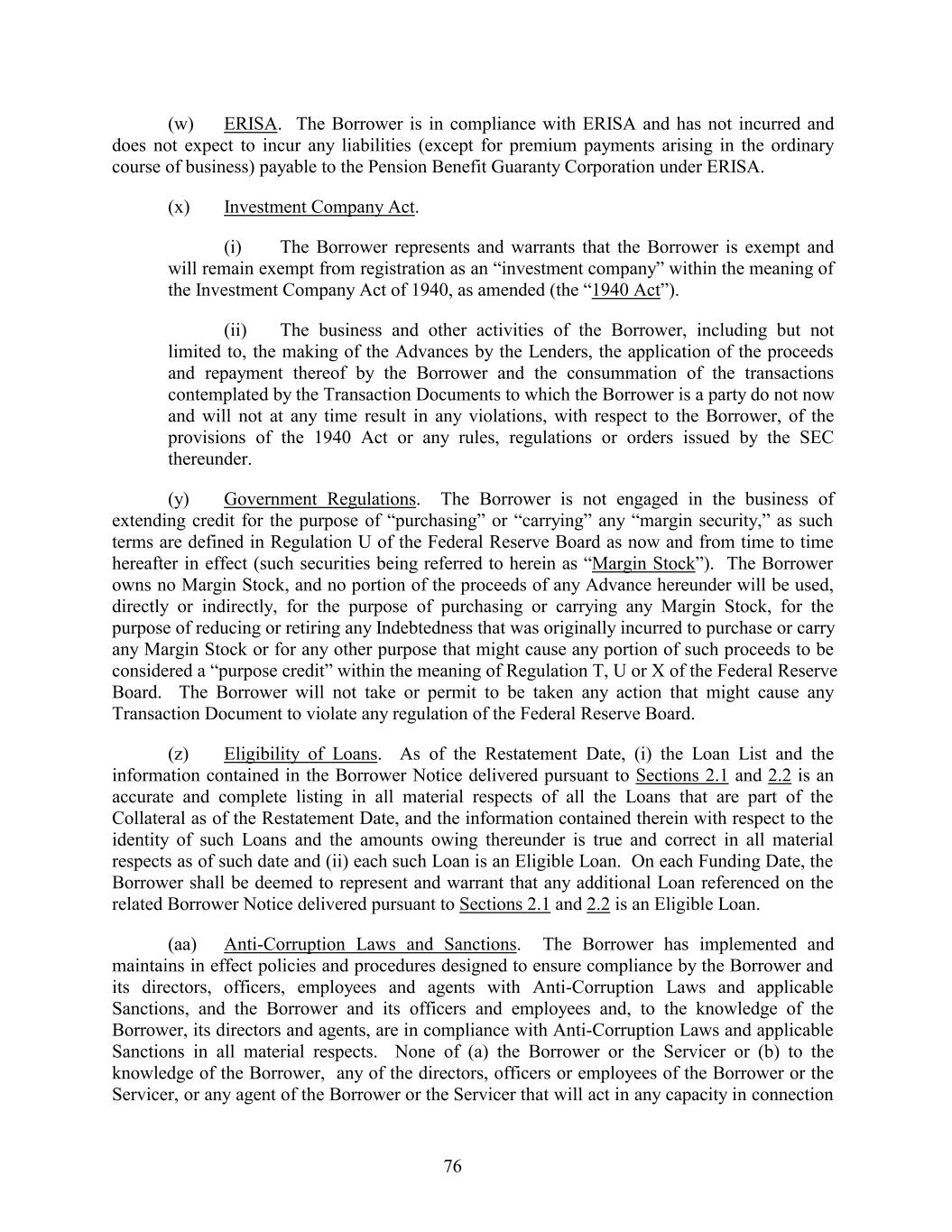 (w) ERISA. The Borrower is in compliance with ERISA and has not incurred and does not expect to incur any liabilities (except for premium payments arising in the ordinary course of business) payable to the Pension Benefit Guaranty Corporation under ERISA. (x) Investment Company Act. (i) The Borrower represents and warrants that the Borrower is exempt and will remain exempt from registration as an “investment company” within the meaning of the Investment Company Act of 1940, as amended (the “1940 Act”). (ii) The business and other activities of the Borrower, including but not limited to, the making of the Advances by the Lenders, the application of the proceeds and repayment thereof by the Borrower and the consummation of the transactions contemplated by the Transaction Documents to which the Borrower is a party do not now and will not at any time result in any violations, with respect to the Borrower, of the provisions of the 1940 Act or any rules, regulations or orders issued by the SEC thereunder. (y) Government Regulations. The Borrower is not engaged in the business of extending credit for the purpose of “purchasing” or “carrying” any “margin security,” as such terms are defined in Regulation U of the Federal Reserve Board as now and from time to time hereafter in effect (such securities being referred to herein as “Margin Stock”). The Borrower owns no Margin Stock, and no portion of the proceeds of any Advance hereunder will be used, directly or indirectly, for the purpose of purchasing or carrying any Margin Stock, for the purpose of reducing or retiring any Indebtedness that was originally incurred to purchase or carry any Margin Stock or for any other purpose that might cause any portion of such proceeds to be considered a “purpose credit” within the meaning of Regulation T, U or X of the Federal Reserve Board. The Borrower will not take or permit to be taken any action that might cause any Transaction Document to violate any regulation of the Federal Reserve Board. (z) Eligibility of Loans. As of the Restatement Date, (i) the Loan List and the information contained in the Borrower Notice delivered pursuant to Sections 2.1 and 2.2 is an accurate and complete listing in all material respects of all the Loans that are part of the Collateral as of the Restatement Date, and the information contained therein with respect to the identity of such Loans and the amounts owing thereunder is true and correct in all material respects as of such date and (ii) each such Loan is an Eligible Loan. On each Funding Date, the Borrower shall be deemed to represent and warrant that any additional Loan referenced on the related Borrower Notice delivered pursuant to Sections 2.1 and 2.2 is an Eligible Loan. (aa) Anti-Corruption Laws and Sanctions. The Borrower has implemented and maintains in effect policies and procedures designed to ensure compliance by the Borrower and its directors, officers, employees and agents with Anti-Corruption Laws and applicable Sanctions, and the Borrower and its officers and employees and, to the knowledge of the Borrower, its directors and agents, are in compliance with Anti-Corruption Laws and applicable Sanctions in all material respects. None of (a) the Borrower or the Servicer or (b) to the knowledge of the Borrower, any of the directors, officers or employees of the Borrower or the Servicer, or any agent of the Borrower or the Servicer that will act in any capacity in connection 76