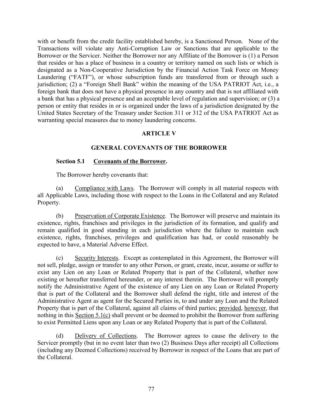 with or benefit from the credit facility established hereby, is a Sanctioned Person. None of the Transactions will violate any Anti-Corruption Law or Sanctions that are applicable to the Borrower or the Servicer. Neither the Borrower nor any Affiliate of the Borrower is (1) a Person that resides or has a place of business in a country or territory named on such lists or which is designated as a Non-Cooperative Jurisdiction by the Financial Action Task Force on Money Laundering (“FATF”), or whose subscription funds are transferred from or through such a jurisdiction; (2) a “Foreign Shell Bank” within the meaning of the USA PATRIOT Act, i.e., a foreign bank that does not have a physical presence in any country and that is not affiliated with a bank that has a physical presence and an acceptable level of regulation and supervision; or (3) a person or entity that resides in or is organized under the laws of a jurisdiction designated by the United States Secretary of the Treasury under Section 311 or 312 of the USA PATRIOT Act as warranting special measures due to money laundering concerns. ARTICLE V GENERAL COVENANTS OF THE BORROWER Section 5.1 Covenants of the Borrower. The Borrower hereby covenants that: (a) Compliance with Laws. The Borrower will comply in all material respects with all Applicable Laws, including those with respect to the Loans in the Collateral and any Related Property. (b) Preservation of Corporate Existence. The Borrower will preserve and maintain its existence, rights, franchises and privileges in the jurisdiction of its formation, and qualify and remain qualified in good standing in each jurisdiction where the failure to maintain such existence, rights, franchises, privileges and qualification has had, or could reasonably be expected to have, a Material Adverse Effect. (c) Security Interests. Except as contemplated in this Agreement, the Borrower will not sell, pledge, assign or transfer to any other Person, or grant, create, incur, assume or suffer to exist any Lien on any Loan or Related Property that is part of the Collateral, whether now existing or hereafter transferred hereunder, or any interest therein. The Borrower will promptly notify the Administrative Agent of the existence of any Lien on any Loan or Related Property that is part of the Collateral and the Borrower shall defend the right, title and interest of the Administrative Agent as agent for the Secured Parties in, to and under any Loan and the Related Property that is part of the Collateral, against all claims of third parties; provided, however, that nothing in this Section 5.1(c) shall prevent or be deemed to prohibit the Borrower from suffering to exist Permitted Liens upon any Loan or any Related Property that is part of the Collateral. (d) Delivery of Collections. The Borrower agrees to cause the delivery to the Servicer promptly (but in no event later than two (2) Business Days after receipt) all Collections (including any Deemed Collections) received by Borrower in respect of the Loans that are part of the Collateral. 77