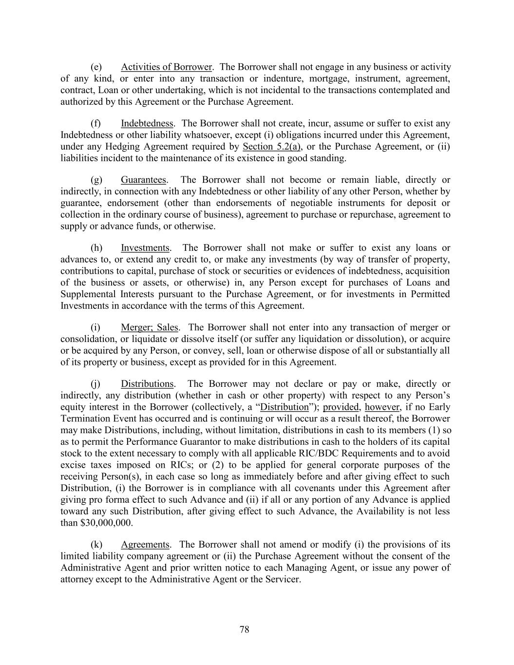 (e) Activities of Borrower. The Borrower shall not engage in any business or activity of any kind, or enter into any transaction or indenture, mortgage, instrument, agreement, contract, Loan or other undertaking, which is not incidental to the transactions contemplated and authorized by this Agreement or the Purchase Agreement. (f) Indebtedness. The Borrower shall not create, incur, assume or suffer to exist any Indebtedness or other liability whatsoever, except (i) obligations incurred under this Agreement, under any Hedging Agreement required by Section 5.2(a), or the Purchase Agreement, or (ii) liabilities incident to the maintenance of its existence in good standing. (g) Guarantees. The Borrower shall not become or remain liable, directly or indirectly, in connection with any Indebtedness or other liability of any other Person, whether by guarantee, endorsement (other than endorsements of negotiable instruments for deposit or collection in the ordinary course of business), agreement to purchase or repurchase, agreement to supply or advance funds, or otherwise. (h) Investments. The Borrower shall not make or suffer to exist any loans or advances to, or extend any credit to, or make any investments (by way of transfer of property, contributions to capital, purchase of stock or securities or evidences of indebtedness, acquisition of the business or assets, or otherwise) in, any Person except for purchases of Loans and Supplemental Interests pursuant to the Purchase Agreement, or for investments in Permitted Investments in accordance with the terms of this Agreement. (i) Merger; Sales. The Borrower shall not enter into any transaction of merger or consolidation, or liquidate or dissolve itself (or suffer any liquidation or dissolution), or acquire or be acquired by any Person, or convey, sell, loan or otherwise dispose of all or substantially all of its property or business, except as provided for in this Agreement. (j) Distributions. The Borrower may not declare or pay or make, directly or indirectly, any distribution (whether in cash or other property) with respect to any Person’s equity interest in the Borrower (collectively, a “Distribution”); provided, however, if no Early Termination Event has occurred and is continuing or will occur as a result thereof, the Borrower may make Distributions, including, without limitation, distributions in cash to its members (1) so as to permit the Performance Guarantor to make distributions in cash to the holders of its capital stock to the extent necessary to comply with all applicable RIC/BDC Requirements and to avoid excise taxes imposed on RICs; or (2) to be applied for general corporate purposes of the receiving Person(s), in each case so long as immediately before and after giving effect to such Distribution, (i) the Borrower is in compliance with all covenants under this Agreement after giving pro forma effect to such Advance and (ii) if all or any portion of any Advance is applied toward any such Distribution, after giving effect to such Advance, the Availability is not less than $30,000,000. (k) Agreements. The Borrower shall not amend or modify (i) the provisions of its limited liability company agreement or (ii) the Purchase Agreement without the consent of the Administrative Agent and prior written notice to each Managing Agent, or issue any power of attorney except to the Administrative Agent or the Servicer. 78