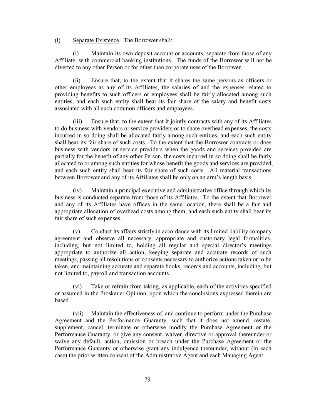 (l) Separate Existence. The Borrower shall: (i) Maintain its own deposit account or accounts, separate from those of any Affiliate, with commercial banking institutions. The funds of the Borrower will not be diverted to any other Person or for other than corporate uses of the Borrower. (ii) Ensure that, to the extent that it shares the same persons as officers or other employees as any of its Affiliates, the salaries of and the expenses related to providing benefits to such officers or employees shall be fairly allocated among such entities, and each such entity shall bear its fair share of the salary and benefit costs associated with all such common officers and employees. (iii) Ensure that, to the extent that it jointly contracts with any of its Affiliates to do business with vendors or service providers or to share overhead expenses, the costs incurred in so doing shall be allocated fairly among such entities, and each such entity shall bear its fair share of such costs. To the extent that the Borrower contracts or does business with vendors or service providers when the goods and services provided are partially for the benefit of any other Person, the costs incurred in so doing shall be fairly allocated to or among such entities for whose benefit the goods and services are provided, and each such entity shall bear its fair share of such costs. All material transactions between Borrower and any of its Affiliates shall be only on an arm’s length basis. (iv) Maintain a principal executive and administrative office through which its business is conducted separate from those of its Affiliates. To the extent that Borrower and any of its Affiliates have offices in the same location, there shall be a fair and appropriate allocation of overhead costs among them, and each such entity shall bear its fair share of such expenses. (v) Conduct its affairs strictly in accordance with its limited liability company agreement and observe all necessary, appropriate and customary legal formalities, including, but not limited to, holding all regular and special director’s meetings appropriate to authorize all action, keeping separate and accurate records of such meetings, passing all resolutions or consents necessary to authorize actions taken or to be taken, and maintaining accurate and separate books, records and accounts, including, but not limited to, payroll and transaction accounts. (vi) Take or refrain from taking, as applicable, each of the activities specified or assumed in the Proskauer Opinion, upon which the conclusions expressed therein are based. (vii) Maintain the effectiveness of, and continue to perform under the Purchase Agreement and the Performance Guaranty, such that it does not amend, restate, supplement, cancel, terminate or otherwise modify the Purchase Agreement or the Performance Guaranty, or give any consent, waiver, directive or approval thereunder or waive any default, action, omission or breach under the Purchase Agreement or the Performance Guaranty or otherwise grant any indulgence thereunder, without (in each case) the prior written consent of the Administrative Agent and each Managing Agent. 79