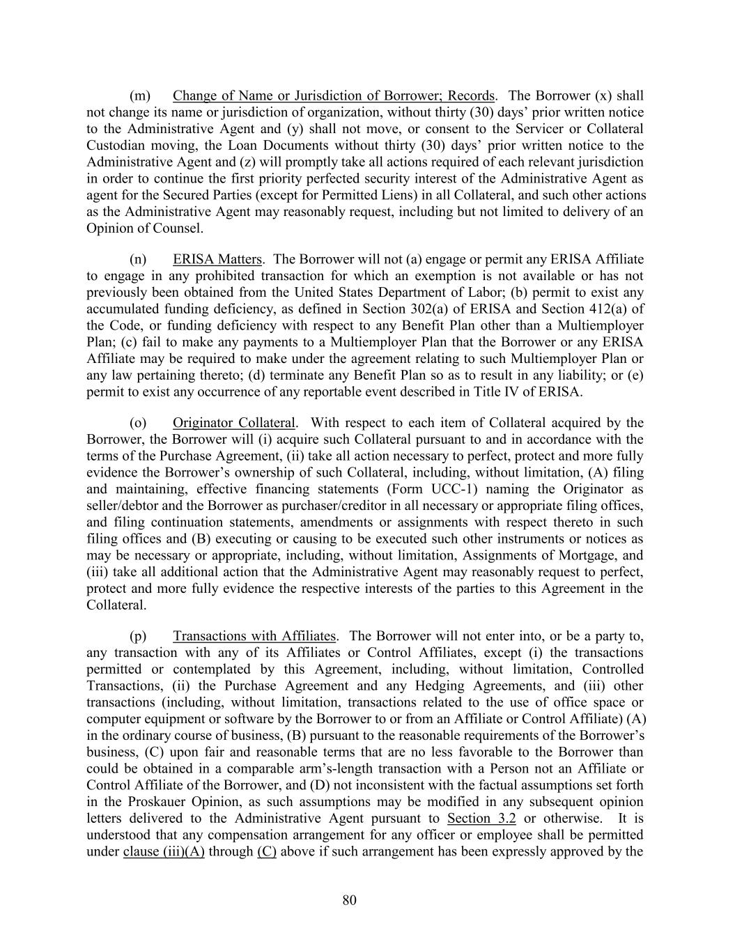 (m) Change of Name or Jurisdiction of Borrower; Records. The Borrower (x) shall not change its name or jurisdiction of organization, without thirty (30) days’ prior written notice to the Administrative Agent and (y) shall not move, or consent to the Servicer or Collateral Custodian moving, the Loan Documents without thirty (30) days’ prior written notice to the Administrative Agent and (z) will promptly take all actions required of each relevant jurisdiction in order to continue the first priority perfected security interest of the Administrative Agent as agent for the Secured Parties (except for Permitted Liens) in all Collateral, and such other actions as the Administrative Agent may reasonably request, including but not limited to delivery of an Opinion of Counsel. (n) ERISA Matters. The Borrower will not (a) engage or permit any ERISA Affiliate to engage in any prohibited transaction for which an exemption is not available or has not previously been obtained from the United States Department of Labor; (b) permit to exist any accumulated funding deficiency, as defined in Section 302(a) of ERISA and Section 412(a) of the Code, or funding deficiency with respect to any Benefit Plan other than a Multiemployer Plan; (c) fail to make any payments to a Multiemployer Plan that the Borrower or any ERISA Affiliate may be required to make under the agreement relating to such Multiemployer Plan or any law pertaining thereto; (d) terminate any Benefit Plan so as to result in any liability; or (e) permit to exist any occurrence of any reportable event described in Title IV of ERISA. (o) Originator Collateral. With respect to each item of Collateral acquired by the Borrower, the Borrower will (i) acquire such Collateral pursuant to and in accordance with the terms of the Purchase Agreement, (ii) take all action necessary to perfect, protect and more fully evidence the Borrower’s ownership of such Collateral, including, without limitation, (A) filing and maintaining, effective financing statements (Form UCC-1) naming the Originator as seller/debtor and the Borrower as purchaser/creditor in all necessary or appropriate filing offices, and filing continuation statements, amendments or assignments with respect thereto in such filing offices and (B) executing or causing to be executed such other instruments or notices as may be necessary or appropriate, including, without limitation, Assignments of Mortgage, and (iii) take all additional action that the Administrative Agent may reasonably request to perfect, protect and more fully evidence the respective interests of the parties to this Agreement in the Collateral. (p) Transactions with Affiliates. The Borrower will not enter into, or be a party to, any transaction with any of its Affiliates or Control Affiliates, except (i) the transactions permitted or contemplated by this Agreement, including, without limitation, Controlled Transactions, (ii) the Purchase Agreement and any Hedging Agreements, and (iii) other transactions (including, without limitation, transactions related to the use of office space or computer equipment or software by the Borrower to or from an Affiliate or Control Affiliate) (A) in the ordinary course of business, (B) pursuant to the reasonable requirements of the Borrower’s business, (C) upon fair and reasonable terms that are no less favorable to the Borrower than could be obtained in a comparable arm’s-length transaction with a Person not an Affiliate or Control Affiliate of the Borrower, and (D) not inconsistent with the factual assumptions set forth in the Proskauer Opinion, as such assumptions may be modified in any subsequent opinion letters delivered to the Administrative Agent pursuant to Section 3.2 or otherwise. It is understood that any compensation arrangement for any officer or employee shall be permitted under clause (iii)(A) through (C) above if such arrangement has been expressly approved by the 80