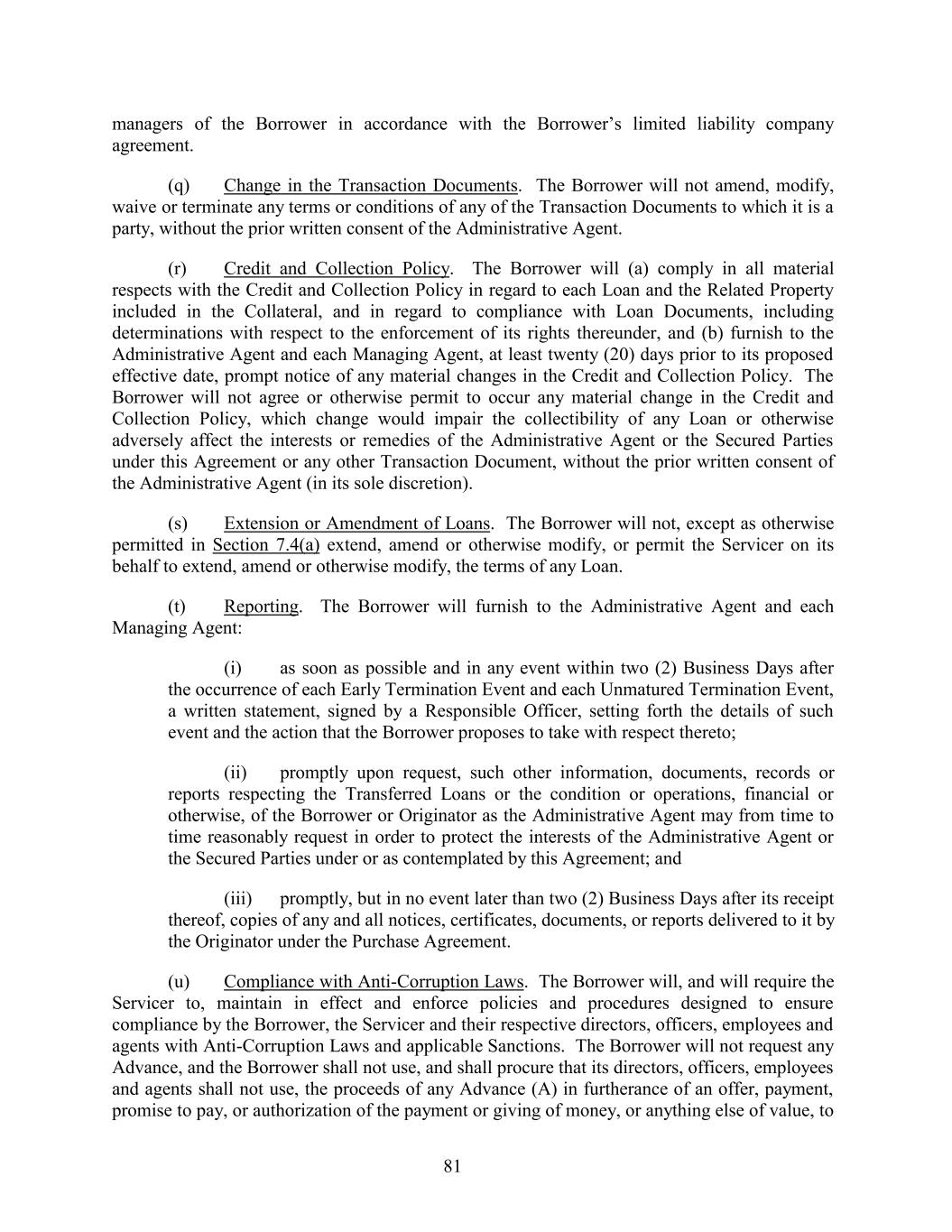 managers of the Borrower in accordance with the Borrower’s limited liability company agreement. (q) Change in the Transaction Documents. The Borrower will not amend, modify, waive or terminate any terms or conditions of any of the Transaction Documents to which it is a party, without the prior written consent of the Administrative Agent. (r) Credit and Collection Policy. The Borrower will (a) comply in all material respects with the Credit and Collection Policy in regard to each Loan and the Related Property included in the Collateral, and in regard to compliance with Loan Documents, including determinations with respect to the enforcement of its rights thereunder, and (b) furnish to the Administrative Agent and each Managing Agent, at least twenty (20) days prior to its proposed effective date, prompt notice of any material changes in the Credit and Collection Policy. The Borrower will not agree or otherwise permit to occur any material change in the Credit and Collection Policy, which change would impair the collectibility of any Loan or otherwise adversely affect the interests or remedies of the Administrative Agent or the Secured Parties under this Agreement or any other Transaction Document, without the prior written consent of the Administrative Agent (in its sole discretion). (s) Extension or Amendment of Loans. The Borrower will not, except as otherwise permitted in Section 7.4(a) extend, amend or otherwise modify, or permit the Servicer on its behalf to extend, amend or otherwise modify, the terms of any Loan. (t) Reporting. The Borrower will furnish to the Administrative Agent and each Managing Agent: (i) as soon as possible and in any event within two (2) Business Days after the occurrence of each Early Termination Event and each Unmatured Termination Event, a written statement, signed by a Responsible Officer, setting forth the details of such event and the action that the Borrower proposes to take with respect thereto; (ii) promptly upon request, such other information, documents, records or reports respecting the Transferred Loans or the condition or operations, financial or otherwise, of the Borrower or Originator as the Administrative Agent may from time to time reasonably request in order to protect the interests of the Administrative Agent or the Secured Parties under or as contemplated by this Agreement; and (iii) promptly, but in no event later than two (2) Business Days after its receipt thereof, copies of any and all notices, certificates, documents, or reports delivered to it by the Originator under the Purchase Agreement. (u) Compliance with Anti-Corruption Laws. The Borrower will, and will require the Servicer to, maintain in effect and enforce policies and procedures designed to ensure compliance by the Borrower, the Servicer and their respective directors, officers, employees and agents with Anti-Corruption Laws and applicable Sanctions. The Borrower will not request any Advance, and the Borrower shall not use, and shall procure that its directors, officers, employees and agents shall not use, the proceeds of any Advance (A) in furtherance of an offer, payment, promise to pay, or authorization of the payment or giving of money, or anything else of value, to 81