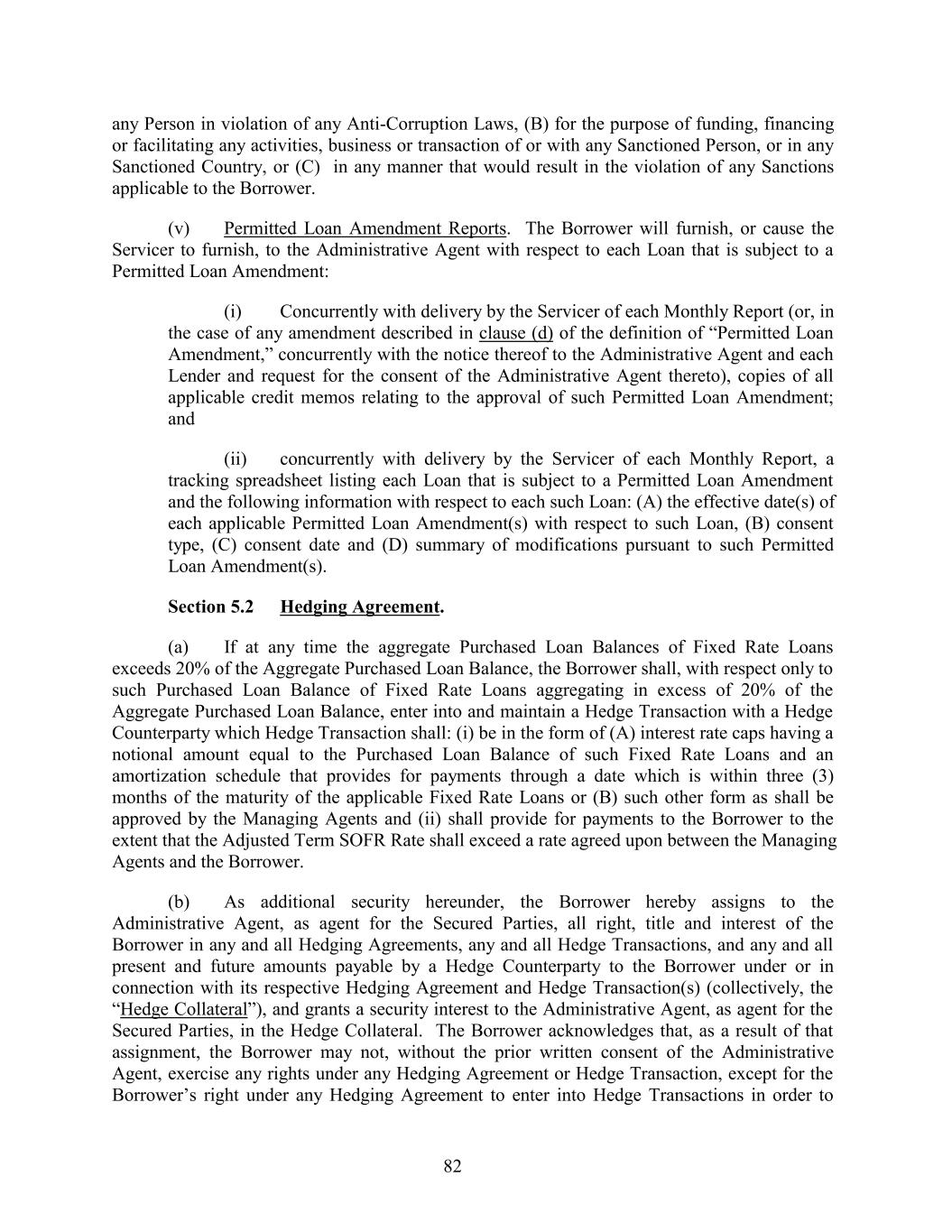 any Person in violation of any Anti-Corruption Laws, (B) for the purpose of funding, financing or facilitating any activities, business or transaction of or with any Sanctioned Person, or in any Sanctioned Country, or (C) in any manner that would result in the violation of any Sanctions applicable to the Borrower. (v) Permitted Loan Amendment Reports. The Borrower will furnish, or cause the Servicer to furnish, to the Administrative Agent with respect to each Loan that is subject to a Permitted Loan Amendment: (i) Concurrently with delivery by the Servicer of each Monthly Report (or, in the case of any amendment described in clause (d) of the definition of “Permitted Loan Amendment,” concurrently with the notice thereof to the Administrative Agent and each Lender and request for the consent of the Administrative Agent thereto), copies of all applicable credit memos relating to the approval of such Permitted Loan Amendment; and (ii) concurrently with delivery by the Servicer of each Monthly Report, a tracking spreadsheet listing each Loan that is subject to a Permitted Loan Amendment and the following information with respect to each such Loan: (A) the effective date(s) of each applicable Permitted Loan Amendment(s) with respect to such Loan, (B) consent type, (C) consent date and (D) summary of modifications pursuant to such Permitted Loan Amendment(s). Section 5.2 Hedging Agreement. (a) If at any time the aggregate Purchased Loan Balances of Fixed Rate Loans exceeds 20% of the Aggregate Purchased Loan Balance, the Borrower shall, with respect only to such Purchased Loan Balance of Fixed Rate Loans aggregating in excess of 20% of the Aggregate Purchased Loan Balance, enter into and maintain a Hedge Transaction with a Hedge Counterparty which Hedge Transaction shall: (i) be in the form of (A) interest rate caps having a notional amount equal to the Purchased Loan Balance of such Fixed Rate Loans and an amortization schedule that provides for payments through a date which is within three (3) months of the maturity of the applicable Fixed Rate Loans or (B) such other form as shall be approved by the Managing Agents and (ii) shall provide for payments to the Borrower to the extent that the Adjusted Term SOFR Rate shall exceed a rate agreed upon between the Managing Agents and the Borrower. (b) As additional security hereunder, the Borrower hereby assigns to the Administrative Agent, as agent for the Secured Parties, all right, title and interest of the Borrower in any and all Hedging Agreements, any and all Hedge Transactions, and any and all present and future amounts payable by a Hedge Counterparty to the Borrower under or in connection with its respective Hedging Agreement and Hedge Transaction(s) (collectively, the “Hedge Collateral”), and grants a security interest to the Administrative Agent, as agent for the Secured Parties, in the Hedge Collateral. The Borrower acknowledges that, as a result of that assignment, the Borrower may not, without the prior written consent of the Administrative Agent, exercise any rights under any Hedging Agreement or Hedge Transaction, except for the Borrower’s right under any Hedging Agreement to enter into Hedge Transactions in order to 82