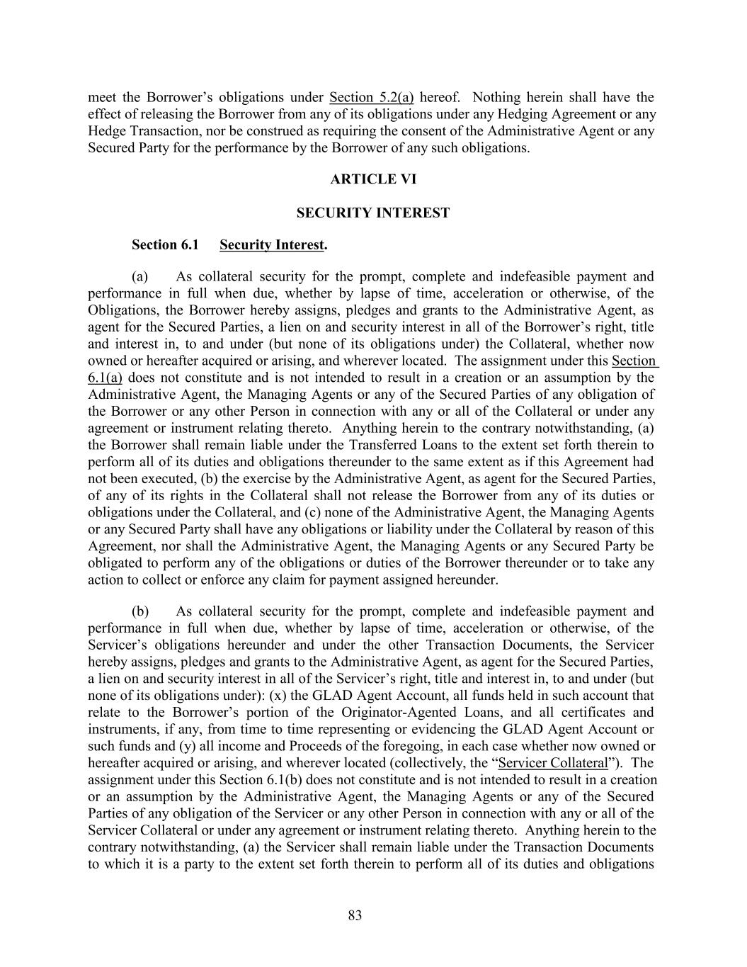 meet the Borrower’s obligations under Section 5.2(a) hereof. Nothing herein shall have the effect of releasing the Borrower from any of its obligations under any Hedging Agreement or any Hedge Transaction, nor be construed as requiring the consent of the Administrative Agent or any Secured Party for the performance by the Borrower of any such obligations. ARTICLE VI SECURITY INTEREST Section 6.1 Security Interest. (a) As collateral security for the prompt, complete and indefeasible payment and performance in full when due, whether by lapse of time, acceleration or otherwise, of the Obligations, the Borrower hereby assigns, pledges and grants to the Administrative Agent, as agent for the Secured Parties, a lien on and security interest in all of the Borrower’s right, title and interest in, to and under (but none of its obligations under) the Collateral, whether now owned or hereafter acquired or arising, and wherever located. The assignment under this Section 6.1(a) does not constitute and is not intended to result in a creation or an assumption by the Administrative Agent, the Managing Agents or any of the Secured Parties of any obligation of the Borrower or any other Person in connection with any or all of the Collateral or under any agreement or instrument relating thereto. Anything herein to the contrary notwithstanding, (a) the Borrower shall remain liable under the Transferred Loans to the extent set forth therein to perform all of its duties and obligations thereunder to the same extent as if this Agreement had not been executed, (b) the exercise by the Administrative Agent, as agent for the Secured Parties, of any of its rights in the Collateral shall not release the Borrower from any of its duties or obligations under the Collateral, and (c) none of the Administrative Agent, the Managing Agents or any Secured Party shall have any obligations or liability under the Collateral by reason of this Agreement, nor shall the Administrative Agent, the Managing Agents or any Secured Party be obligated to perform any of the obligations or duties of the Borrower thereunder or to take any action to collect or enforce any claim for payment assigned hereunder. (b) As collateral security for the prompt, complete and indefeasible payment and performance in full when due, whether by lapse of time, acceleration or otherwise, of the Servicer’s obligations hereunder and under the other Transaction Documents, the Servicer hereby assigns, pledges and grants to the Administrative Agent, as agent for the Secured Parties, a lien on and security interest in all of the Servicer’s right, title and interest in, to and under (but none of its obligations under): (x) the GLAD Agent Account, all funds held in such account that relate to the Borrower’s portion of the Originator-Agented Loans, and all certificates and instruments, if any, from time to time representing or evidencing the GLAD Agent Account or such funds and (y) all income and Proceeds of the foregoing, in each case whether now owned or hereafter acquired or arising, and wherever located (collectively, the “Servicer Collateral”). The assignment under this Section 6.1(b) does not constitute and is not intended to result in a creation or an assumption by the Administrative Agent, the Managing Agents or any of the Secured Parties of any obligation of the Servicer or any other Person in connection with any or all of the Servicer Collateral or under any agreement or instrument relating thereto. Anything herein to the contrary notwithstanding, (a) the Servicer shall remain liable under the Transaction Documents to which it is a party to the extent set forth therein to perform all of its duties and obligations 83