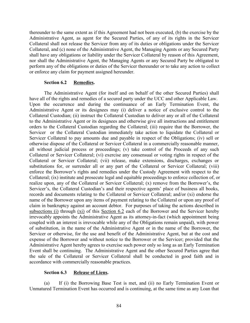 thereunder to the same extent as if this Agreement had not been executed, (b) the exercise by the Administrative Agent, as agent for the Secured Parties, of any of its rights in the Servicer Collateral shall not release the Servicer from any of its duties or obligations under the Servicer Collateral, and (c) none of the Administrative Agent, the Managing Agents or any Secured Party shall have any obligations or liability under the Servicer Collateral by reason of this Agreement, nor shall the Administrative Agent, the Managing Agents or any Secured Party be obligated to perform any of the obligations or duties of the Servicer thereunder or to take any action to collect or enforce any claim for payment assigned hereunder. Section 6.2 Remedies. The Administrative Agent (for itself and on behalf of the other Secured Parties) shall have all of the rights and remedies of a secured party under the UCC and other Applicable Law. Upon the occurrence and during the continuance of an Early Termination Event, the Administrative Agent or its designees may (i) deliver a notice of exclusive control to the Collateral Custodian; (ii) instruct the Collateral Custodian to deliver any or all of the Collateral to the Administrative Agent or its designees and otherwise give all instructions and entitlement orders to the Collateral Custodian regarding the Collateral; (iii) require that the Borrower, the Servicer or the Collateral Custodian immediately take action to liquidate the Collateral or Servicer Collateral to pay amounts due and payable in respect of the Obligations; (iv) sell or otherwise dispose of the Collateral or Servicer Collateral in a commercially reasonable manner, all without judicial process or proceedings; (v) take control of the Proceeds of any such Collateral or Servicer Collateral; (vi) exercise any consensual or voting rights in respect of the Collateral or Servicer Collateral; (vii) release, make extensions, discharges, exchanges or substitutions for, or surrender all or any part of the Collateral or Servicer Collateral; (viii) enforce the Borrower’s rights and remedies under the Custody Agreement with respect to the Collateral; (ix) institute and prosecute legal and equitable proceedings to enforce collection of, or realize upon, any of the Collateral or Servicer Collateral; (x) remove from the Borrower’s, the Servicer’s, the Collateral Custodian’s and their respective agents’ place of business all books, records and documents relating to the Collateral or Servicer Collateral; and/or (xi) endorse the name of the Borrower upon any items of payment relating to the Collateral or upon any proof of claim in bankruptcy against an account debtor. For purposes of taking the actions described in subsections (i) through (xi) of this Section 6.2 each of the Borrower and the Servicer hereby irrevocably appoints the Administrative Agent as its attorney-in-fact (which appointment being coupled with an interest is irrevocable while any of the Obligations remain unpaid), with power of substitution, in the name of the Administrative Agent or in the name of the Borrower, the Servicer or otherwise, for the use and benefit of the Administrative Agent, but at the cost and expense of the Borrower and without notice to the Borrower or the Servicer; provided that the Administrative Agent hereby agrees to exercise such power only so long as an Early Termination Event shall be continuing. The Administrative Agent and the other Secured Parties agree that the sale of the Collateral or Servicer Collateral shall be conducted in good faith and in accordance with commercially reasonable practices. Section 6.3 Release of Liens. (a) If (i) the Borrowing Base Test is met, and (ii) no Early Termination Event or Unmatured Termination Event has occurred and is continuing, at the same time as any Loan that 84