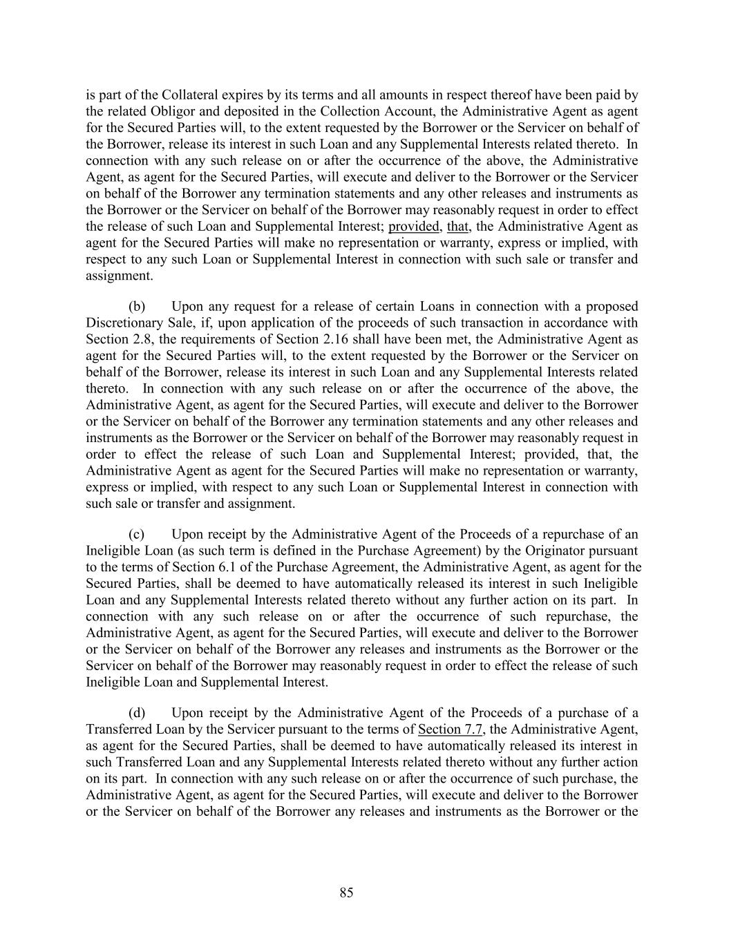 is part of the Collateral expires by its terms and all amounts in respect thereof have been paid by the related Obligor and deposited in the Collection Account, the Administrative Agent as agent for the Secured Parties will, to the extent requested by the Borrower or the Servicer on behalf of the Borrower, release its interest in such Loan and any Supplemental Interests related thereto. In connection with any such release on or after the occurrence of the above, the Administrative Agent, as agent for the Secured Parties, will execute and deliver to the Borrower or the Servicer on behalf of the Borrower any termination statements and any other releases and instruments as the Borrower or the Servicer on behalf of the Borrower may reasonably request in order to effect the release of such Loan and Supplemental Interest; provided, that, the Administrative Agent as agent for the Secured Parties will make no representation or warranty, express or implied, with respect to any such Loan or Supplemental Interest in connection with such sale or transfer and assignment. (b) Upon any request for a release of certain Loans in connection with a proposed Discretionary Sale, if, upon application of the proceeds of such transaction in accordance with Section 2.8, the requirements of Section 2.16 shall have been met, the Administrative Agent as agent for the Secured Parties will, to the extent requested by the Borrower or the Servicer on behalf of the Borrower, release its interest in such Loan and any Supplemental Interests related thereto. In connection with any such release on or after the occurrence of the above, the Administrative Agent, as agent for the Secured Parties, will execute and deliver to the Borrower or the Servicer on behalf of the Borrower any termination statements and any other releases and instruments as the Borrower or the Servicer on behalf of the Borrower may reasonably request in order to effect the release of such Loan and Supplemental Interest; provided, that, the Administrative Agent as agent for the Secured Parties will make no representation or warranty, express or implied, with respect to any such Loan or Supplemental Interest in connection with such sale or transfer and assignment. (c) Upon receipt by the Administrative Agent of the Proceeds of a repurchase of an Ineligible Loan (as such term is defined in the Purchase Agreement) by the Originator pursuant to the terms of Section 6.1 of the Purchase Agreement, the Administrative Agent, as agent for the Secured Parties, shall be deemed to have automatically released its interest in such Ineligible Loan and any Supplemental Interests related thereto without any further action on its part. In connection with any such release on or after the occurrence of such repurchase, the Administrative Agent, as agent for the Secured Parties, will execute and deliver to the Borrower or the Servicer on behalf of the Borrower any releases and instruments as the Borrower or the Servicer on behalf of the Borrower may reasonably request in order to effect the release of such Ineligible Loan and Supplemental Interest. (d) Upon receipt by the Administrative Agent of the Proceeds of a purchase of a Transferred Loan by the Servicer pursuant to the terms of Section 7.7, the Administrative Agent, as agent for the Secured Parties, shall be deemed to have automatically released its interest in such Transferred Loan and any Supplemental Interests related thereto without any further action on its part. In connection with any such release on or after the occurrence of such purchase, the Administrative Agent, as agent for the Secured Parties, will execute and deliver to the Borrower or the Servicer on behalf of the Borrower any releases and instruments as the Borrower or the 85