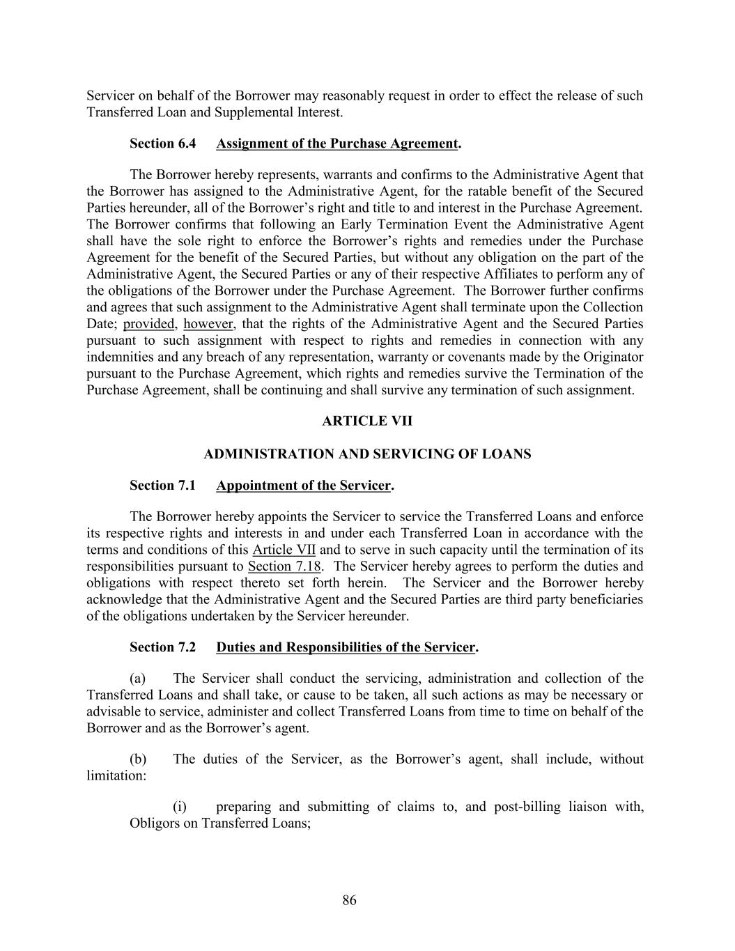 Servicer on behalf of the Borrower may reasonably request in order to effect the release of such Transferred Loan and Supplemental Interest. Section 6.4 Assignment of the Purchase Agreement. The Borrower hereby represents, warrants and confirms to the Administrative Agent that the Borrower has assigned to the Administrative Agent, for the ratable benefit of the Secured Parties hereunder, all of the Borrower’s right and title to and interest in the Purchase Agreement. The Borrower confirms that following an Early Termination Event the Administrative Agent shall have the sole right to enforce the Borrower’s rights and remedies under the Purchase Agreement for the benefit of the Secured Parties, but without any obligation on the part of the Administrative Agent, the Secured Parties or any of their respective Affiliates to perform any of the obligations of the Borrower under the Purchase Agreement. The Borrower further confirms and agrees that such assignment to the Administrative Agent shall terminate upon the Collection Date; provided, however, that the rights of the Administrative Agent and the Secured Parties pursuant to such assignment with respect to rights and remedies in connection with any indemnities and any breach of any representation, warranty or covenants made by the Originator pursuant to the Purchase Agreement, which rights and remedies survive the Termination of the Purchase Agreement, shall be continuing and shall survive any termination of such assignment. ARTICLE VII ADMINISTRATION AND SERVICING OF LOANS Section 7.1 Appointment of the Servicer. The Borrower hereby appoints the Servicer to service the Transferred Loans and enforce its respective rights and interests in and under each Transferred Loan in accordance with the terms and conditions of this Article VII and to serve in such capacity until the termination of its responsibilities pursuant to Section 7.18. The Servicer hereby agrees to perform the duties and obligations with respect thereto set forth herein. The Servicer and the Borrower hereby acknowledge that the Administrative Agent and the Secured Parties are third party beneficiaries of the obligations undertaken by the Servicer hereunder. Section 7.2 Duties and Responsibilities of the Servicer. (a) The Servicer shall conduct the servicing, administration and collection of the Transferred Loans and shall take, or cause to be taken, all such actions as may be necessary or advisable to service, administer and collect Transferred Loans from time to time on behalf of the Borrower and as the Borrower’s agent. (b) The duties of the Servicer, as the Borrower’s agent, shall include, without limitation: (i) preparing and submitting of claims to, and post-billing liaison with, Obligors on Transferred Loans; 86