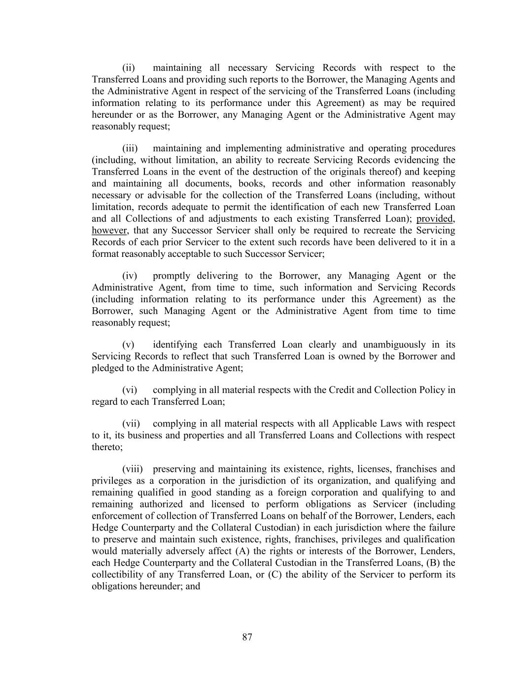(ii) maintaining all necessary Servicing Records with respect to the Transferred Loans and providing such reports to the Borrower, the Managing Agents and the Administrative Agent in respect of the servicing of the Transferred Loans (including information relating to its performance under this Agreement) as may be required hereunder or as the Borrower, any Managing Agent or the Administrative Agent may reasonably request; (iii) maintaining and implementing administrative and operating procedures (including, without limitation, an ability to recreate Servicing Records evidencing the Transferred Loans in the event of the destruction of the originals thereof) and keeping and maintaining all documents, books, records and other information reasonably necessary or advisable for the collection of the Transferred Loans (including, without limitation, records adequate to permit the identification of each new Transferred Loan and all Collections of and adjustments to each existing Transferred Loan); provided, however, that any Successor Servicer shall only be required to recreate the Servicing Records of each prior Servicer to the extent such records have been delivered to it in a format reasonably acceptable to such Successor Servicer; (iv) promptly delivering to the Borrower, any Managing Agent or the Administrative Agent, from time to time, such information and Servicing Records (including information relating to its performance under this Agreement) as the Borrower, such Managing Agent or the Administrative Agent from time to time reasonably request; (v) identifying each Transferred Loan clearly and unambiguously in its Servicing Records to reflect that such Transferred Loan is owned by the Borrower and pledged to the Administrative Agent; (vi) complying in all material respects with the Credit and Collection Policy in regard to each Transferred Loan; (vii) complying in all material respects with all Applicable Laws with respect to it, its business and properties and all Transferred Loans and Collections with respect thereto; (viii) preserving and maintaining its existence, rights, licenses, franchises and privileges as a corporation in the jurisdiction of its organization, and qualifying and remaining qualified in good standing as a foreign corporation and qualifying to and remaining authorized and licensed to perform obligations as Servicer (including enforcement of collection of Transferred Loans on behalf of the Borrower, Lenders, each Hedge Counterparty and the Collateral Custodian) in each jurisdiction where the failure to preserve and maintain such existence, rights, franchises, privileges and qualification would materially adversely affect (A) the rights or interests of the Borrower, Lenders, each Hedge Counterparty and the Collateral Custodian in the Transferred Loans, (B) the collectibility of any Transferred Loan, or (C) the ability of the Servicer to perform its obligations hereunder; and 87