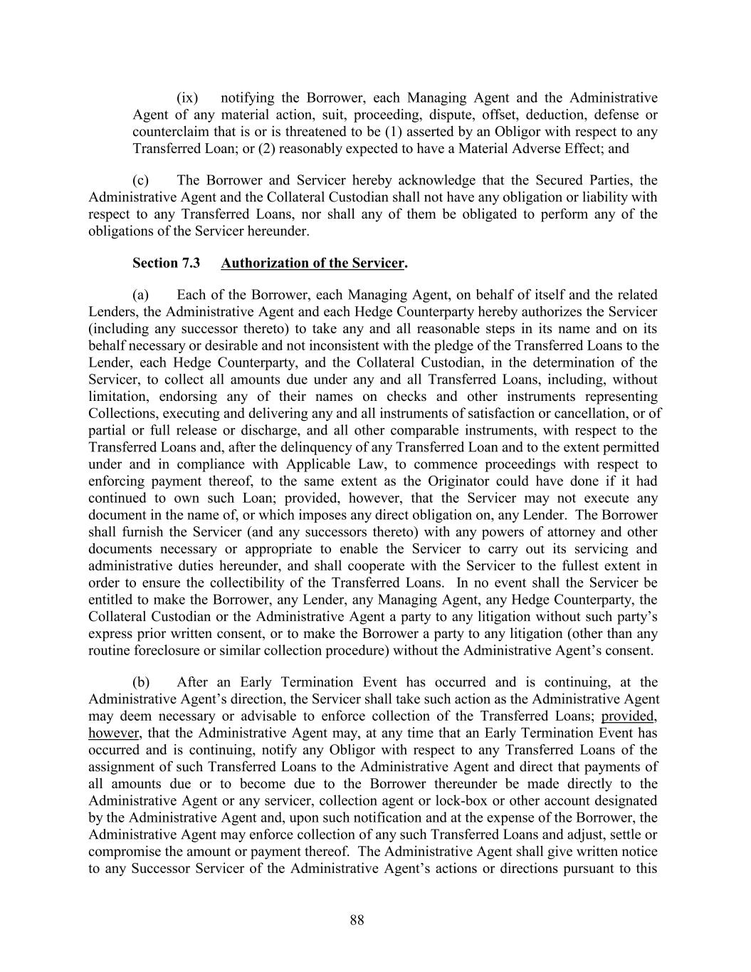 (ix) notifying the Borrower, each Managing Agent and the Administrative Agent of any material action, suit, proceeding, dispute, offset, deduction, defense or counterclaim that is or is threatened to be (1) asserted by an Obligor with respect to any Transferred Loan; or (2) reasonably expected to have a Material Adverse Effect; and (c) The Borrower and Servicer hereby acknowledge that the Secured Parties, the Administrative Agent and the Collateral Custodian shall not have any obligation or liability with respect to any Transferred Loans, nor shall any of them be obligated to perform any of the obligations of the Servicer hereunder. Section 7.3 Authorization of the Servicer. (a) Each of the Borrower, each Managing Agent, on behalf of itself and the related Lenders, the Administrative Agent and each Hedge Counterparty hereby authorizes the Servicer (including any successor thereto) to take any and all reasonable steps in its name and on its behalf necessary or desirable and not inconsistent with the pledge of the Transferred Loans to the Lender, each Hedge Counterparty, and the Collateral Custodian, in the determination of the Servicer, to collect all amounts due under any and all Transferred Loans, including, without limitation, endorsing any of their names on checks and other instruments representing Collections, executing and delivering any and all instruments of satisfaction or cancellation, or of partial or full release or discharge, and all other comparable instruments, with respect to the Transferred Loans and, after the delinquency of any Transferred Loan and to the extent permitted under and in compliance with Applicable Law, to commence proceedings with respect to enforcing payment thereof, to the same extent as the Originator could have done if it had continued to own such Loan; provided, however, that the Servicer may not execute any document in the name of, or which imposes any direct obligation on, any Lender. The Borrower shall furnish the Servicer (and any successors thereto) with any powers of attorney and other documents necessary or appropriate to enable the Servicer to carry out its servicing and administrative duties hereunder, and shall cooperate with the Servicer to the fullest extent in order to ensure the collectibility of the Transferred Loans. In no event shall the Servicer be entitled to make the Borrower, any Lender, any Managing Agent, any Hedge Counterparty, the Collateral Custodian or the Administrative Agent a party to any litigation without such party’s express prior written consent, or to make the Borrower a party to any litigation (other than any routine foreclosure or similar collection procedure) without the Administrative Agent’s consent. (b) After an Early Termination Event has occurred and is continuing, at the Administrative Agent’s direction, the Servicer shall take such action as the Administrative Agent may deem necessary or advisable to enforce collection of the Transferred Loans; provided, however, that the Administrative Agent may, at any time that an Early Termination Event has occurred and is continuing, notify any Obligor with respect to any Transferred Loans of the assignment of such Transferred Loans to the Administrative Agent and direct that payments of all amounts due or to become due to the Borrower thereunder be made directly to the Administrative Agent or any servicer, collection agent or lock-box or other account designated by the Administrative Agent and, upon such notification and at the expense of the Borrower, the Administrative Agent may enforce collection of any such Transferred Loans and adjust, settle or compromise the amount or payment thereof. The Administrative Agent shall give written notice to any Successor Servicer of the Administrative Agent’s actions or directions pursuant to this 88